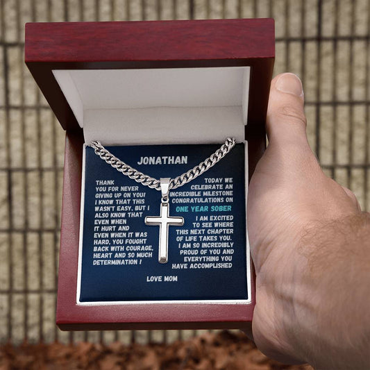 1-50 Year Sobriety Gift For Man ~ Engrave cross necklace with sobriety date or custom message and personalize image in gift box