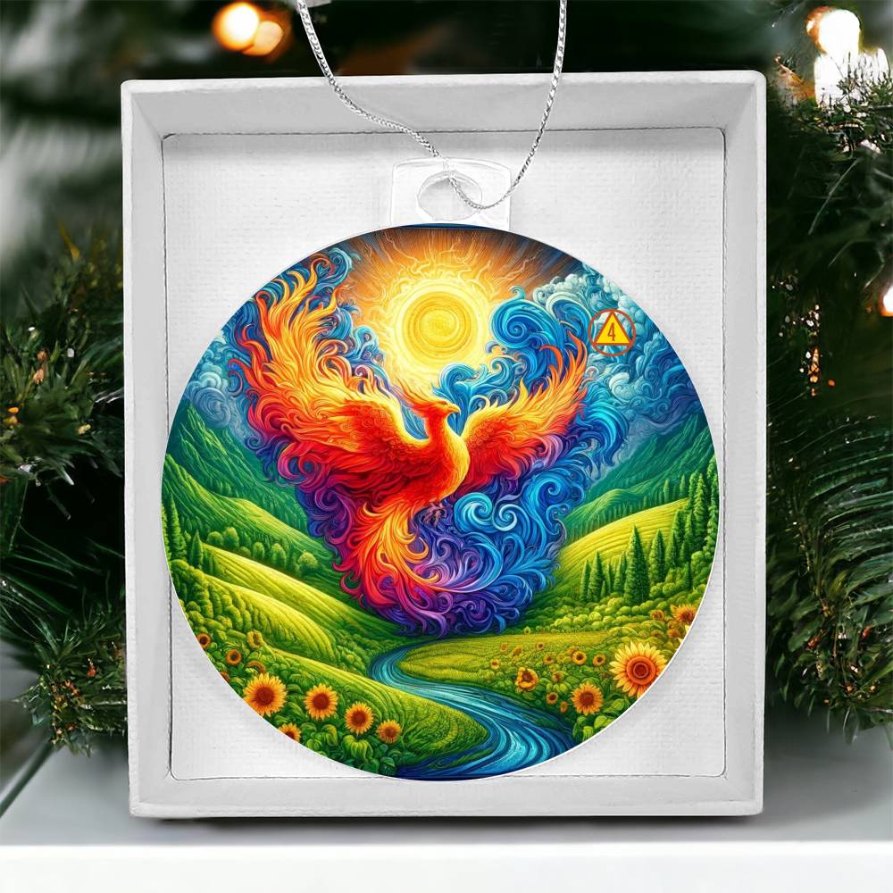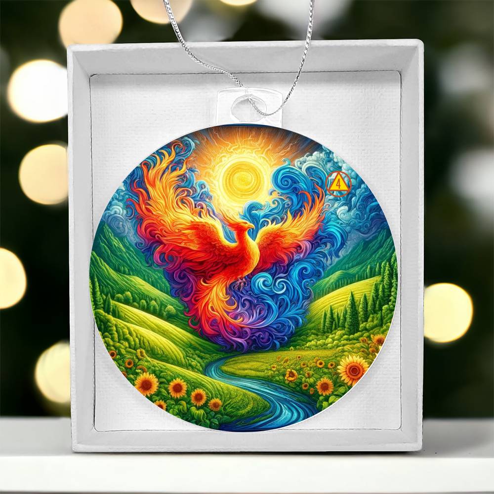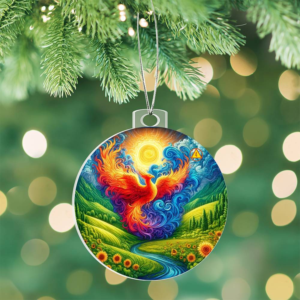 Celebrate Their Journey of Rebirth and Strength! This vibrant Phoenix Sobriety Ornament beautifully symbolizes the power of transformation, resilience, and the spirit of recovery. Featuring a radiant phoenix rising against a colorful landscape, this design is a powerful reminder of the strength it takes to rise anew. The year of sobriety is marked within the AA symbol, customizable to reflect their unique journey.