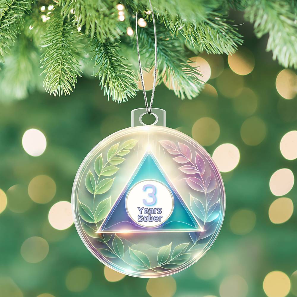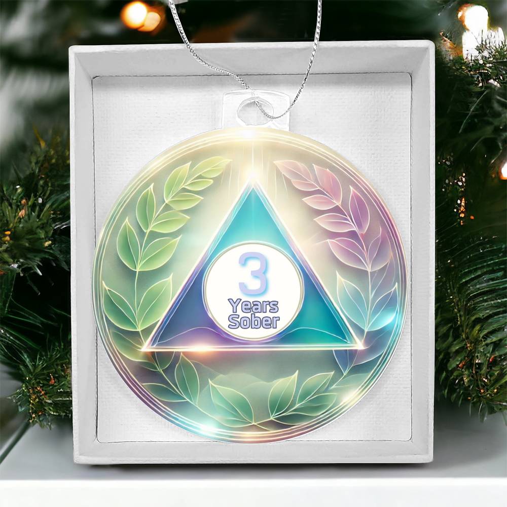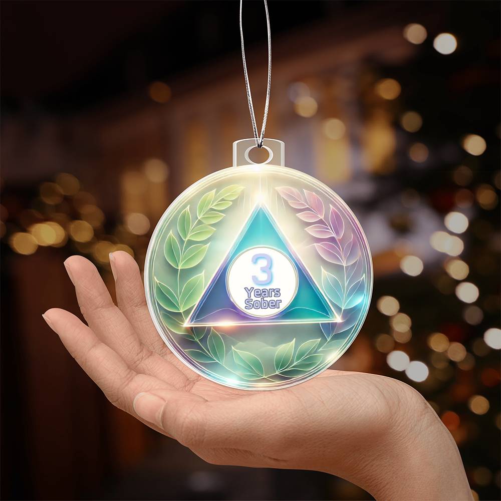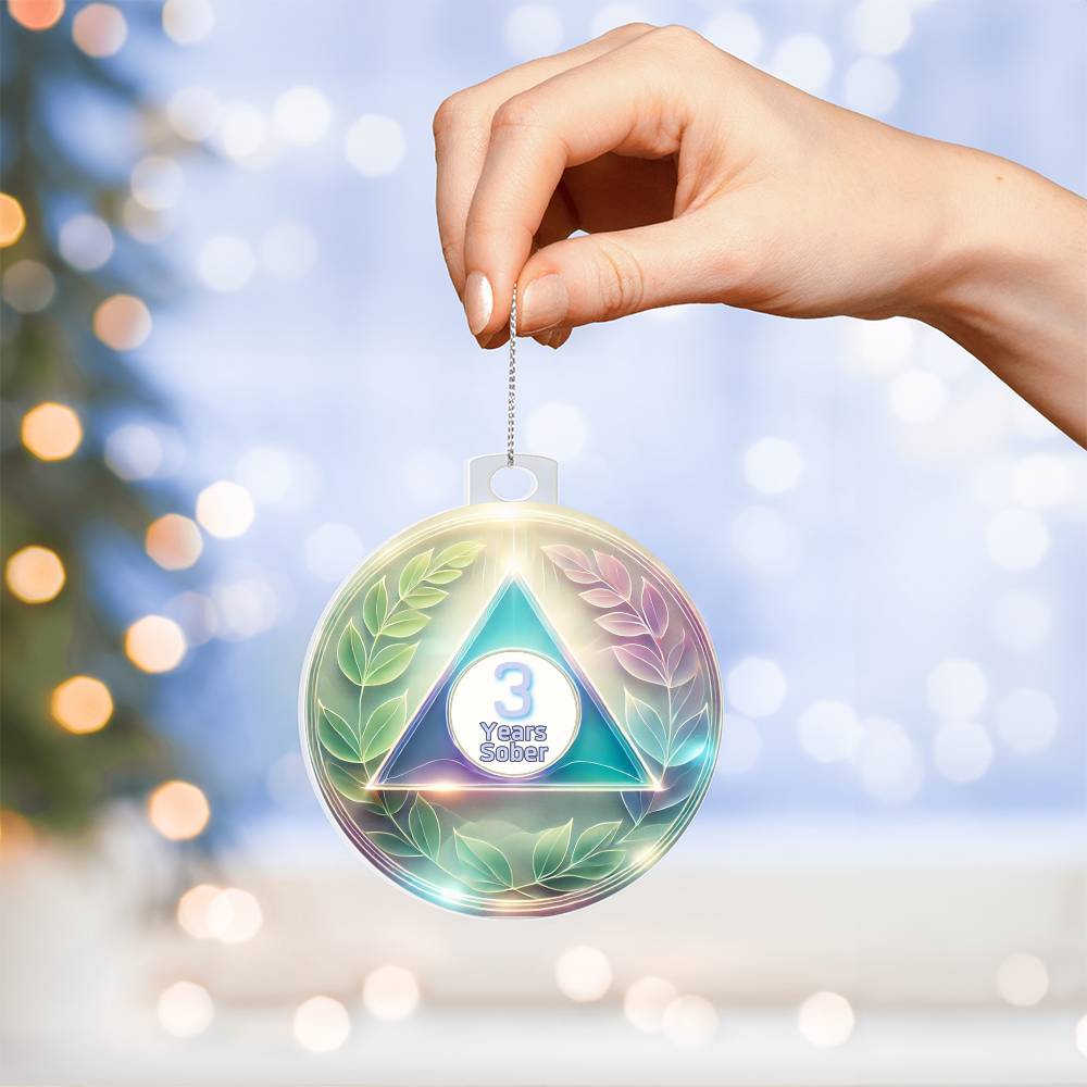 🌿 Front of the Ornament: Displays a tranquil, pastel-toned design with the words "3 Years Sober" within the AA triangle, customizable to any year or message that holds significance.