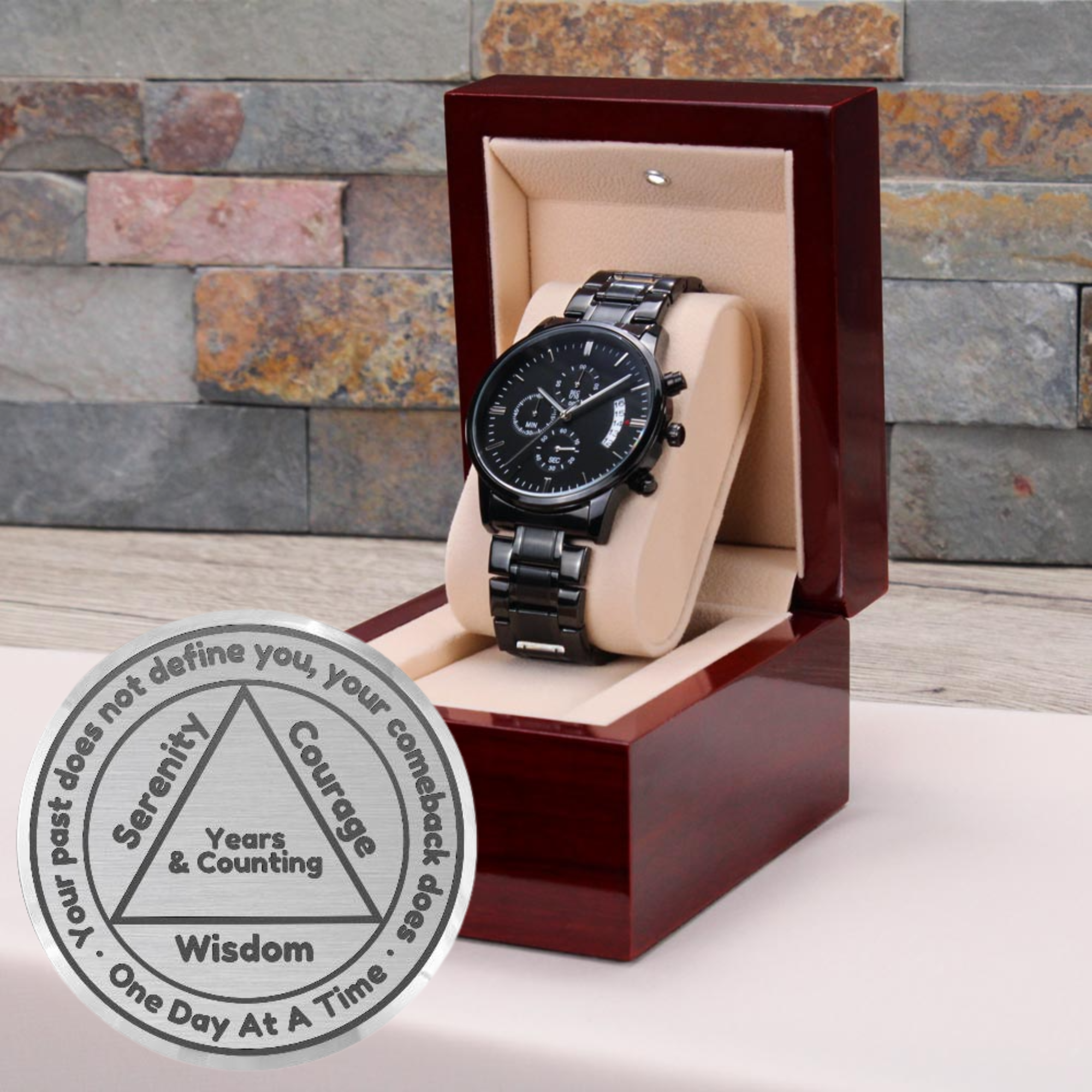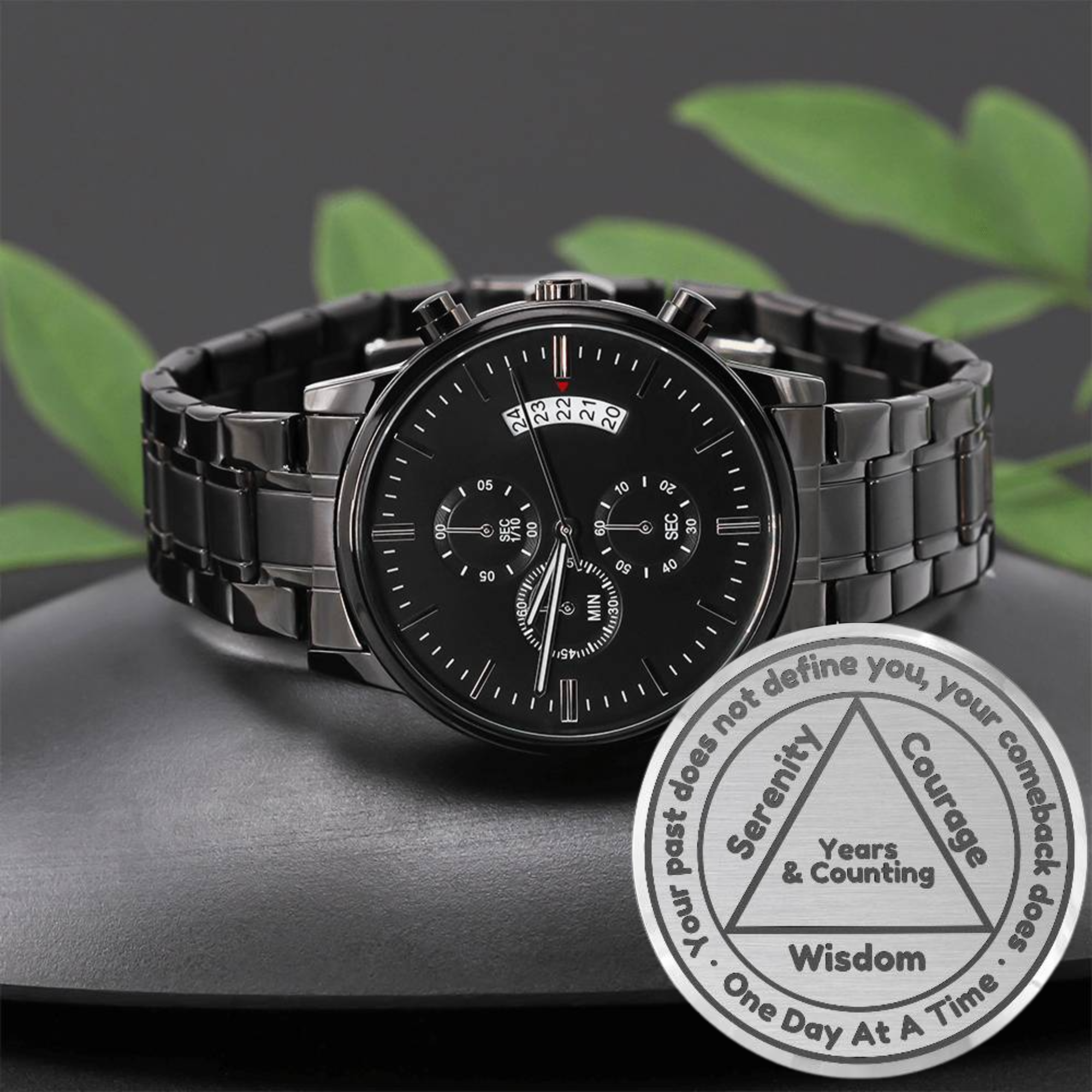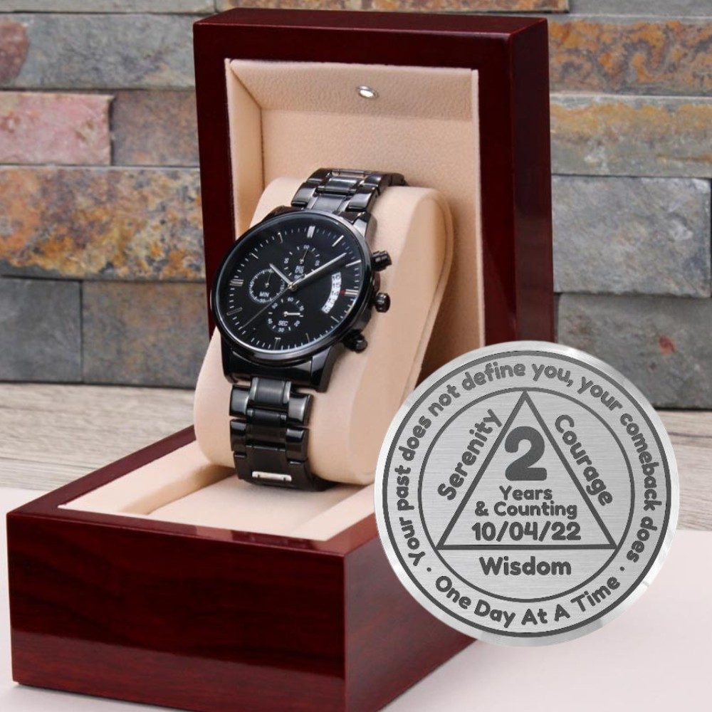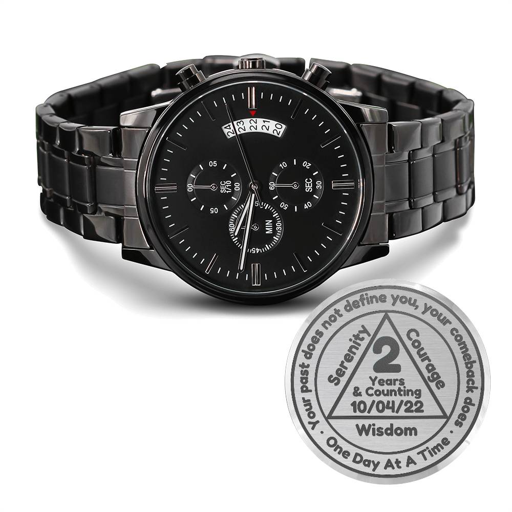 Honor the incredible commitment of someone special in your life with our Engraved Black Chronograph Watch—a powerful reminder of their strength and resilience. Featuring a bold AA symbol at its center, this watch is beautifully encircled by the inspiring message: “Your past does not define you, your comeback does. One day at a time.” Along the triangle's sides, the words “Serenity, Courage, Wisdom” reflect the values of recovery, while “3 Years and Counting” can be customized with their sobriety date for a personal touch.