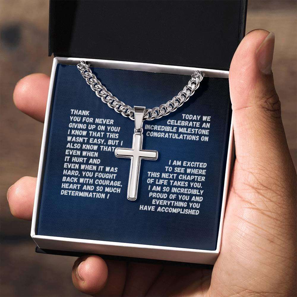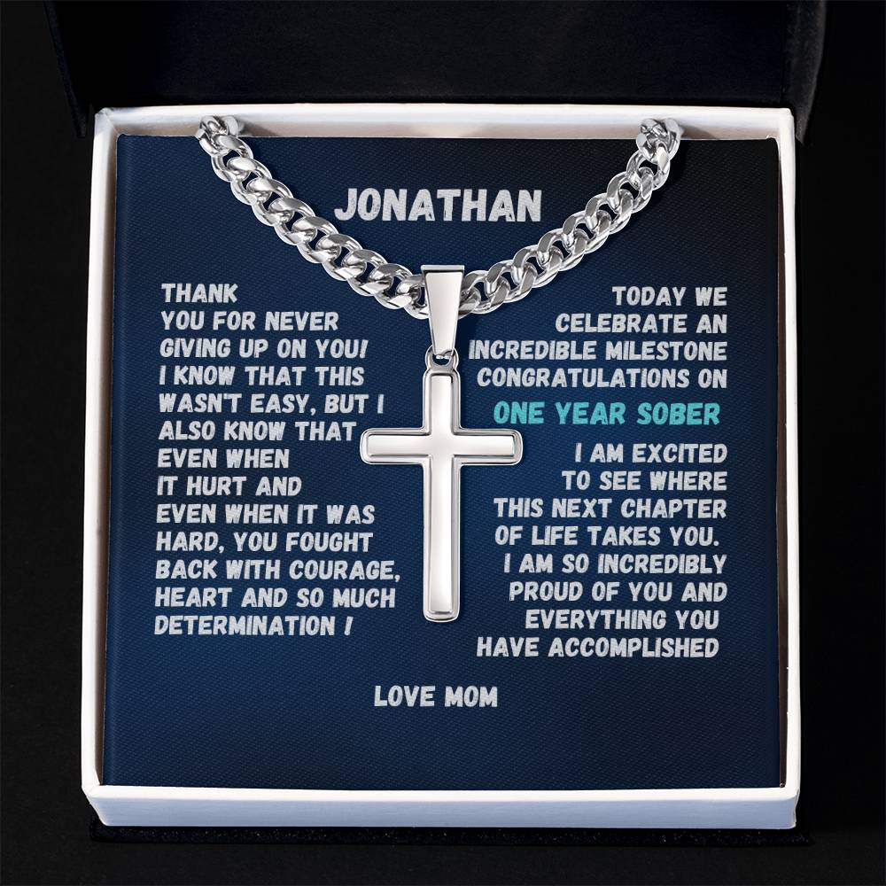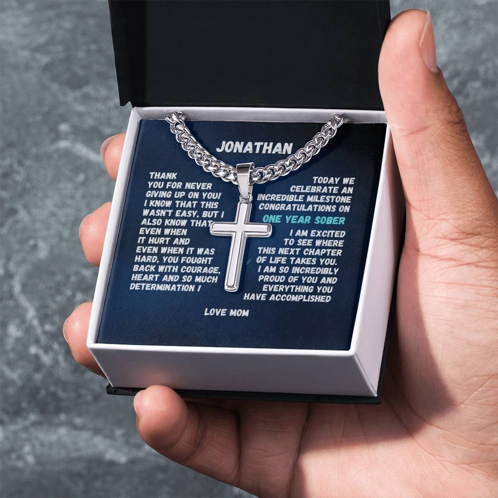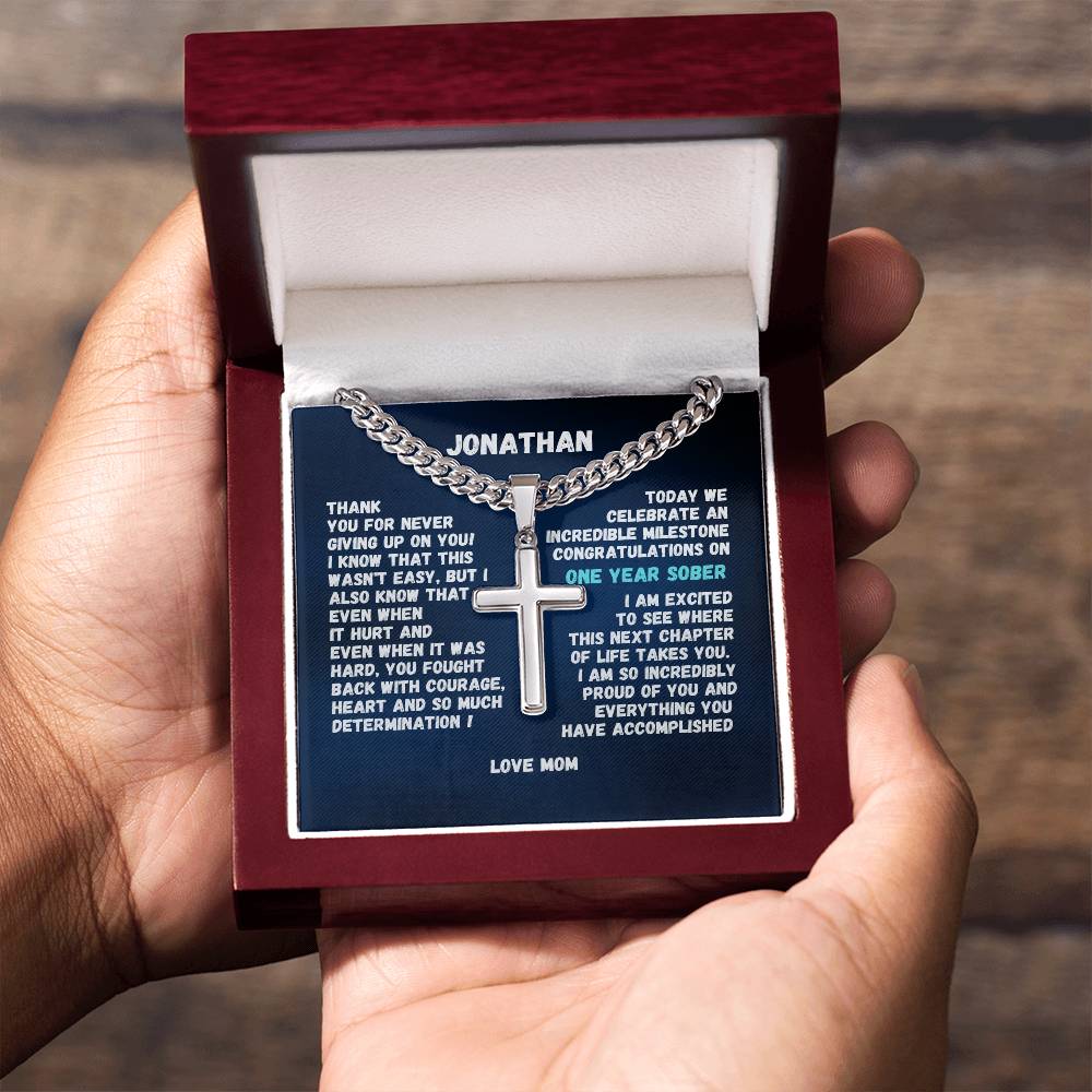 1-50 Year Sobriety Gift For Man ~ Engrave cross necklace with sobriety date or custom message and personalize image in gift box