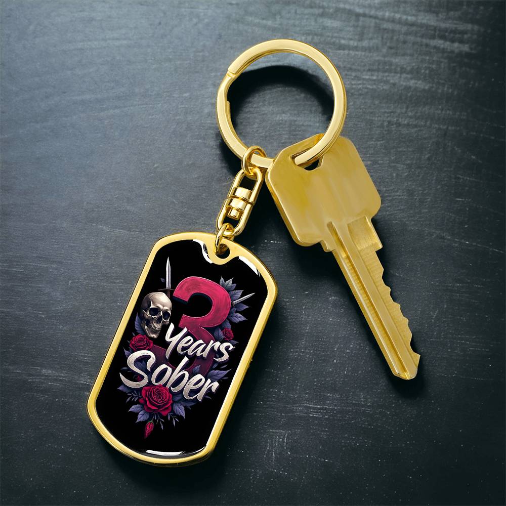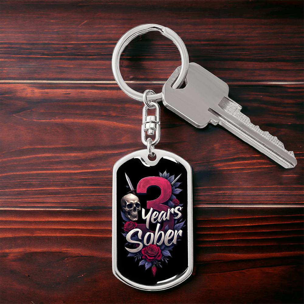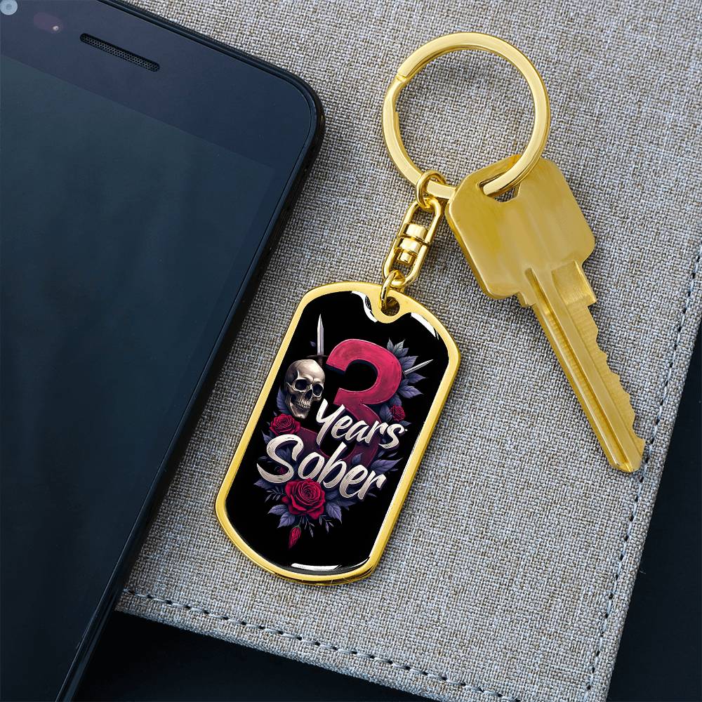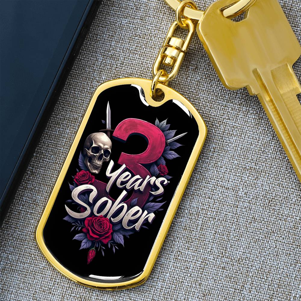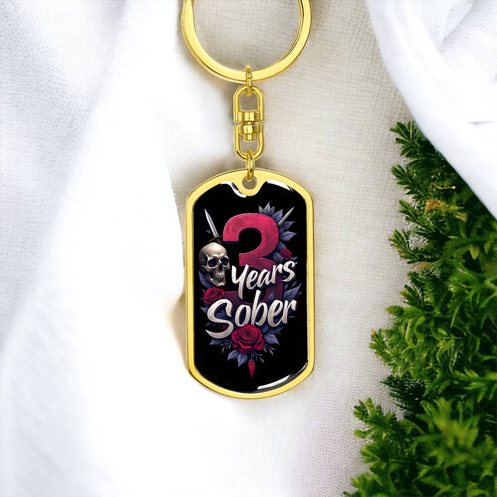 🔑 Front of the keychain: Displays "3 Years Sober" in bold typography, surrounded by an edgy design featuring skulls and roses—reflecting resilience and the beauty of transformation.