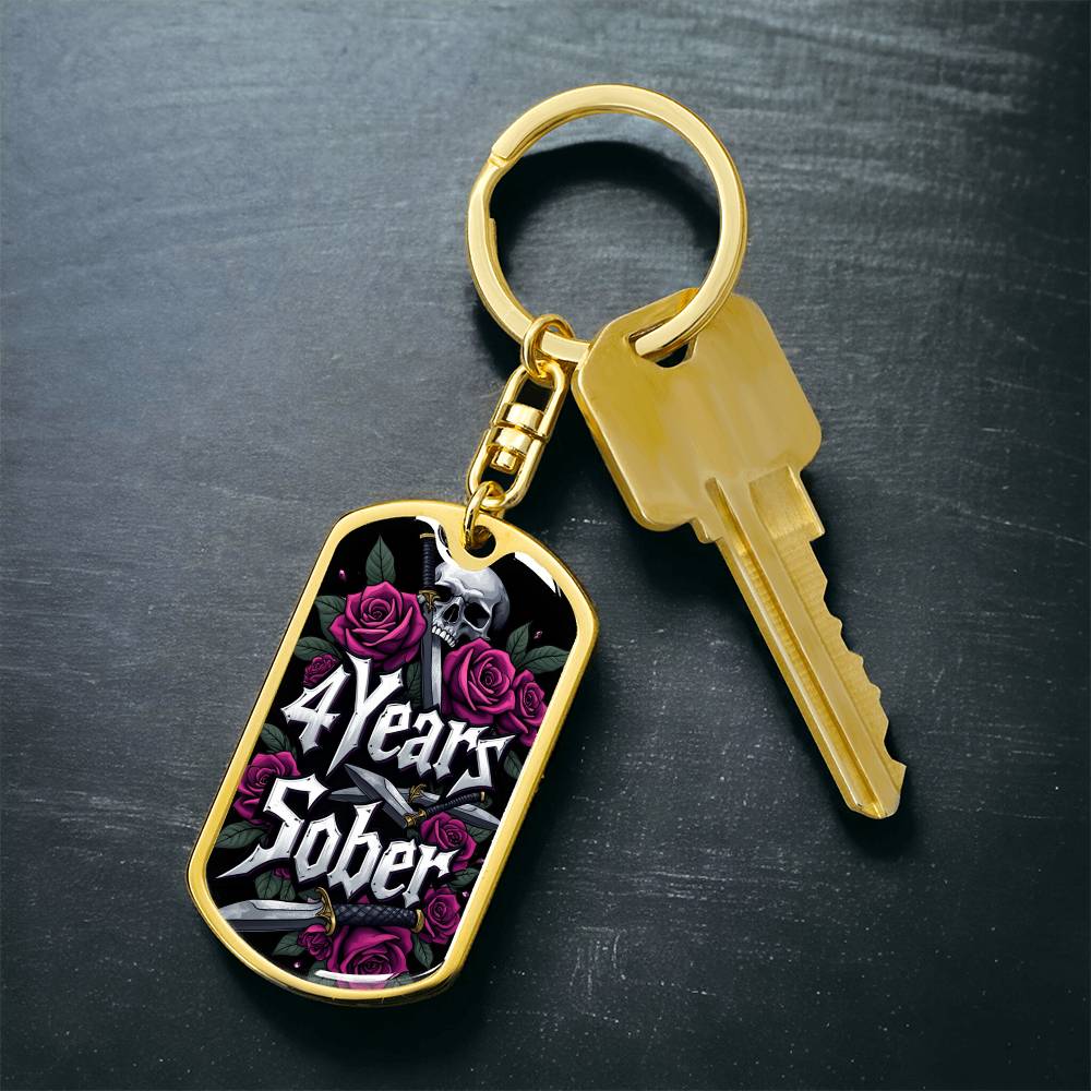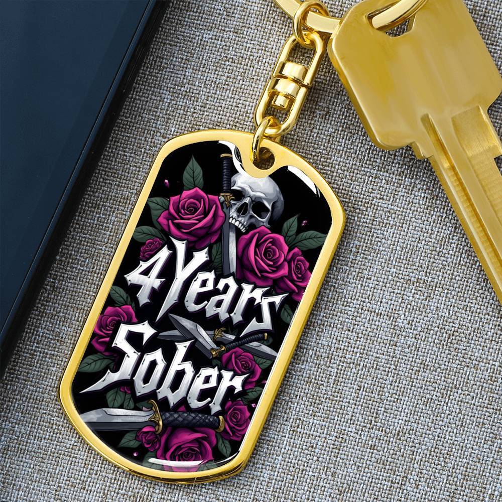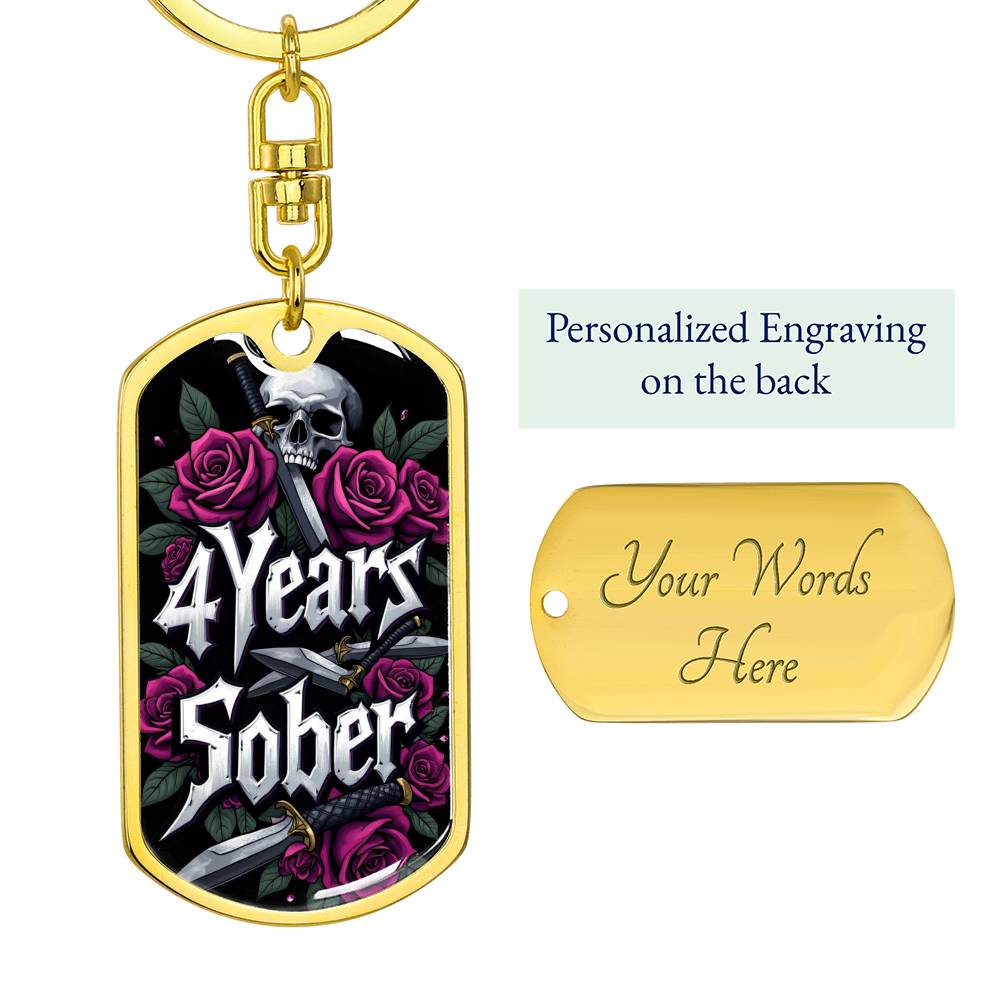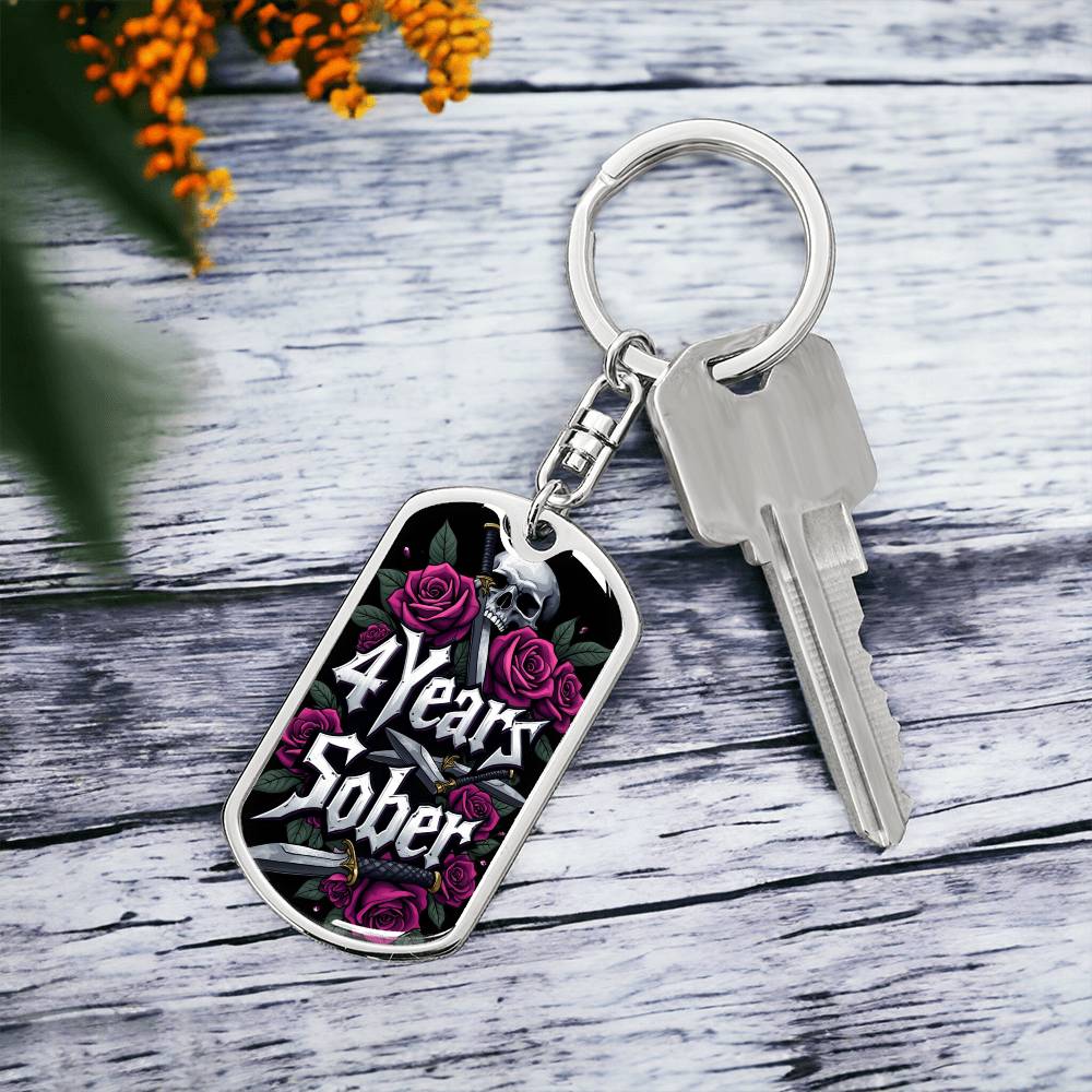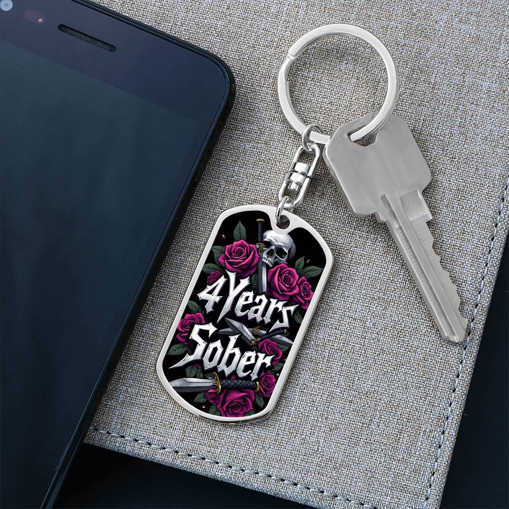 🔑 Front of the keychain: Features the bold inscription "4 Years Sober," beautifully adorned with skull and rose designs that reflect the powerful journey of recovery.