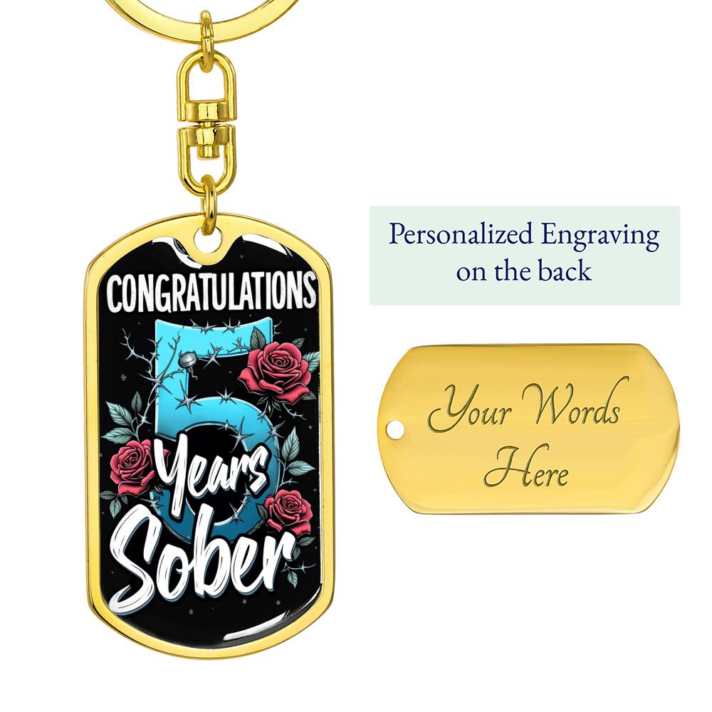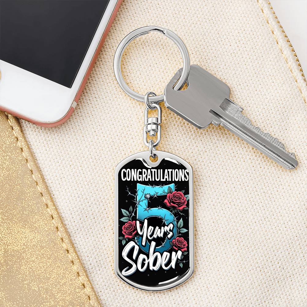 🔑 Front of the keychain: Features the phrase "Congratulations 5 Years Sober!" with a detailed design of intertwining roses and thorns, reflecting both the beauty and tenacity of the recovery journey.
