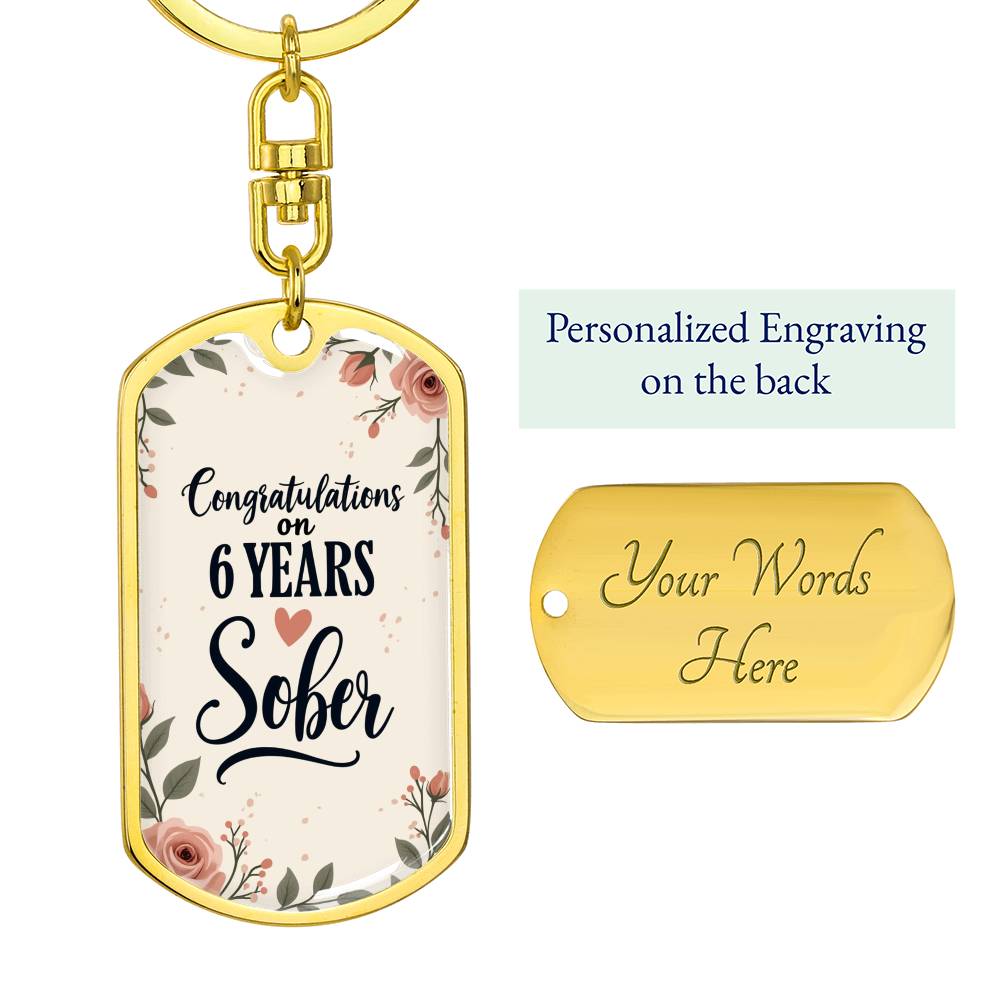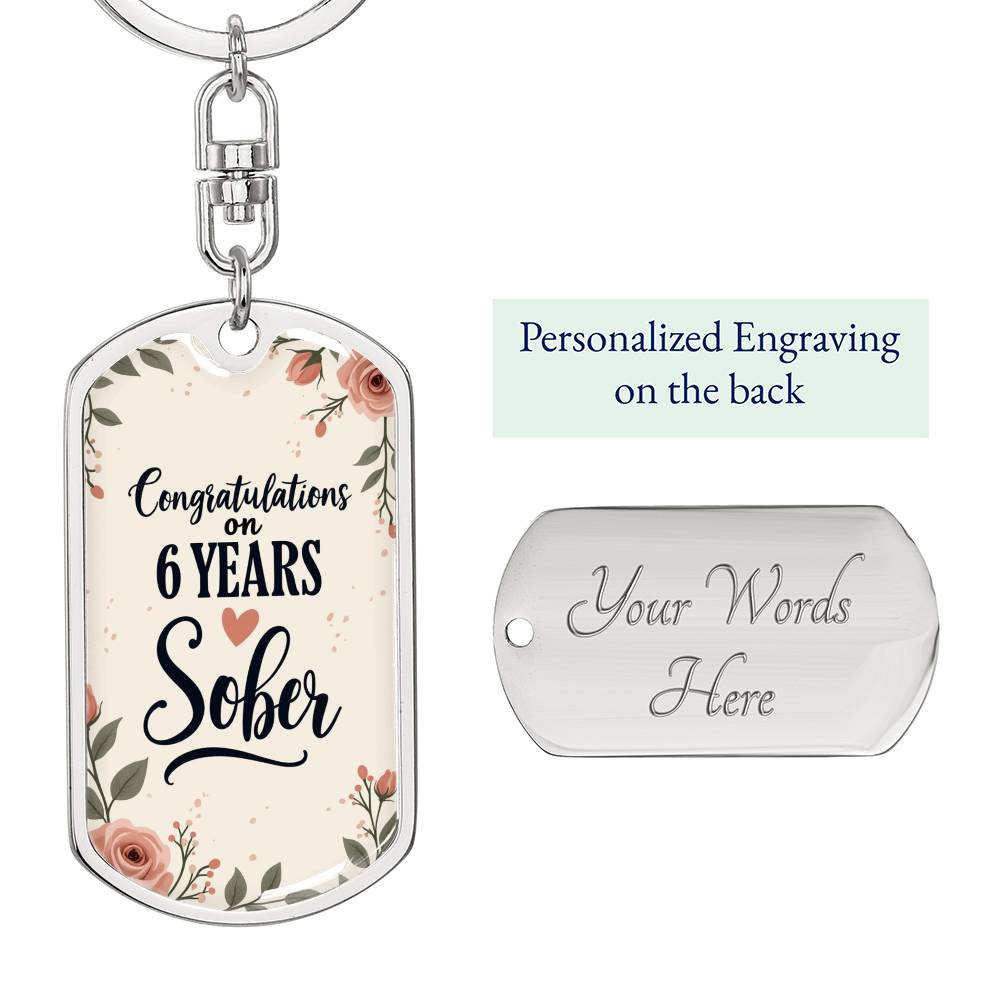 🔑 Front of the Keychain: Displays “Congratulations on 6 Years Sober” in a bold yet graceful style, complemented by delicate floral accents that reflect personal growth and strength.