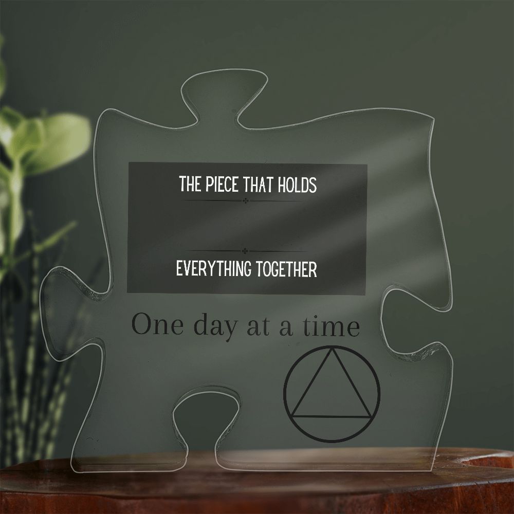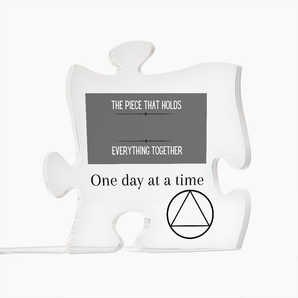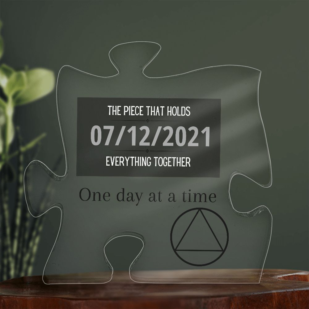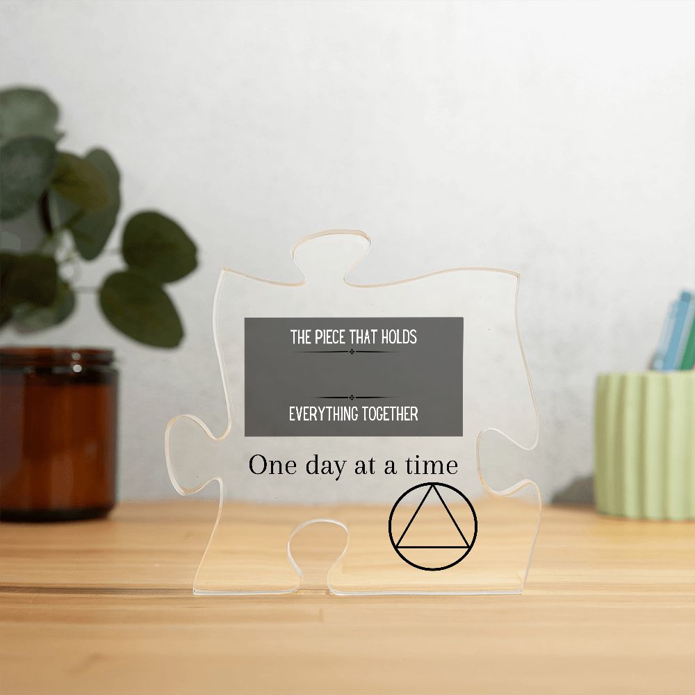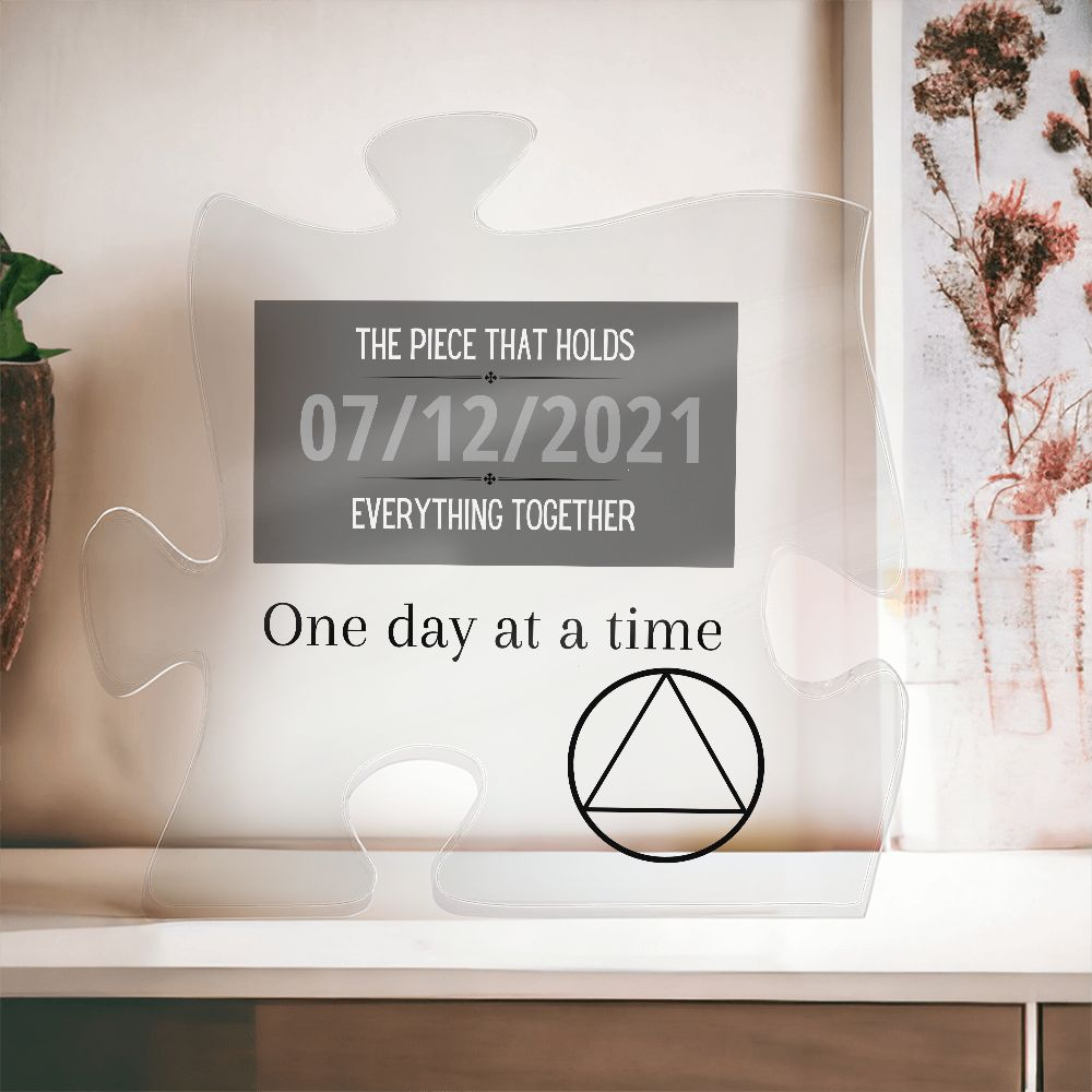 Celebrate the journey with this powerful acrylic puzzle piece—a symbol of the strength and resilience needed to bring everything together. Featuring the words ā€œThe Piece That Holds (Your Sobriety Date) It All Togetherā€ and ā€œOne Day at a Time,ā€ with a simple AA symbol in the corner, this keepsake captures the courage and determination it takes to walk the path of recovery.