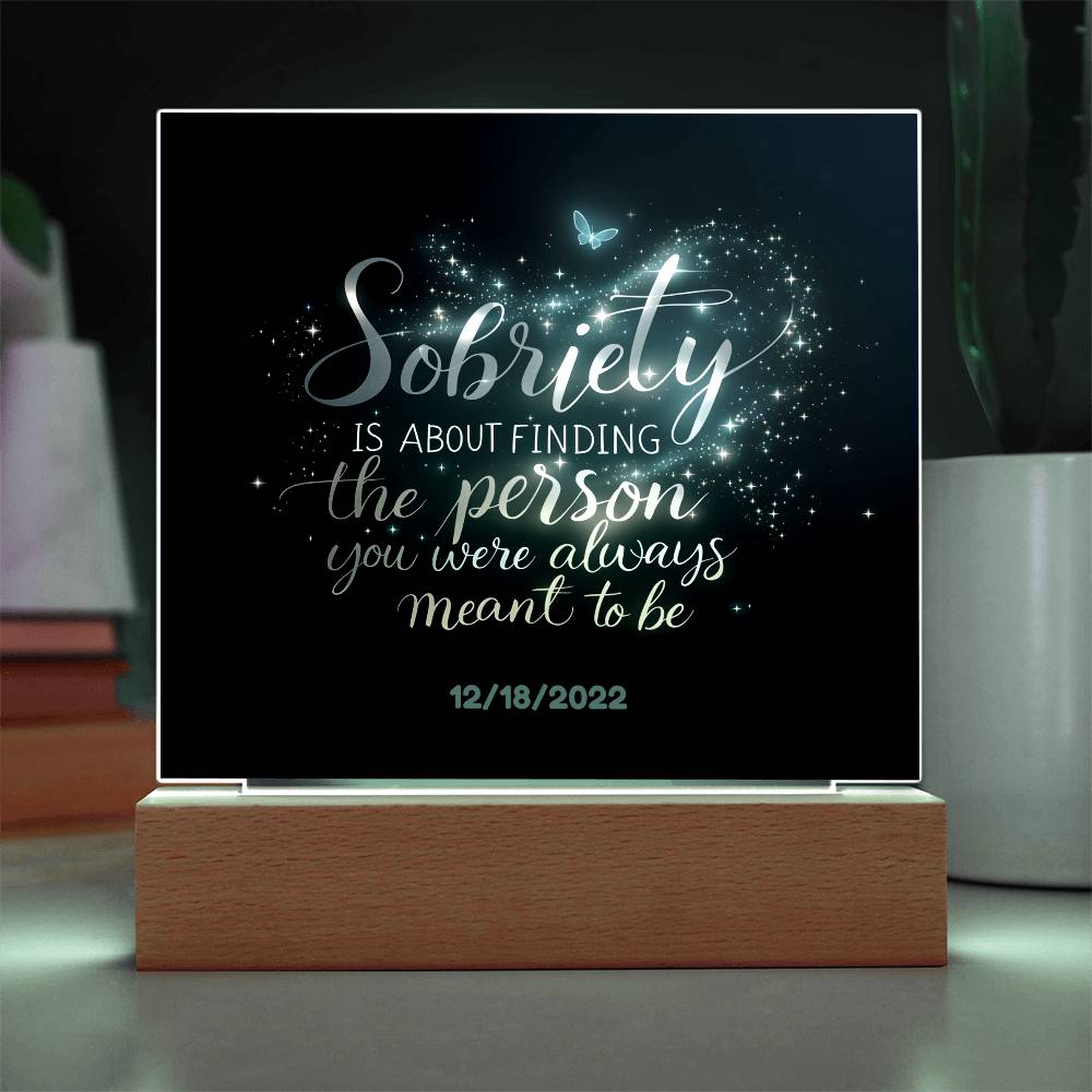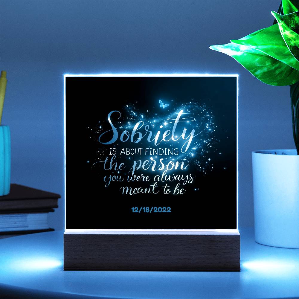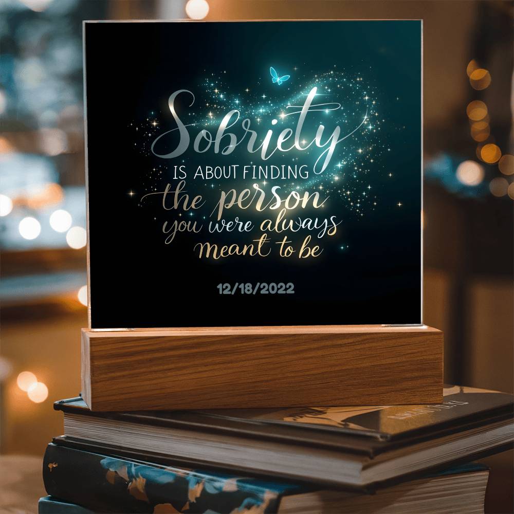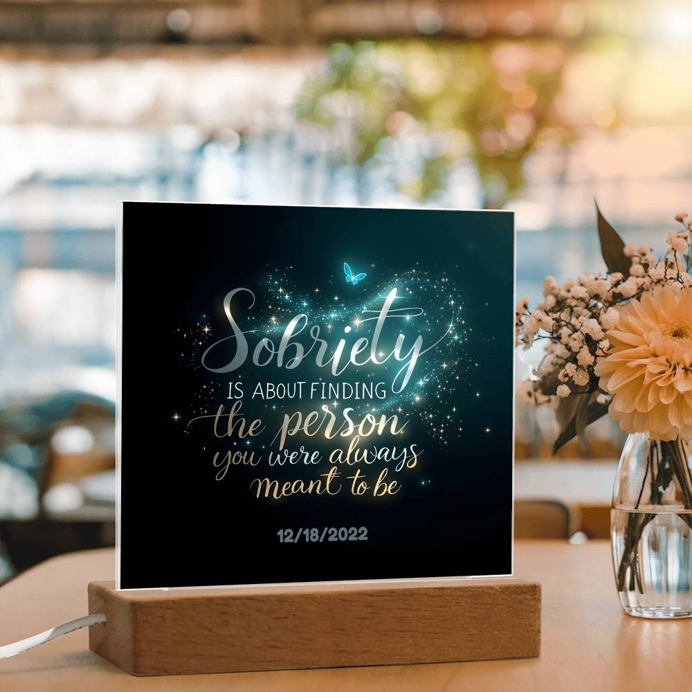 This stunning LED square acrylic plaque beautifully captures the transformative power of recovery. Featuring the heartfelt message, “Sobriety is about finding the person you were always meant to be” and a customizable sobriety date, this gift is a powerful reminder of strength, growth, and hope.