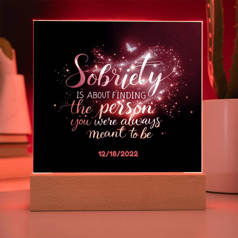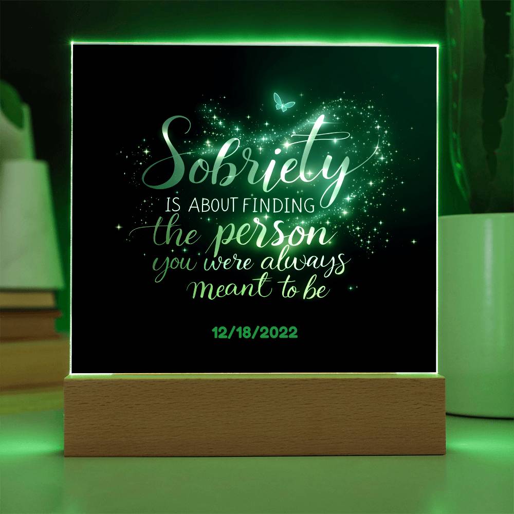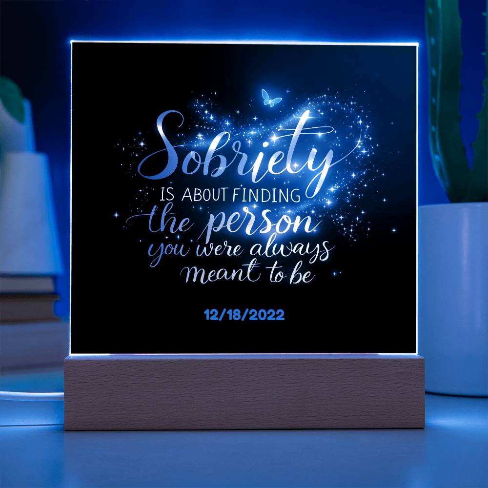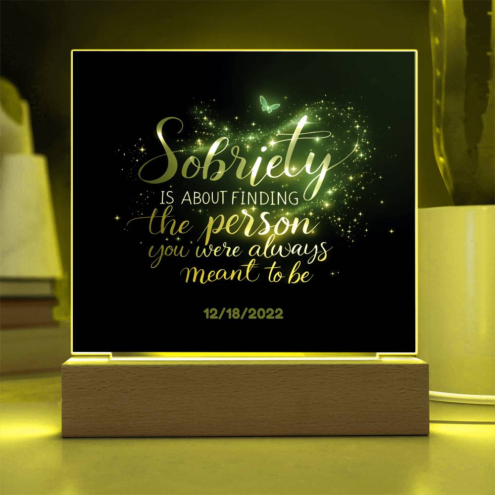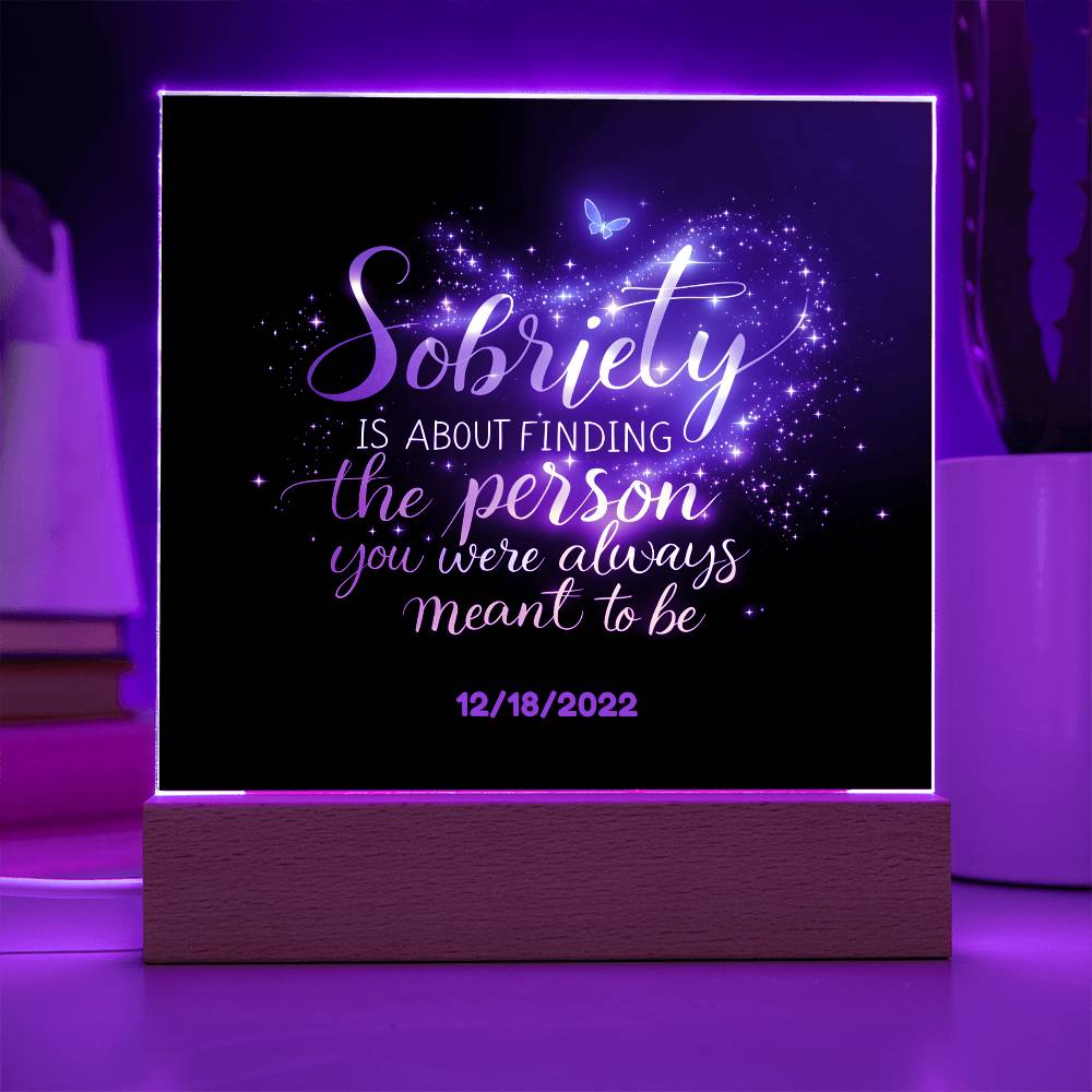 This stunning LED square acrylic plaque beautifully captures the transformative power of recovery. Featuring the heartfelt message, “Sobriety is about finding the person you were always meant to be” and a customizable sobriety date, this gift is a powerful reminder of strength, growth, and hope.
