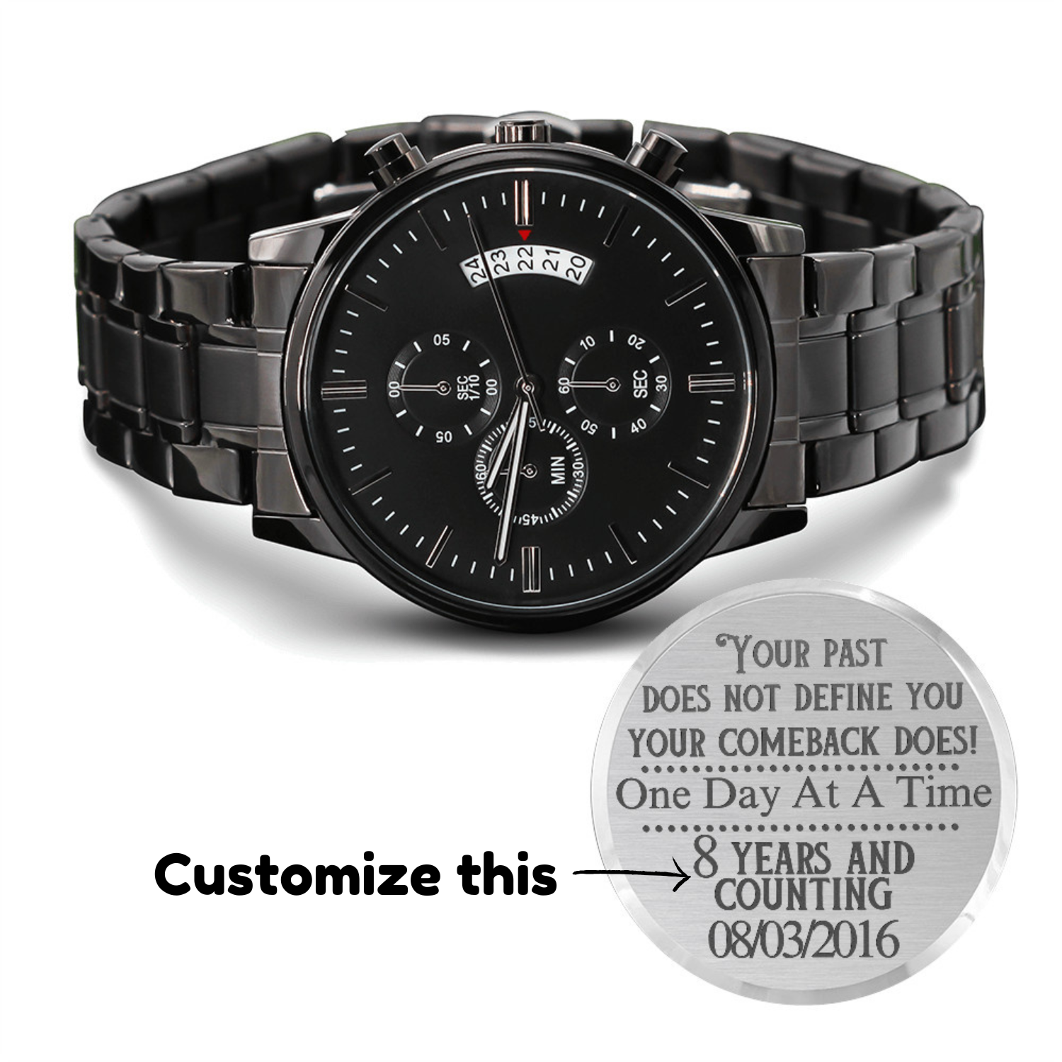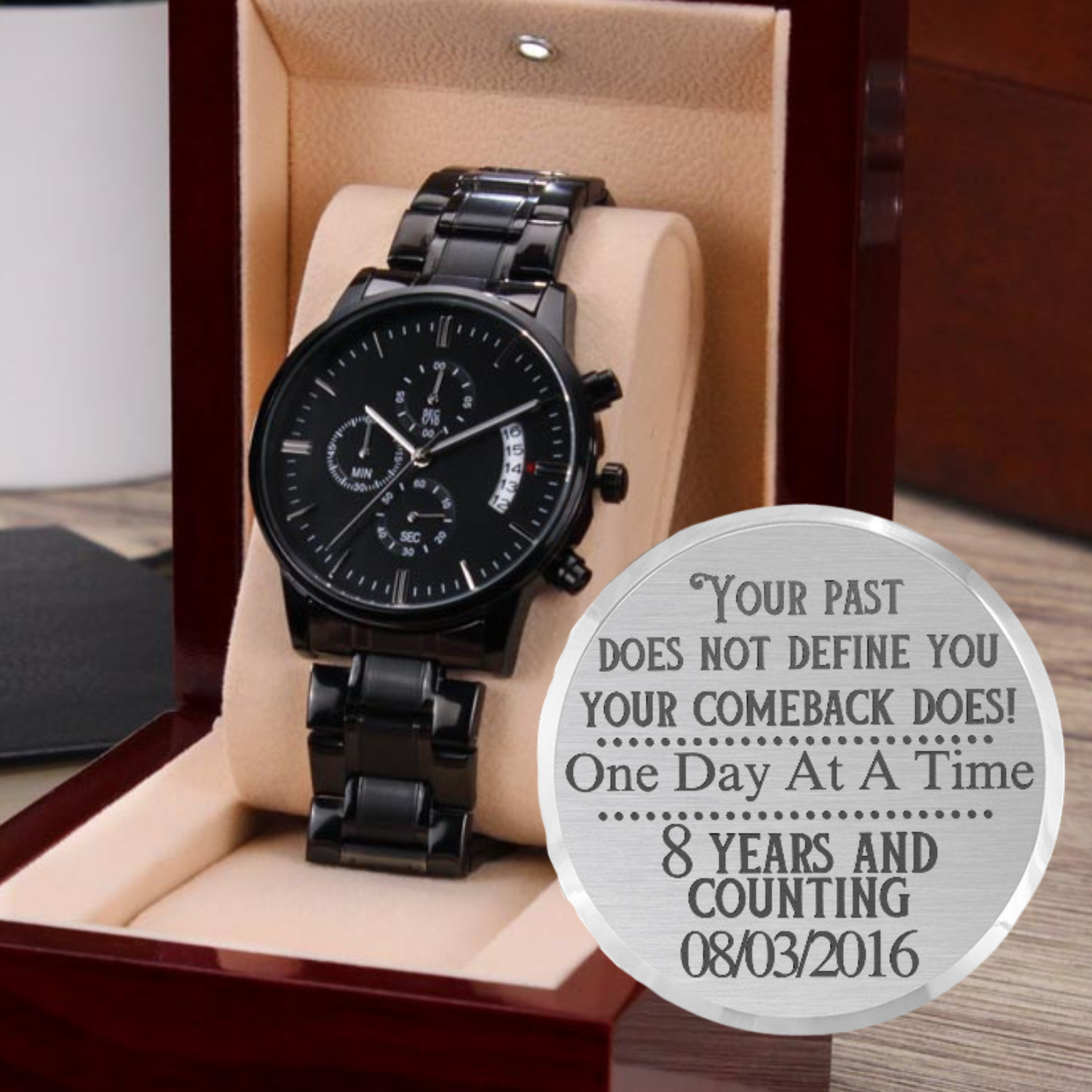 Celebrate strength, perseverance, and personal triumph with this custom sobriety milestone watch. A perfect blend of elegance and motivation, this sleek black chronograph timepiece serves as a daily reminder of resilience and commitment. Whether for yourself or a loved one, this watch is a symbol of progress and renewal—a stylish yet deeply meaningful way to honor sobriety. ⌚✨