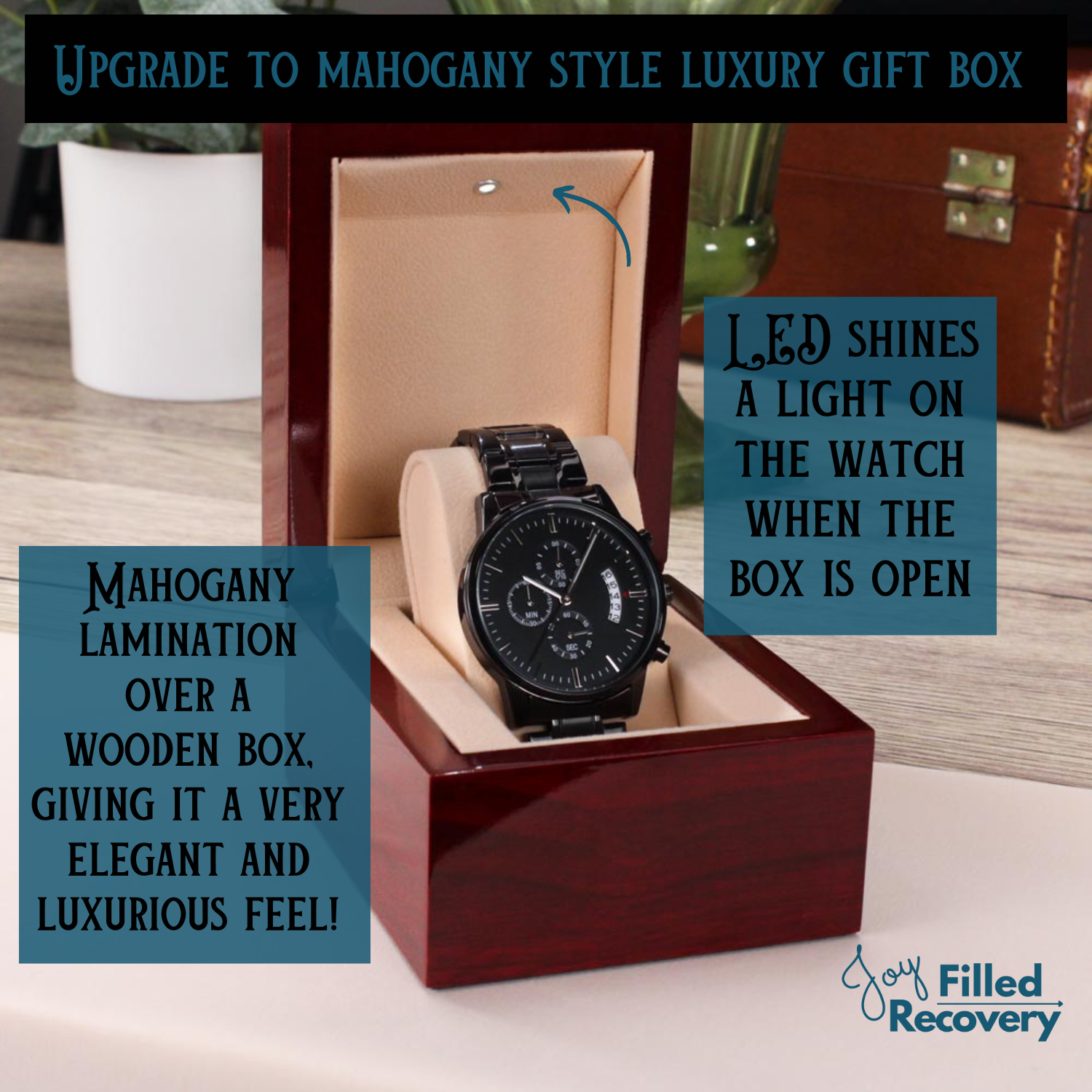 Perfect gift! The watch was amazing and the box that it came it was the perfect touch! Joy Filled Recovery helped me and worked with me through the issues I was having with the watch during the order process! Highly recommended