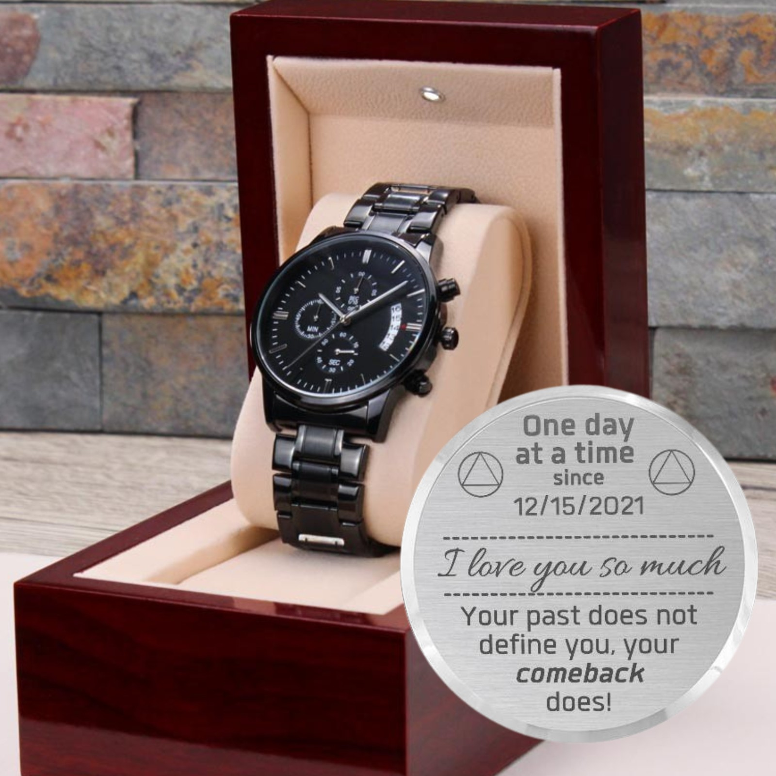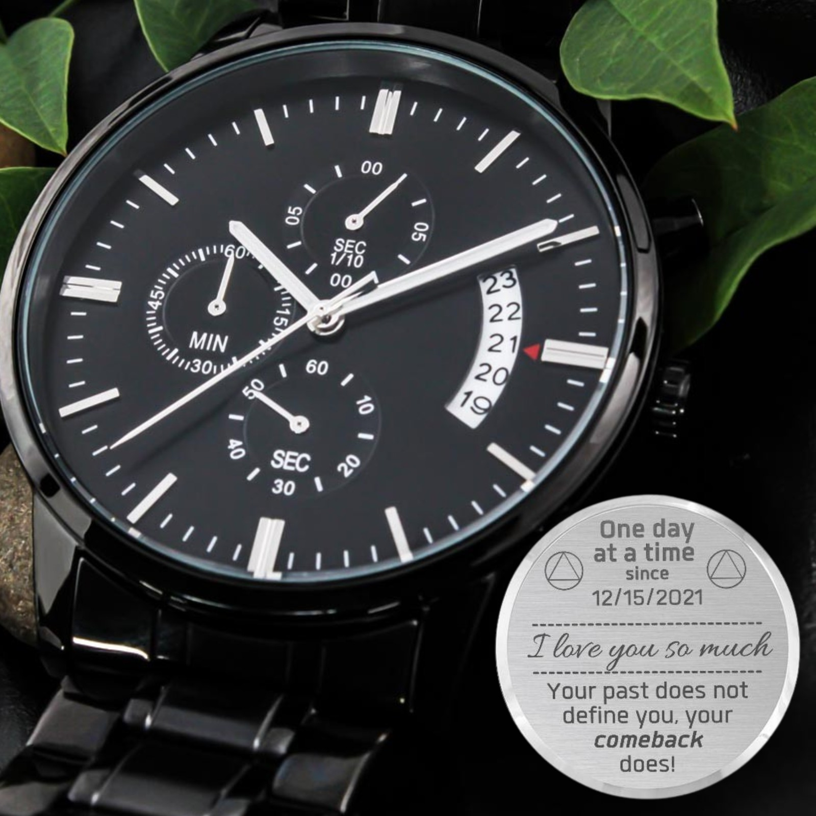 Honor your loved one's incredible journey with this Personalized Black Chronograph Watch, a perfect sobriety milestone gift. The sleek black design combined with the powerful engraved message makes this a cherished reminder of strength, resilience, and the commitment to recovery.