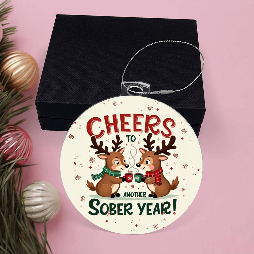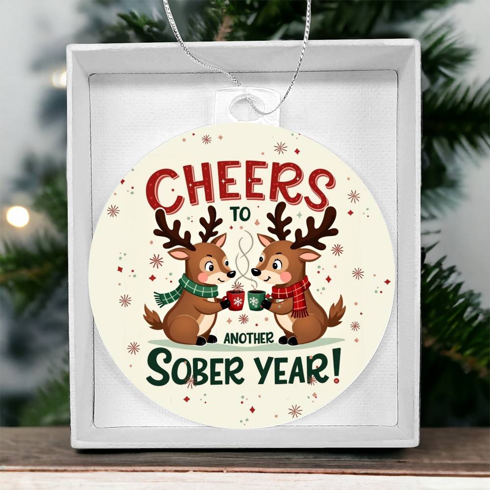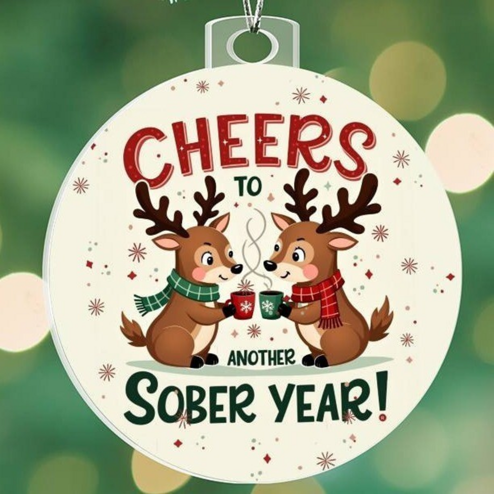 Celebrate the journey and resilience of someone who has embraced sobriety with this charming acrylic ornament. Featuring two festive reindeer toasting with hot cocoa, this design warmly commemorates the progress made in recovery, marking another successful sober year. Perfect for anyone continuing their recovery journey, this ornament brings encouragement and pride to the holiday season.