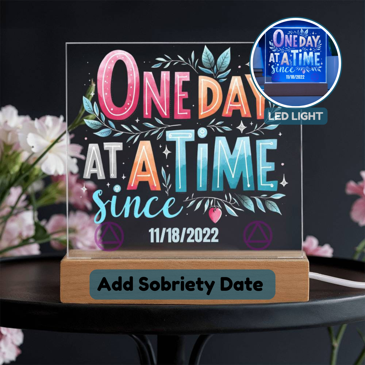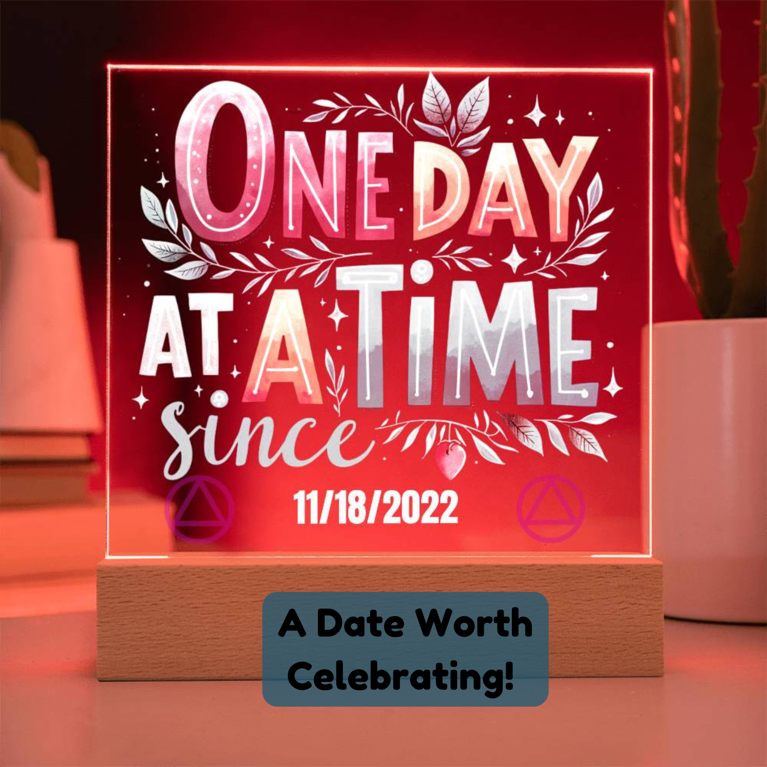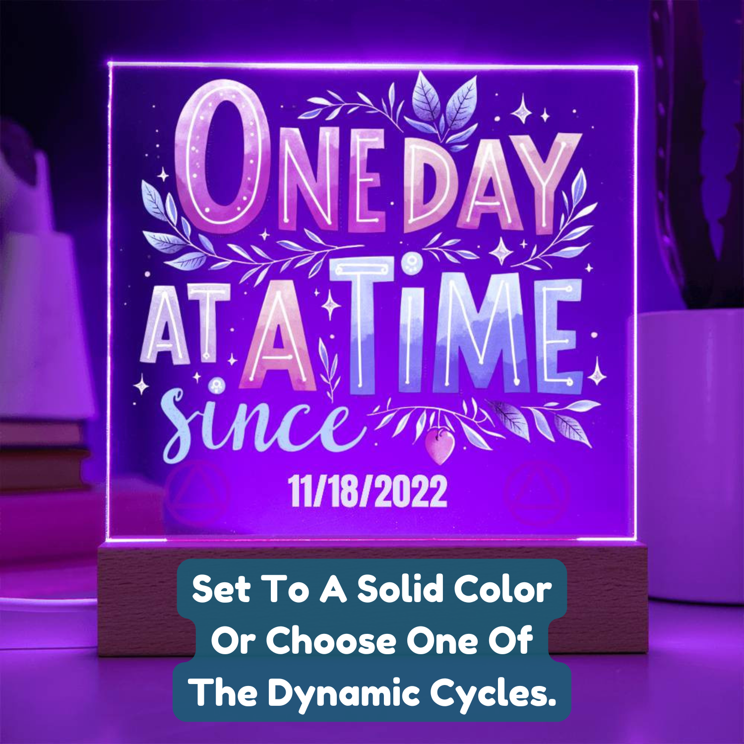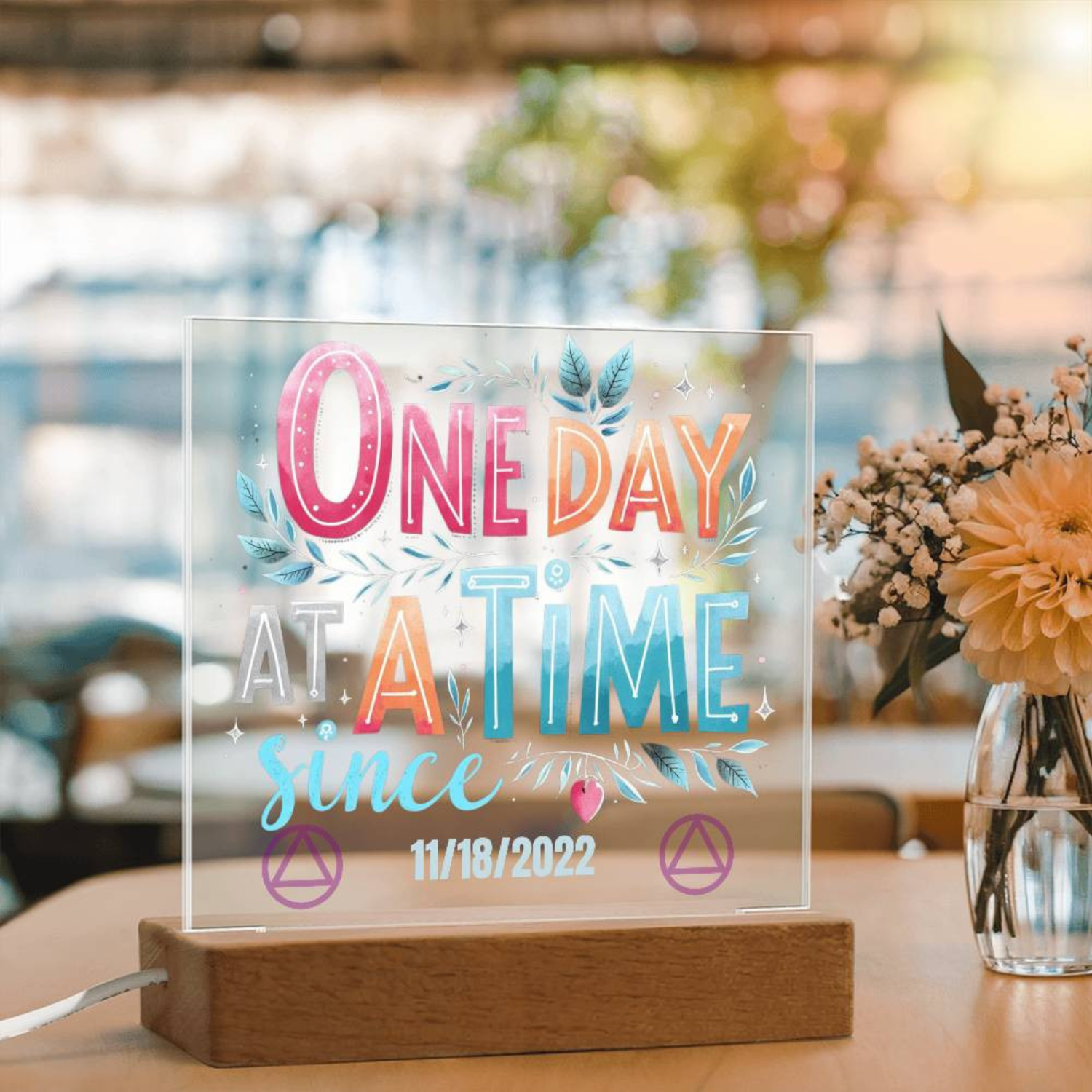 Celebrate the journey of sobriety in a bold, illuminating way! This stunning square acrylic plaque serves as a reminder of strength and perseverance, featuring the phrase "One Day at a Time" followed by your personalized sobriety date. The bold typography comes to life as the LED base cycles through 7 vibrant colors, transforming the plaque into a dynamic and eye-catching piece.