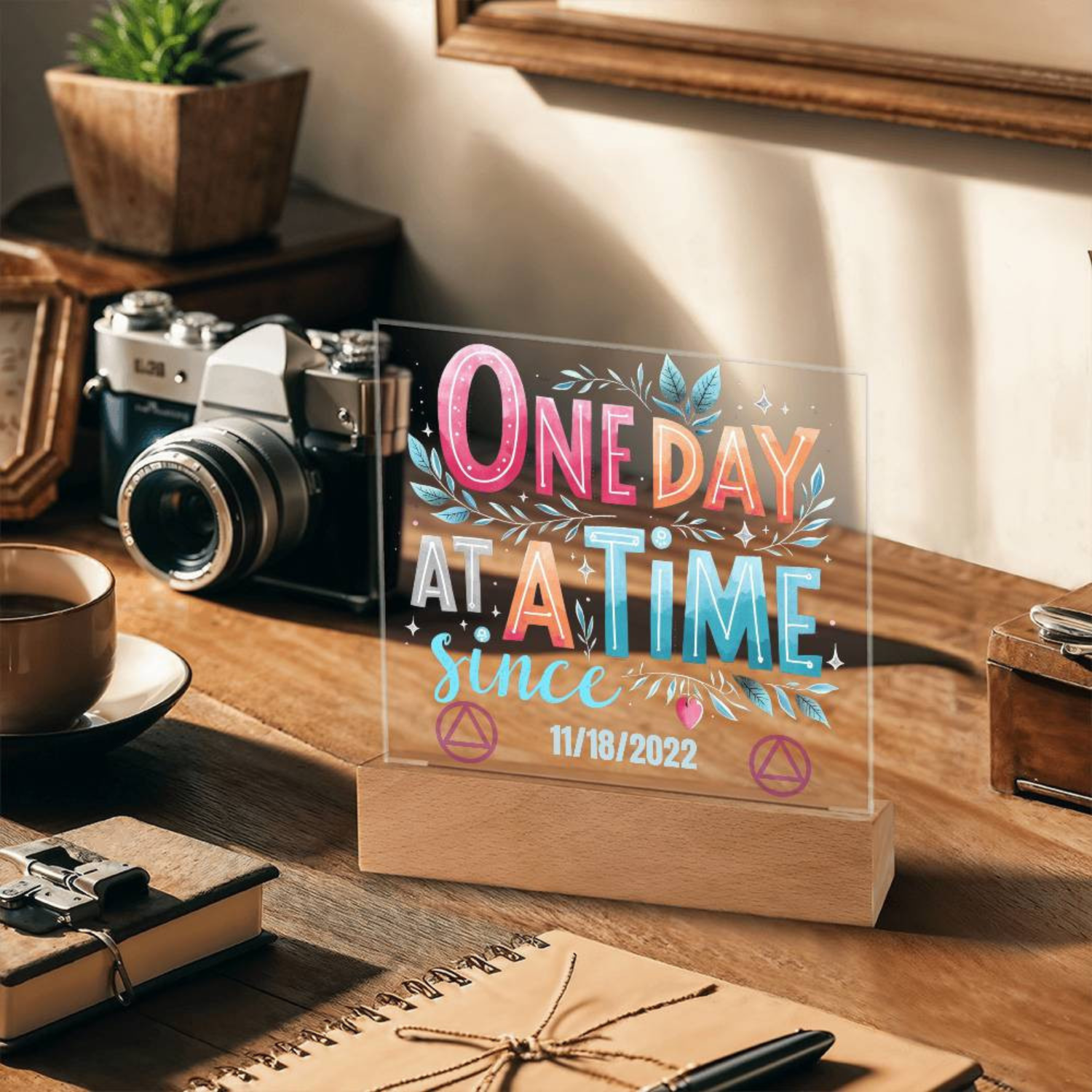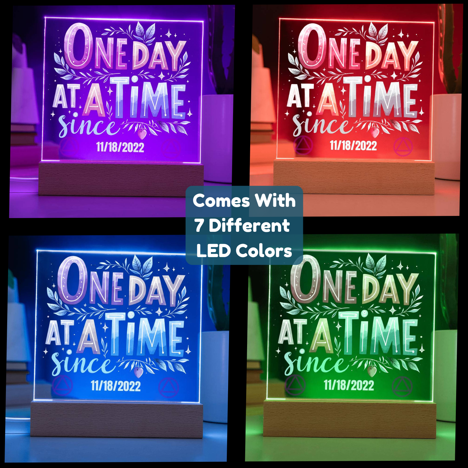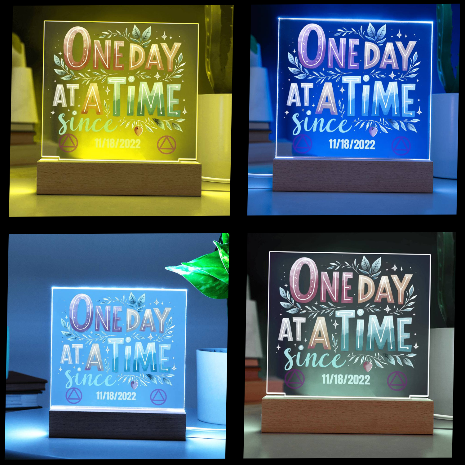 💡 Front of the Plaque: Proudly displays "One Day at a Time" alongside your custom sobriety date, making it a truly personal symbol of your recovery journey. As the lights shift, the message glows, creating a powerful visual impact that’s both uplifting and inspiring.