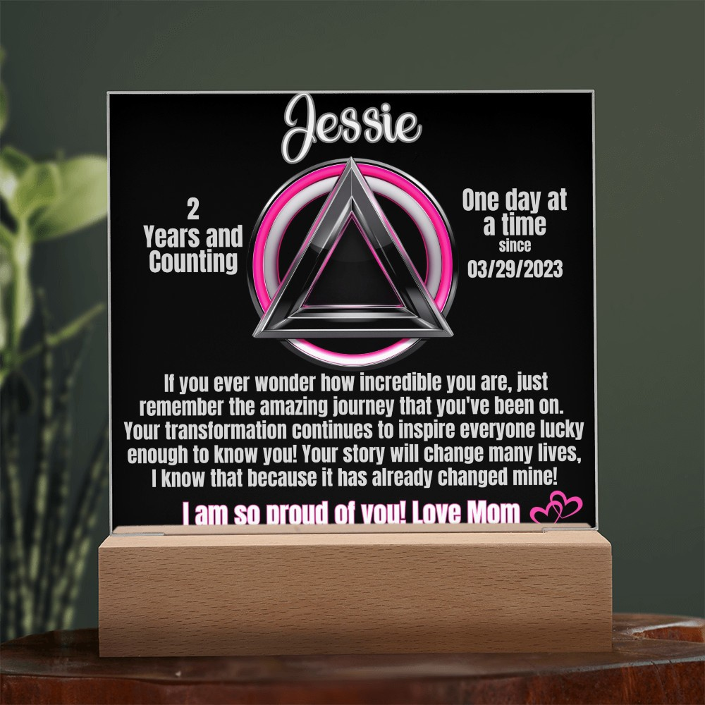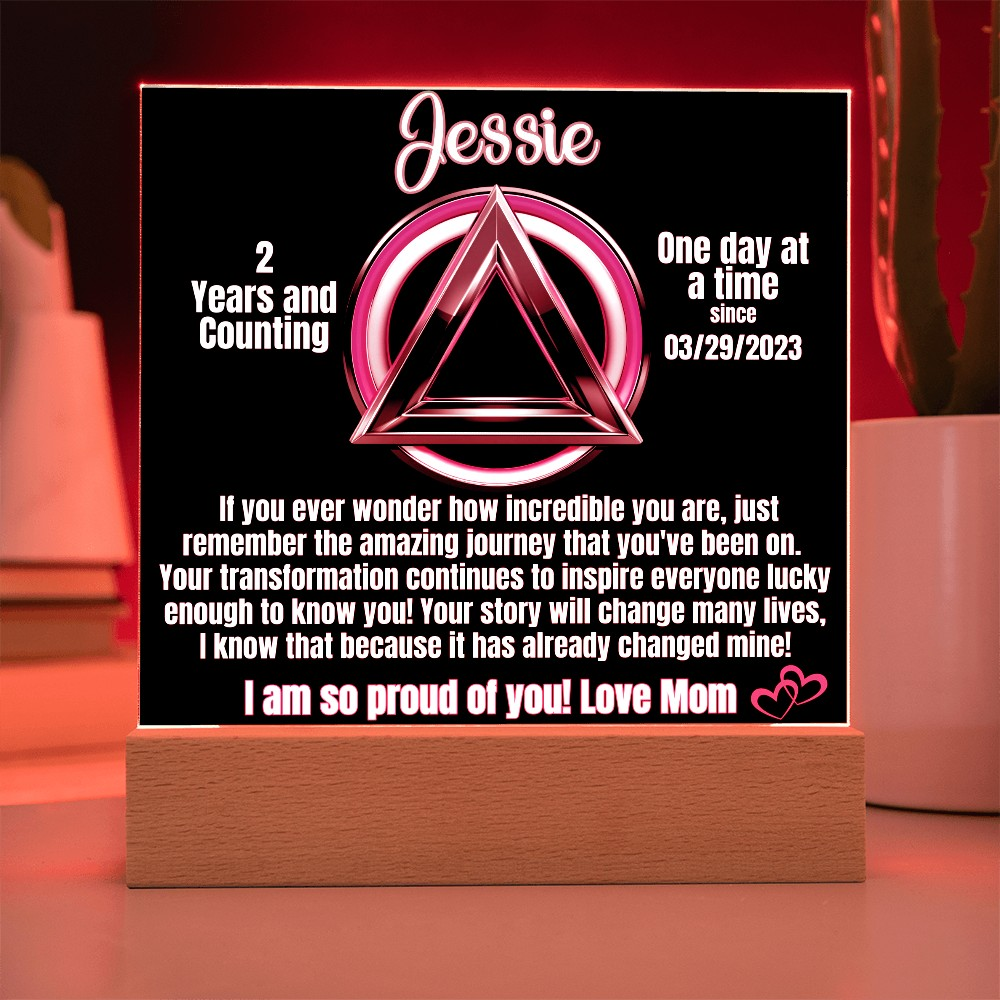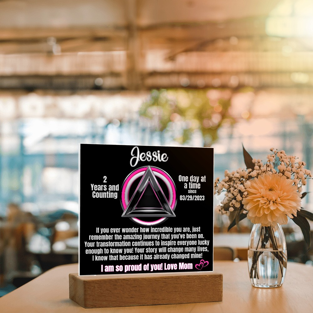This beautiful Personalized LED Acrylic Plaque is the perfect way to honor and celebrate a loved one’s journey to sobriety. Featuring a glowing pink and black triangle design surrounded by sleek, modern accents, this keepsake radiates pride, transformation, and love. The customizable text makes it a deeply meaningful gift that inspires hope and celebrates progress.