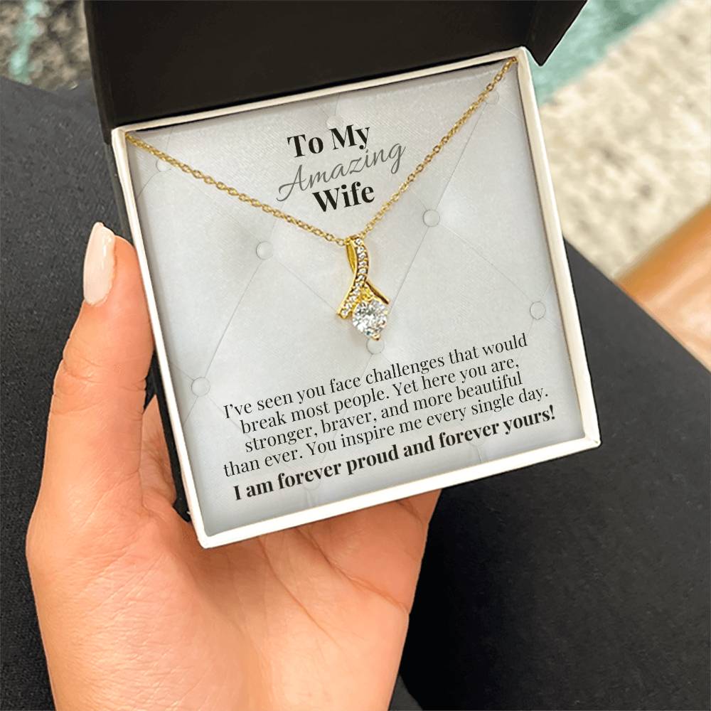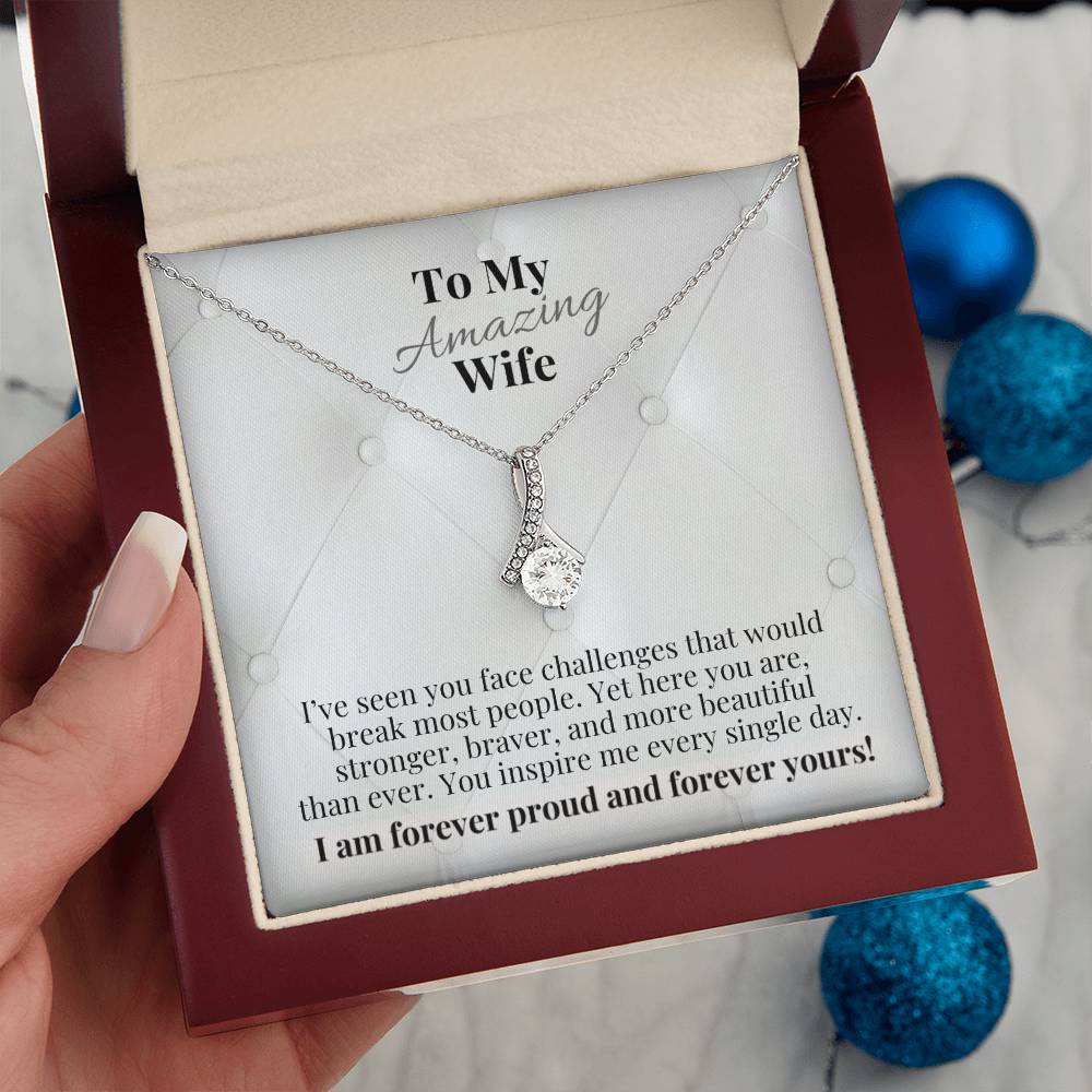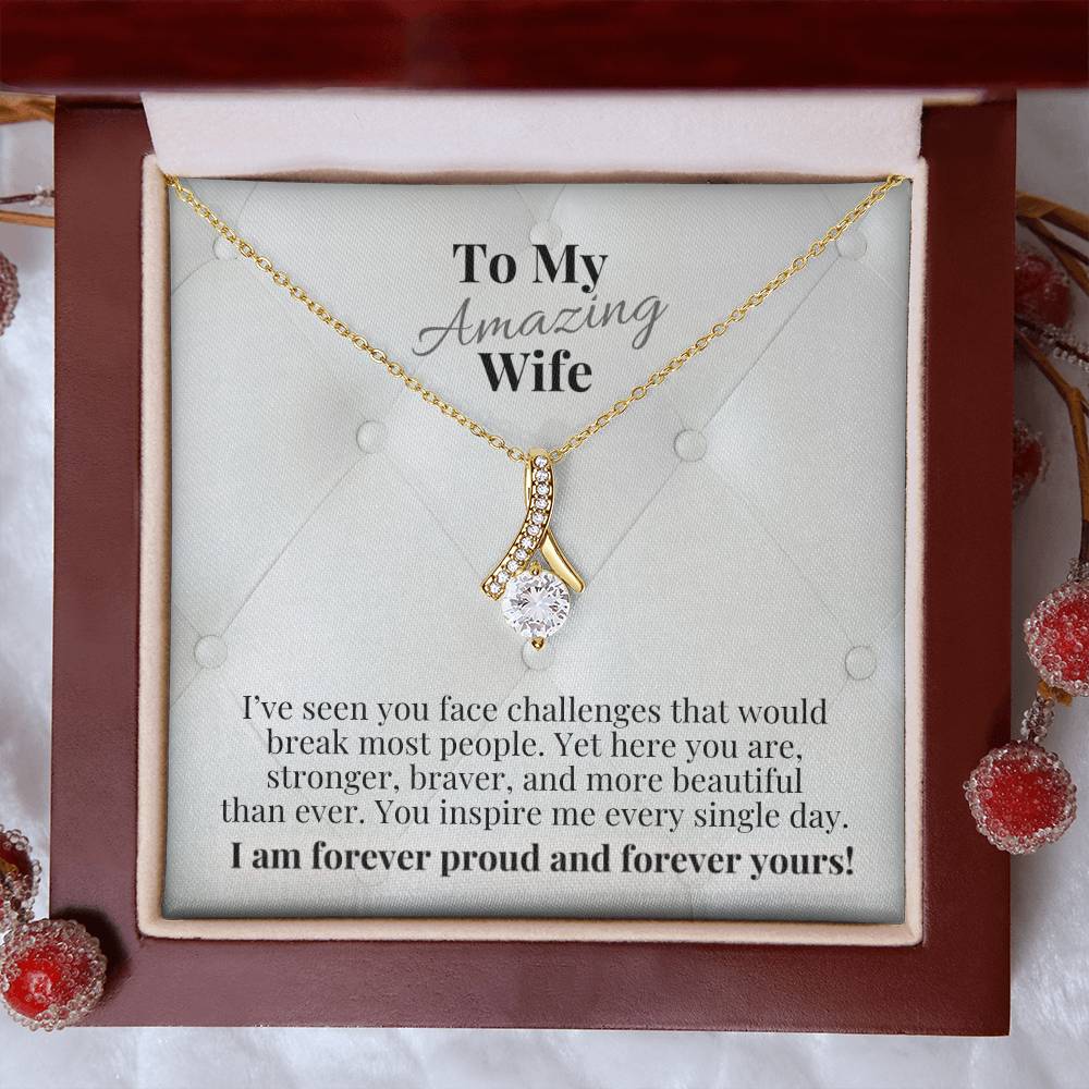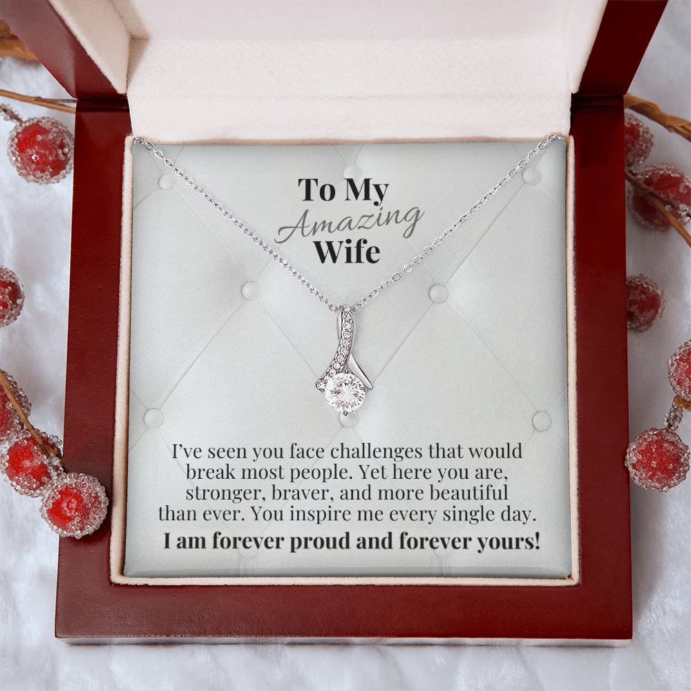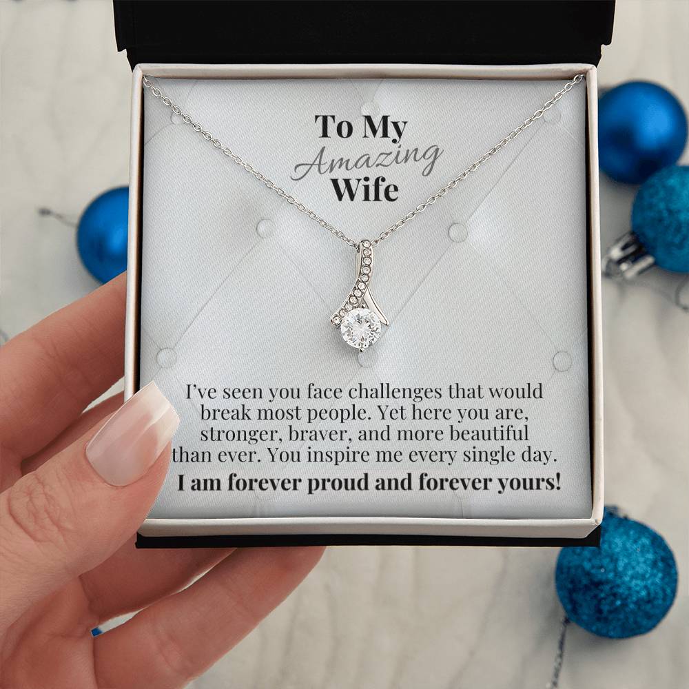 This stunning necklace is a heartfelt expression of love and admiration for your wife's courage and resilience. Celebrate her incredible journey with a gift that symbolizes her strength and your unwavering pride in her recovery.