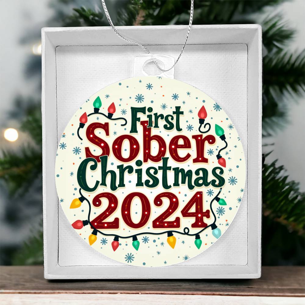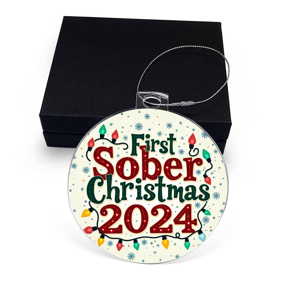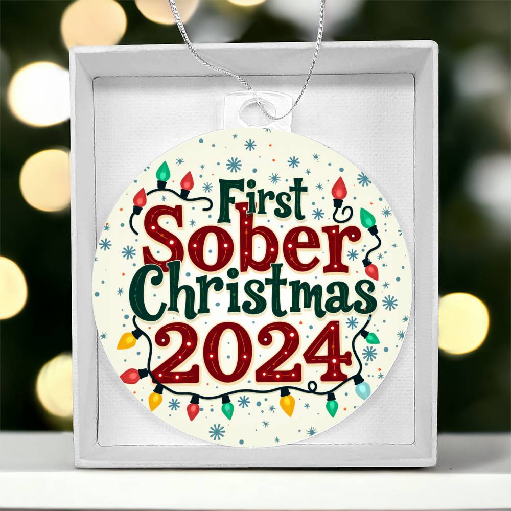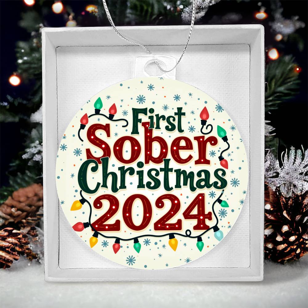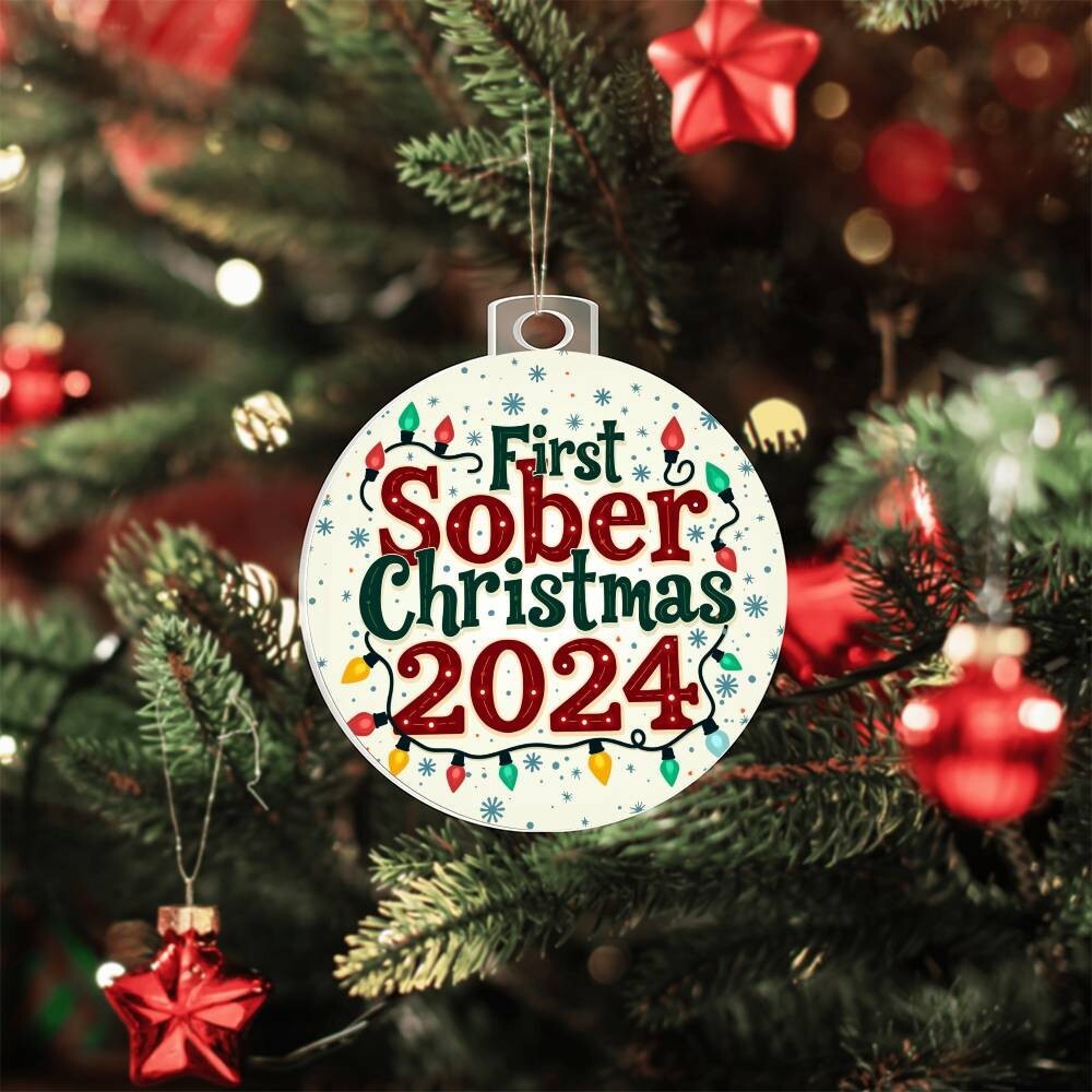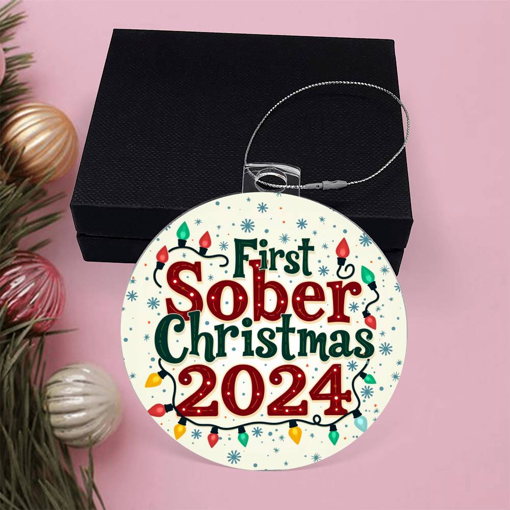 🔹 Front of the Ornament: Proudly displays "First Sober Christmas 2024" in elegant, easy-to-read typography, surrounded by soft, festive accents that bring warmth and cheer. The design captures the spirit of a memorable season in a clean, minimalist style to keep the focus on the message.