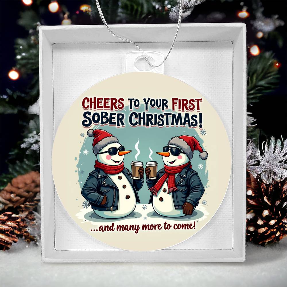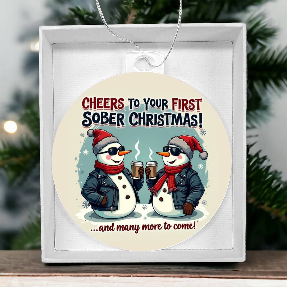 Celebrate this incredible milestone with a festive ornament designed to honor their first holiday season in sobriety. Featuring two cool snowmen clinking mugs of hot cocoa, this design brings warmth, encouragement, and a touch of holiday cheer. Perfect for friends, family members, or anyone who has achieved this meaningful first sober year, this ornament is a beautiful reminder of the journey, resilience, and many more sober holidays to come.