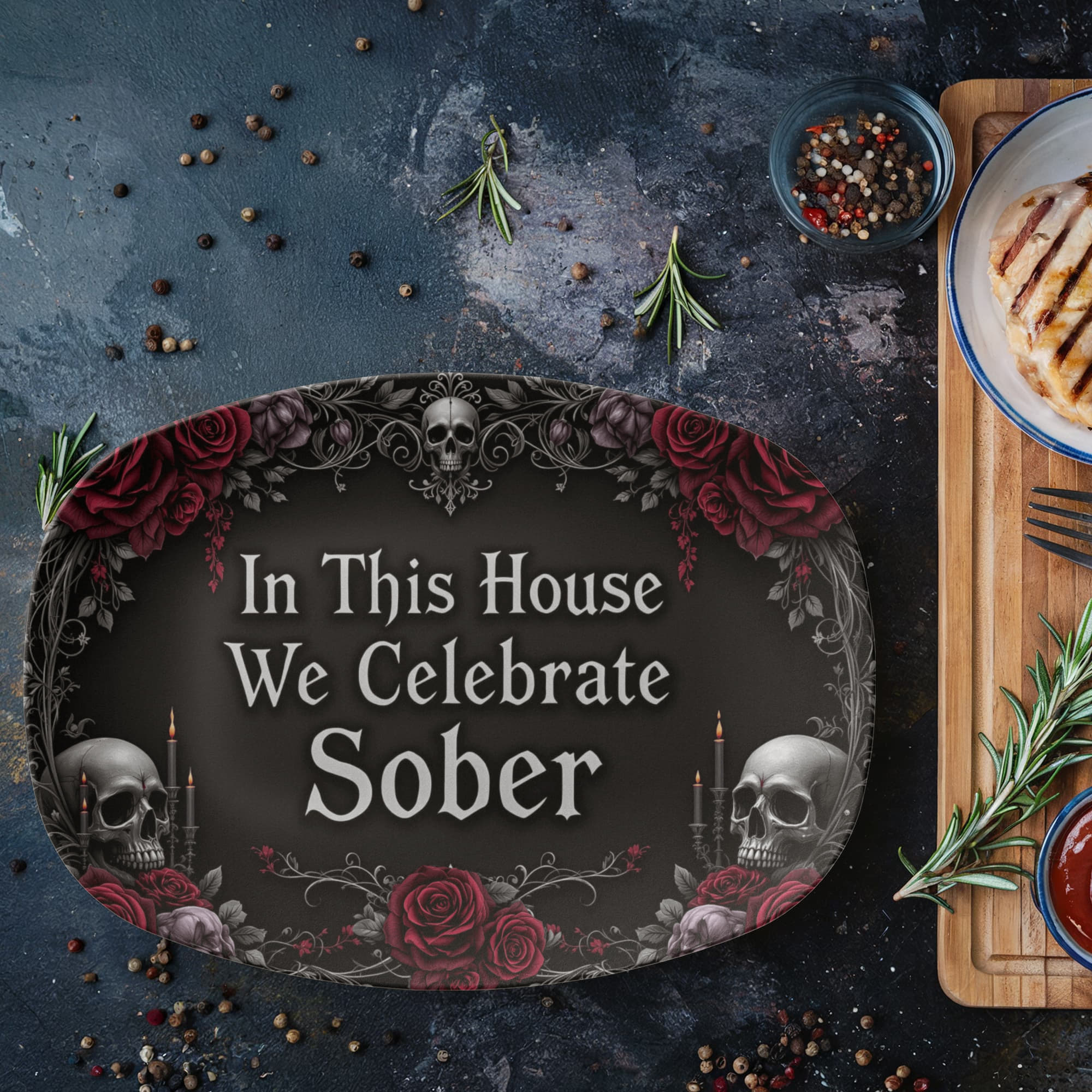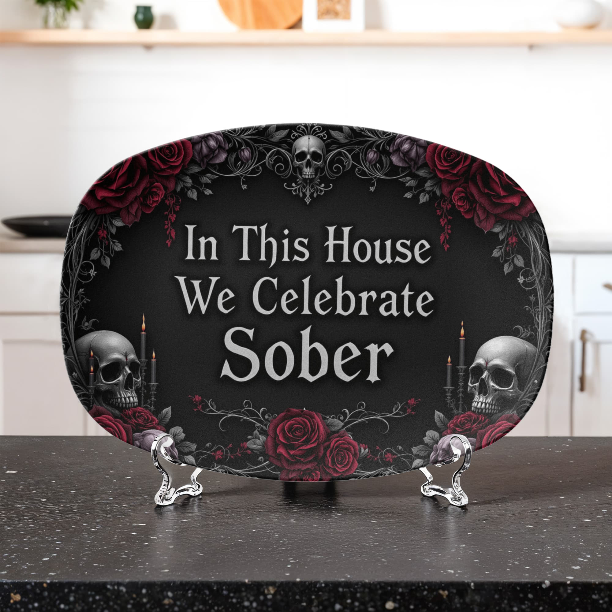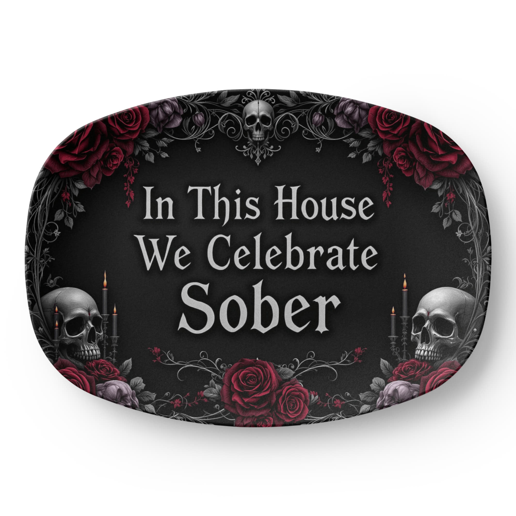 Framed with dark roses, skulls, candlelight, and elegant black filigree, this design blends gothic beauty with profound meaning. Whether displayed year-round or brought out for special sober celebrations, this platter honors your journey with edge, elegance, and soul. 🕯️🌹💀