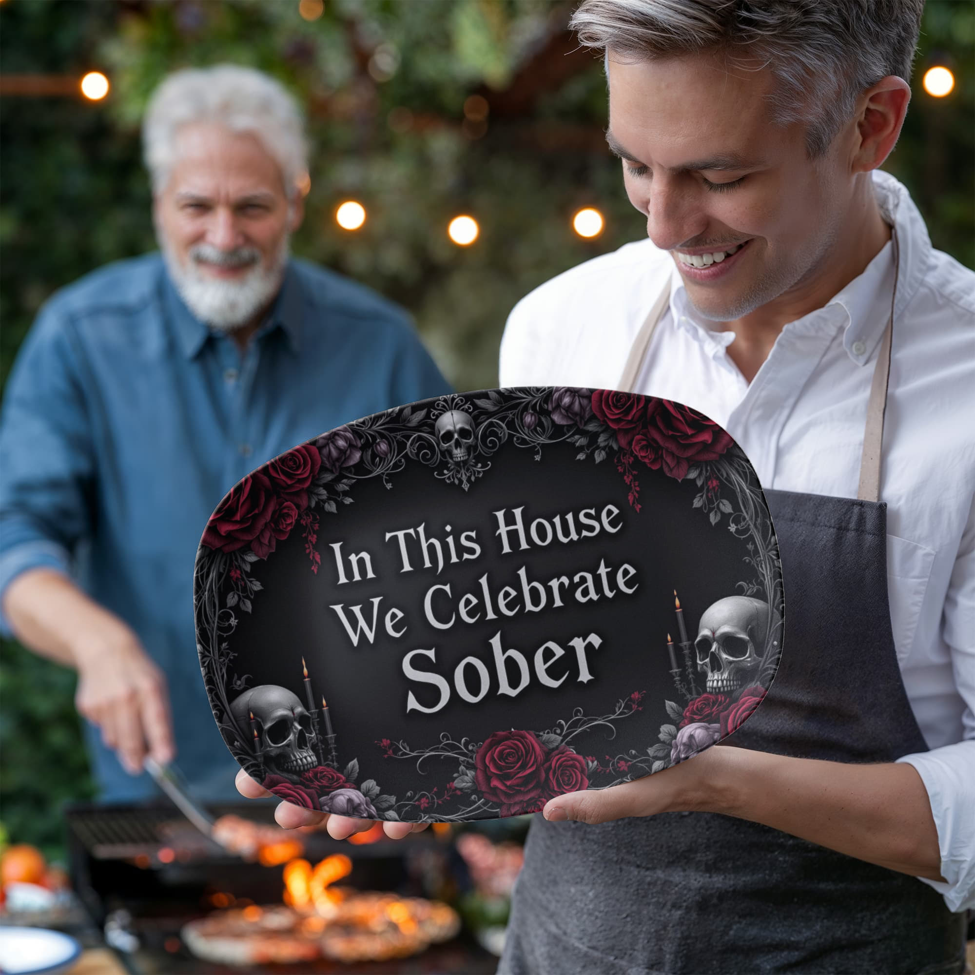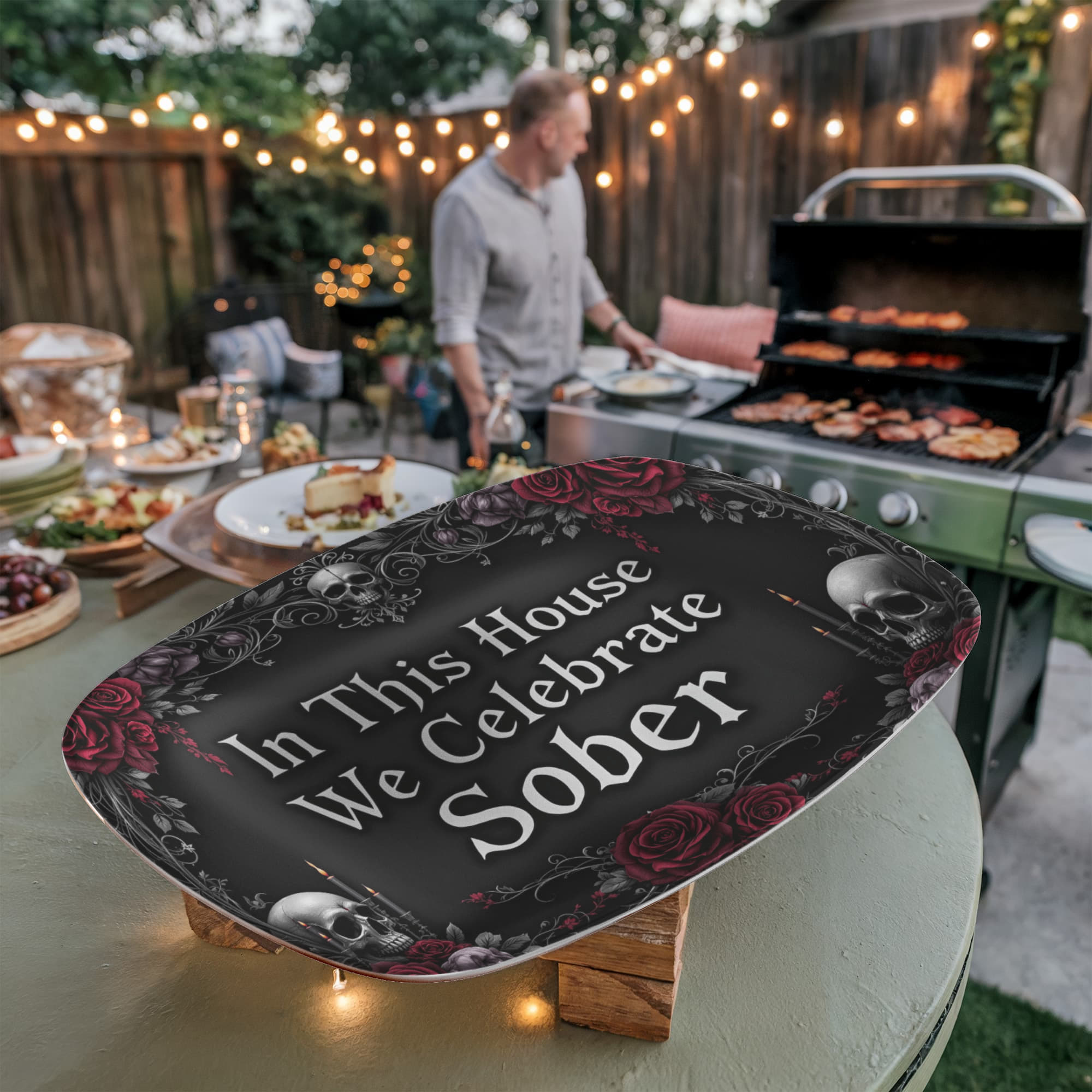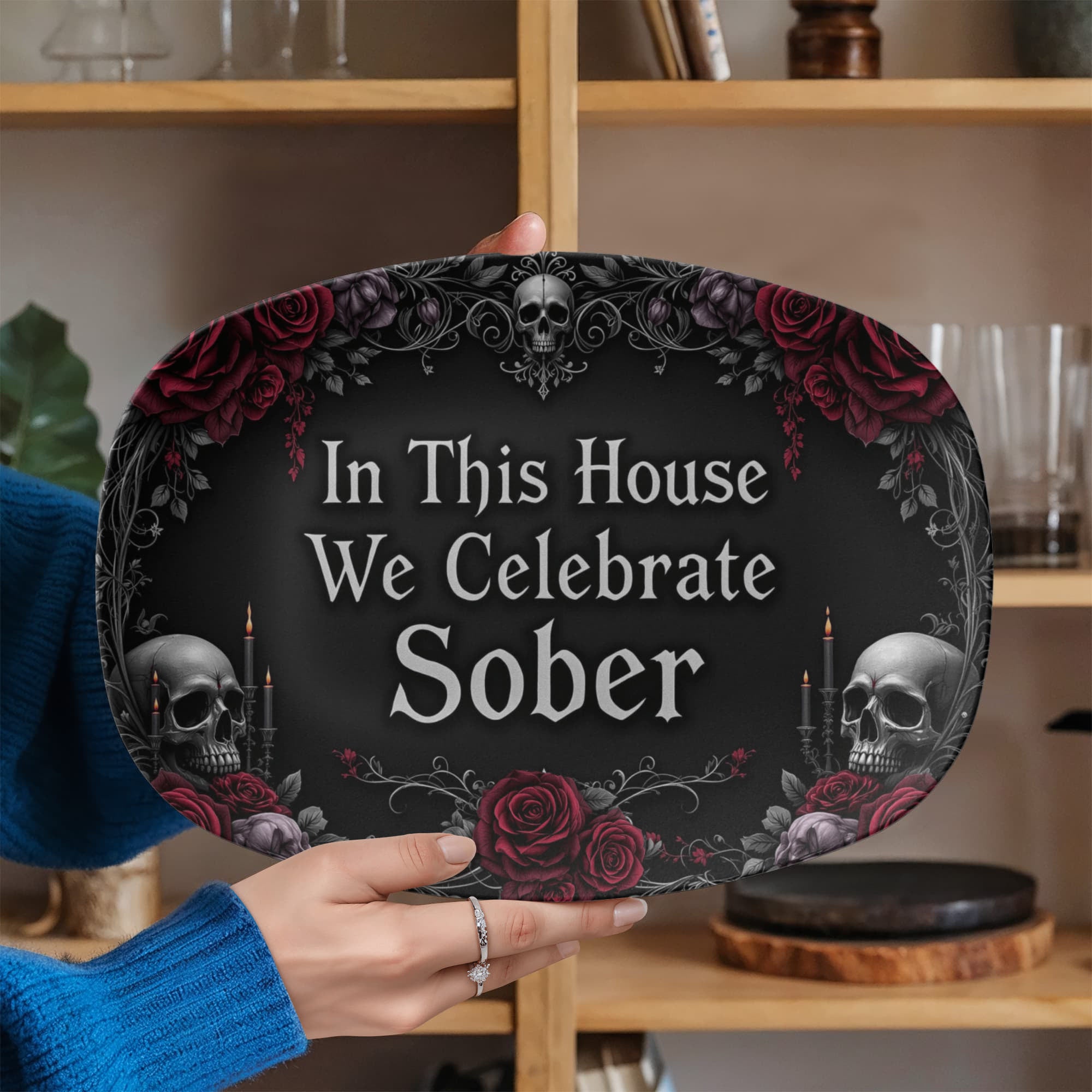 Framed with dark roses, skulls, candlelight, and elegant black filigree, this design blends gothic beauty with profound meaning. Whether displayed year-round or brought out for special sober celebrations, this platter honors your journey with edge, elegance, and soul. 🕯️🌹💀
