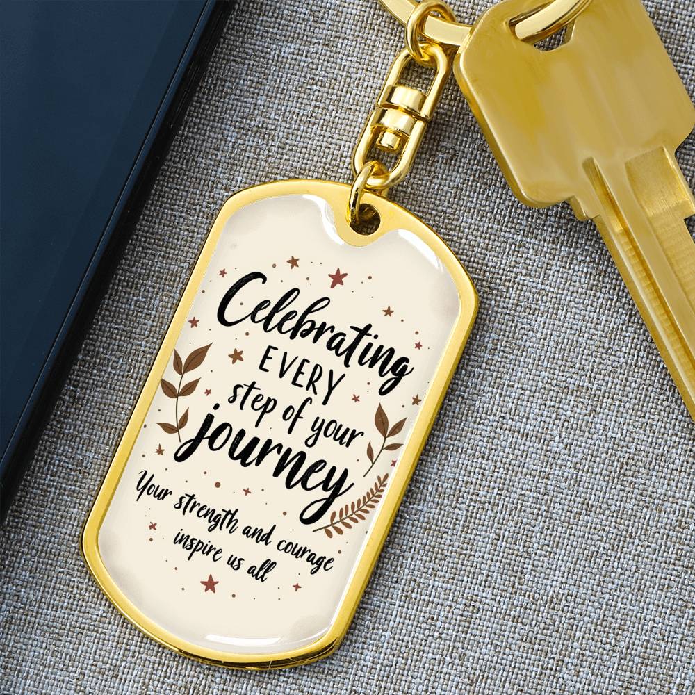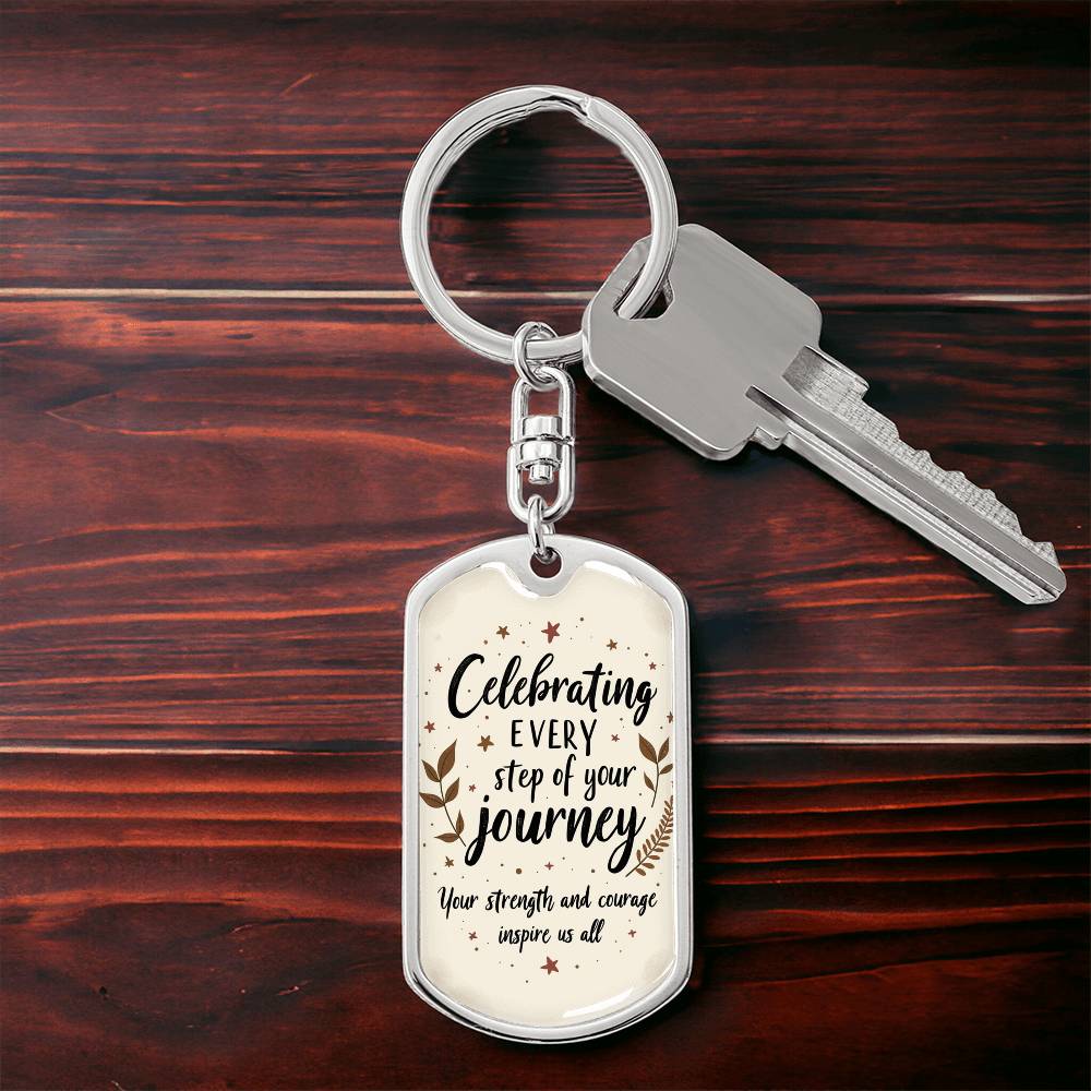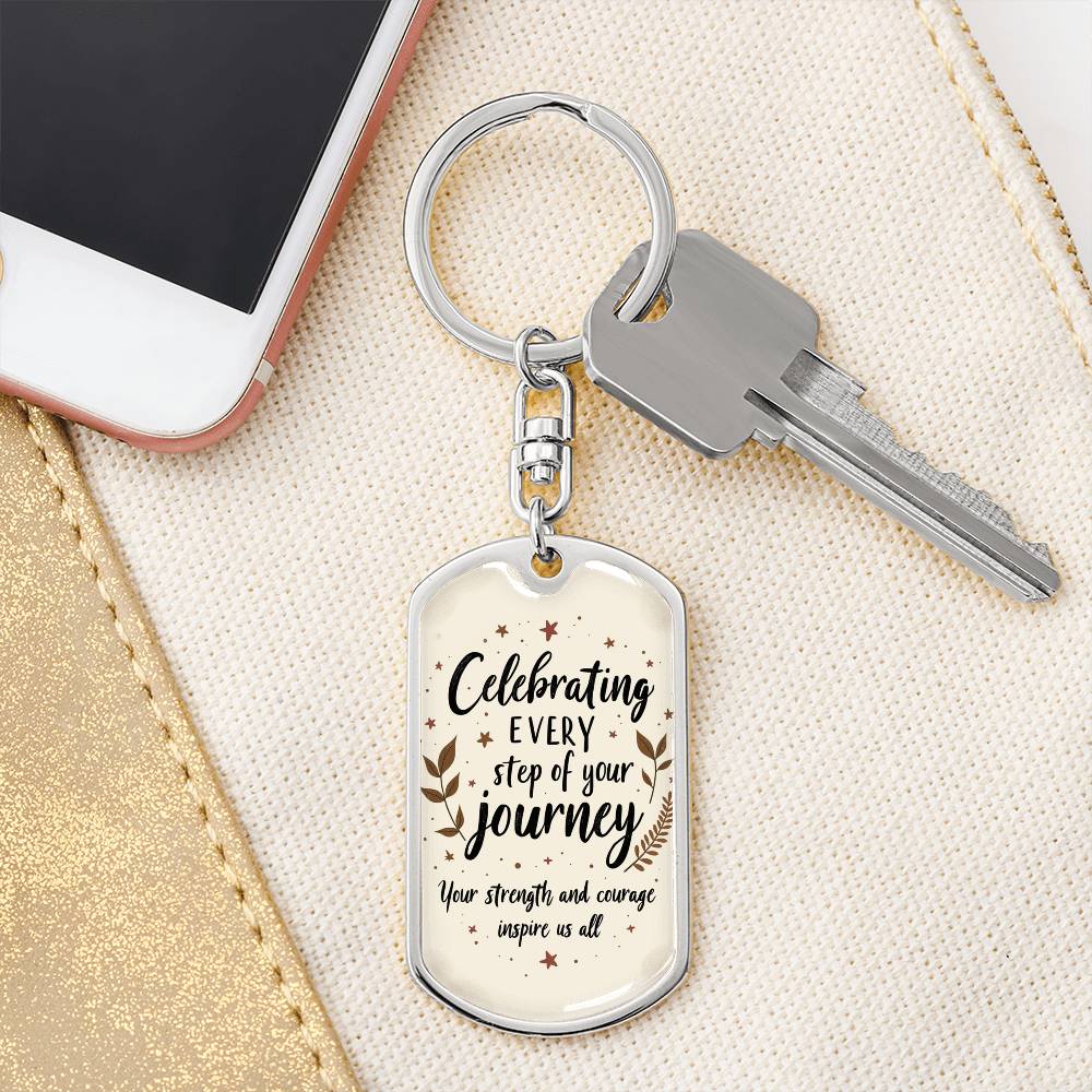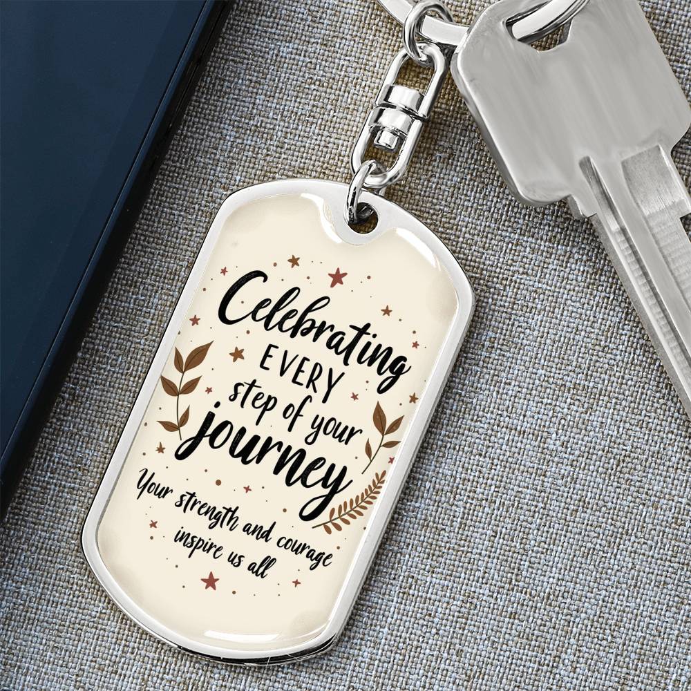 🔑 Front of the Keychain: Features the uplifting inscription, "Celebrating every step of your journey. Your strength and courage inspire us all," thoughtfully designed to resonate deeply and serve as a daily reminder of your loved one’s incredible journey.