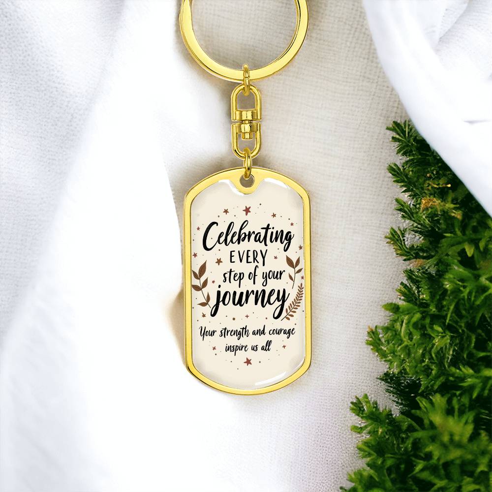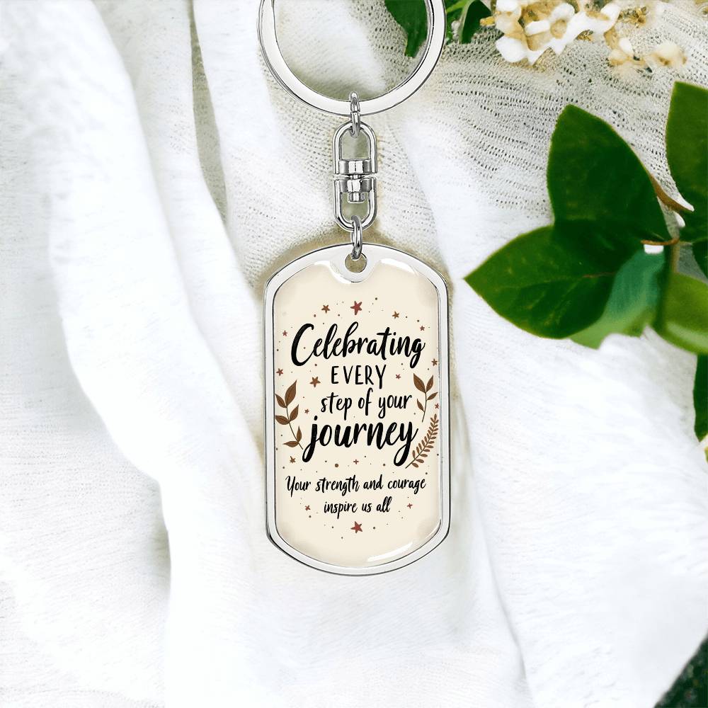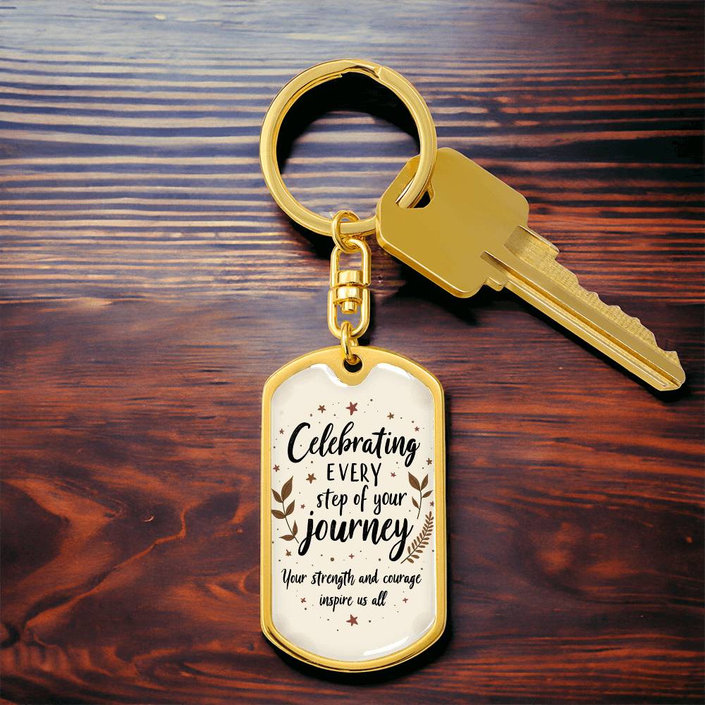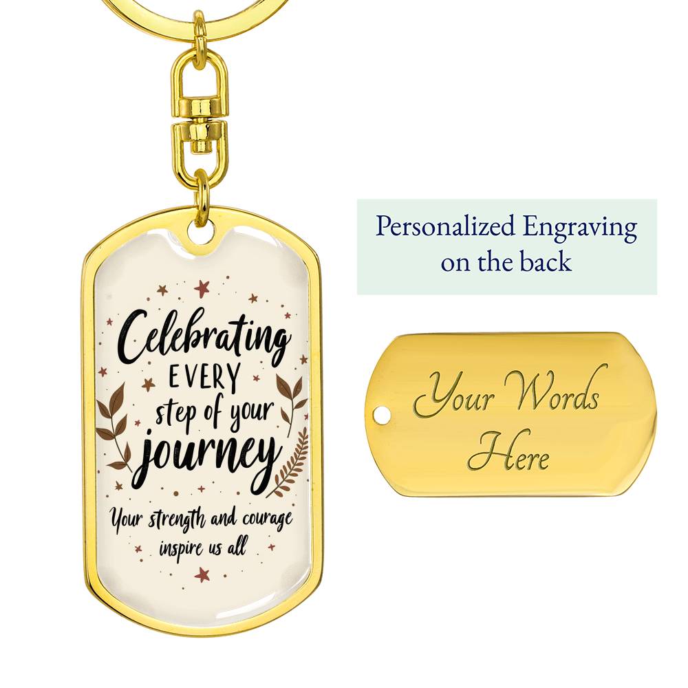 🔑 Front of the Keychain: Features the uplifting inscription, "Celebrating every step of your journey. Your strength and courage inspire us all," thoughtfully designed to resonate deeply and serve as a daily reminder of your loved one’s incredible journey.