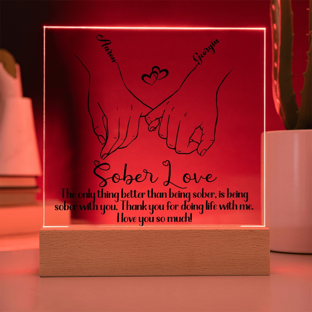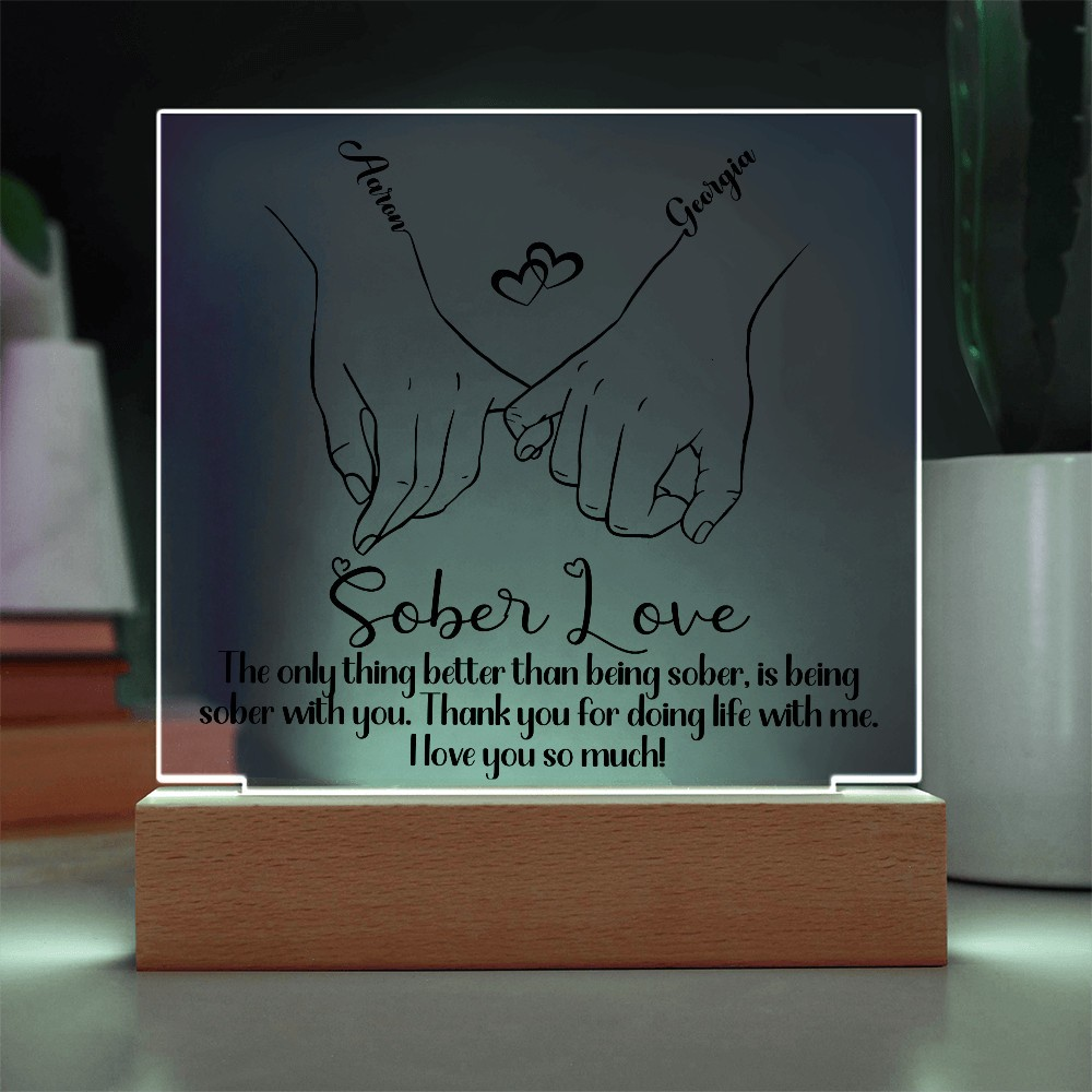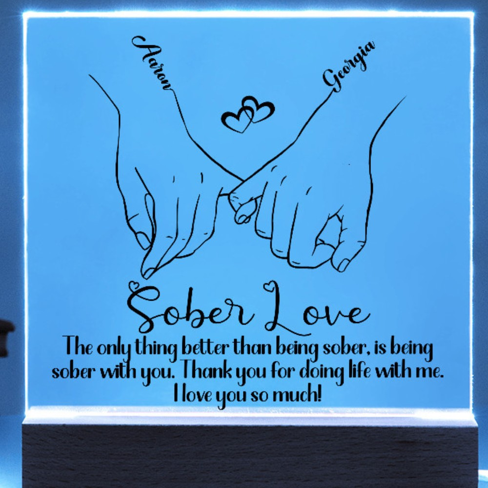 Mark a beautiful chapter in your recovery journey with this Personalized Acrylic LED Plaque. Featuring a heartfelt design of two hands intertwined, adorned with customizable names, with two overlapping hearts in the middle, this keepsake speaks of love, resilience, and shared milestones. Below the artwork, the words "Sober Love" are elegantly printed, followed by the inspiring quote:
