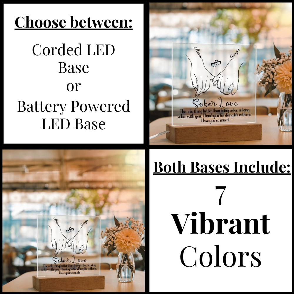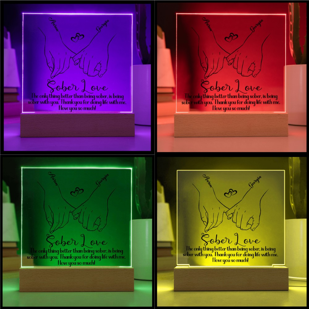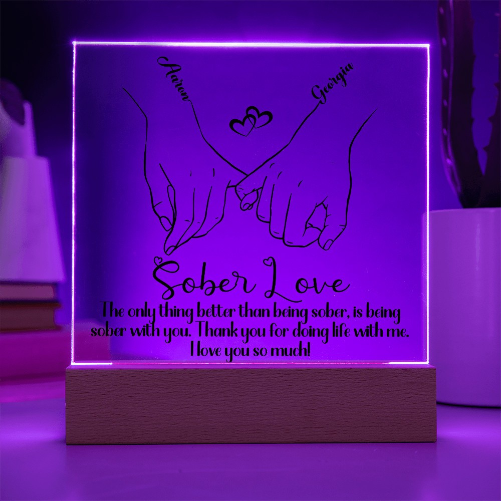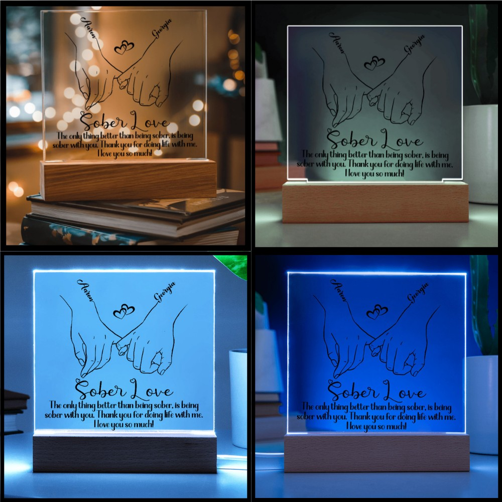 Mark a beautiful chapter in your recovery journey with this Personalized Acrylic LED Plaque. Featuring a heartfelt design of two hands intertwined, adorned with customizable names, with two overlapping hearts in the middle, this keepsake speaks of love, resilience, and shared milestones. Below the artwork, the words "Sober Love" are elegantly printed, followed by the inspiring quote: