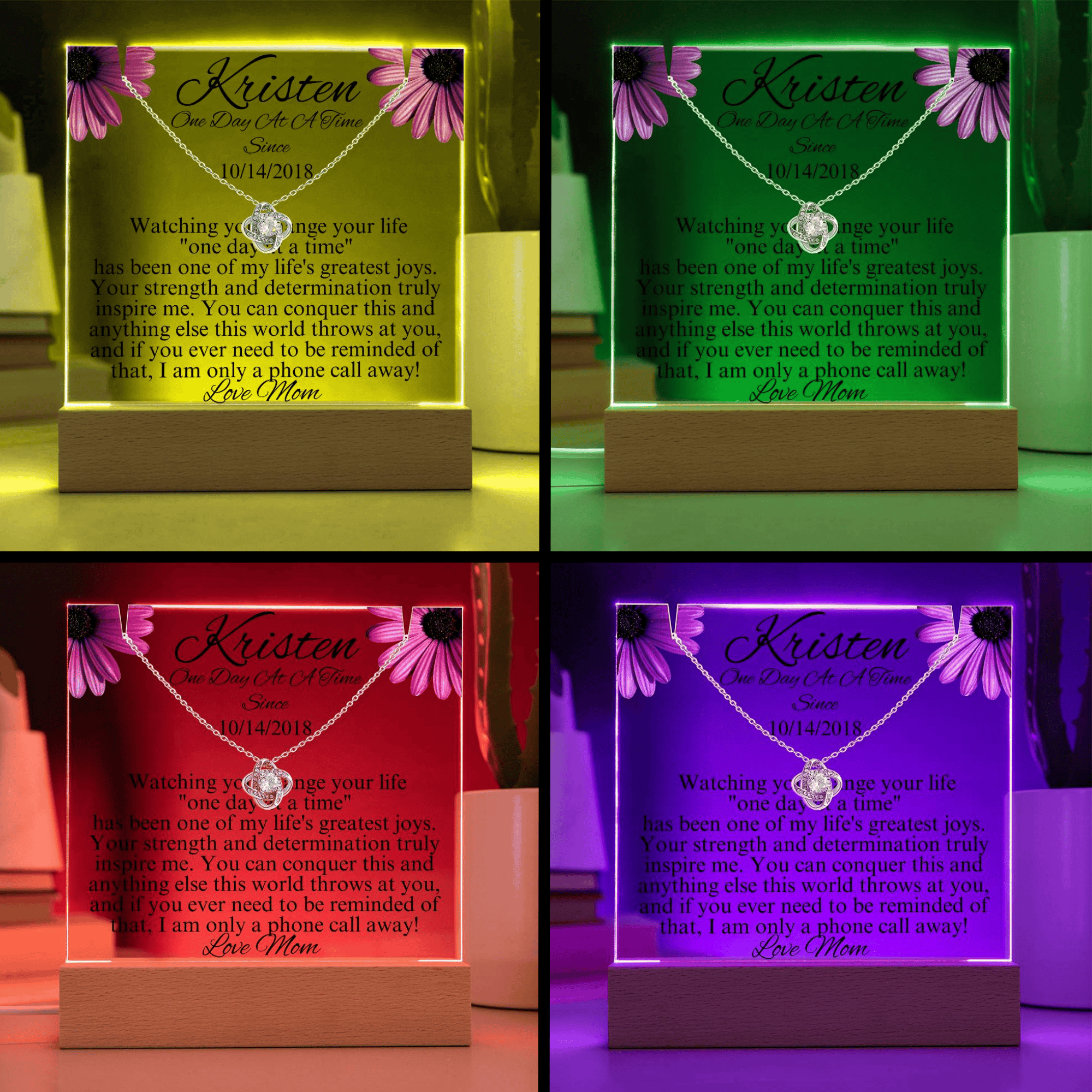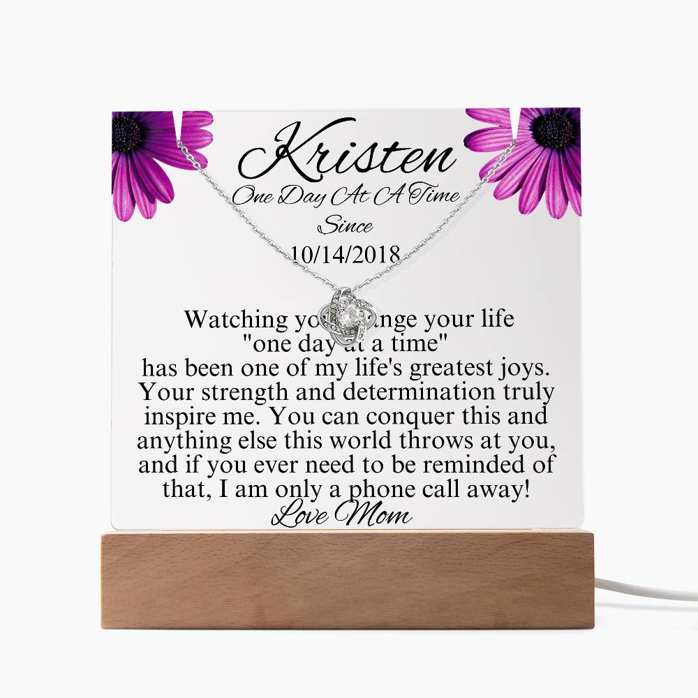 Celebrate and encourage her on her journey with our elegant Keepsake Acrylic Bundle, featuring a stunning Square Acrylic and the beautiful Love Knot Necklace. Your personalized message is showcased on crystal-clear acrylic, making this set a welcomed addition to any room. Paired with the charming Love Knot Necklace, this bundle is the perfect gift for Sobriety anniversaries/birthdays, or any special occasion when you want to encourage her and let her know what her recovery means to you.
