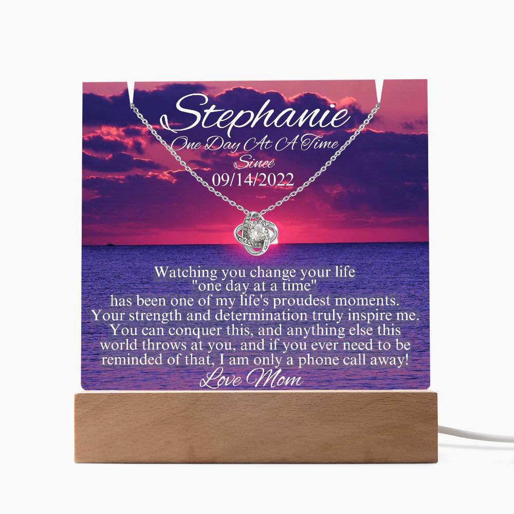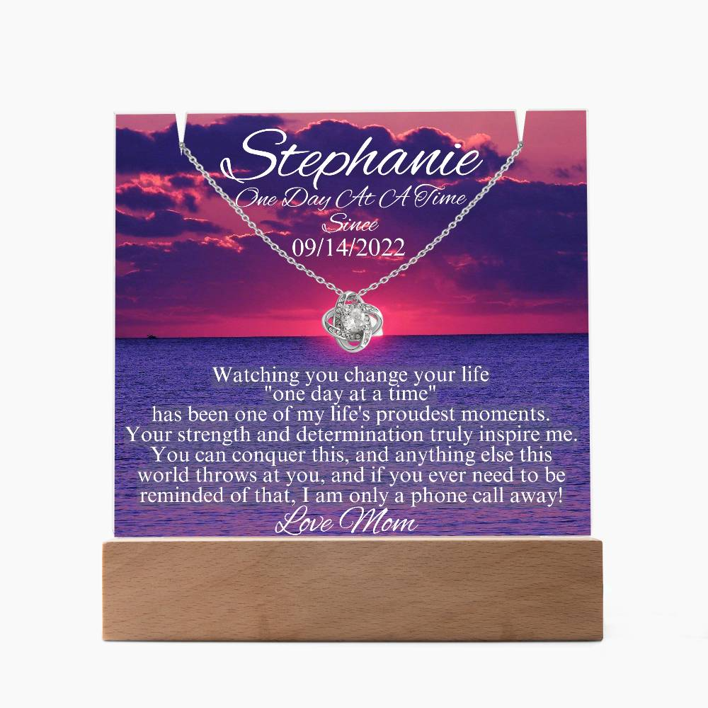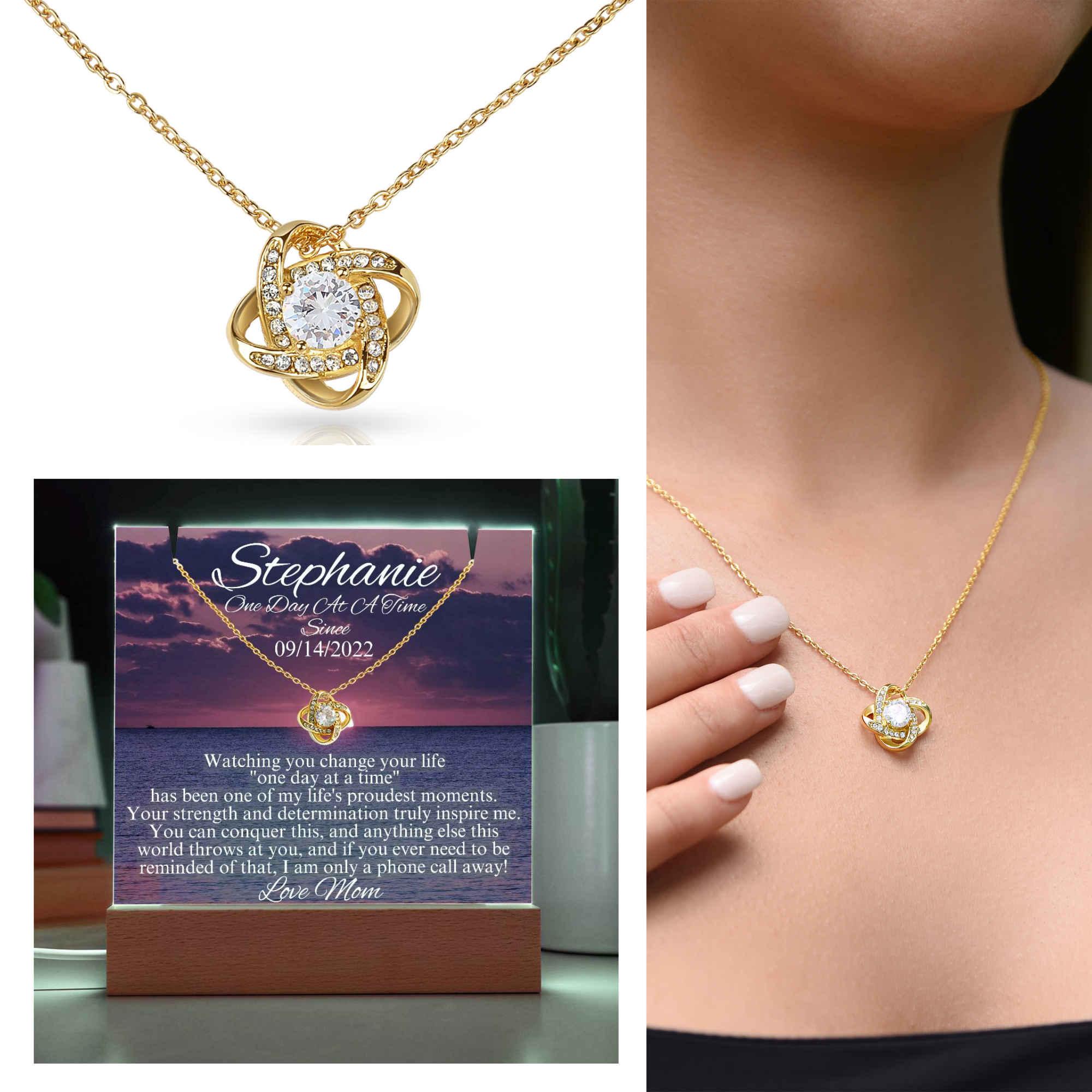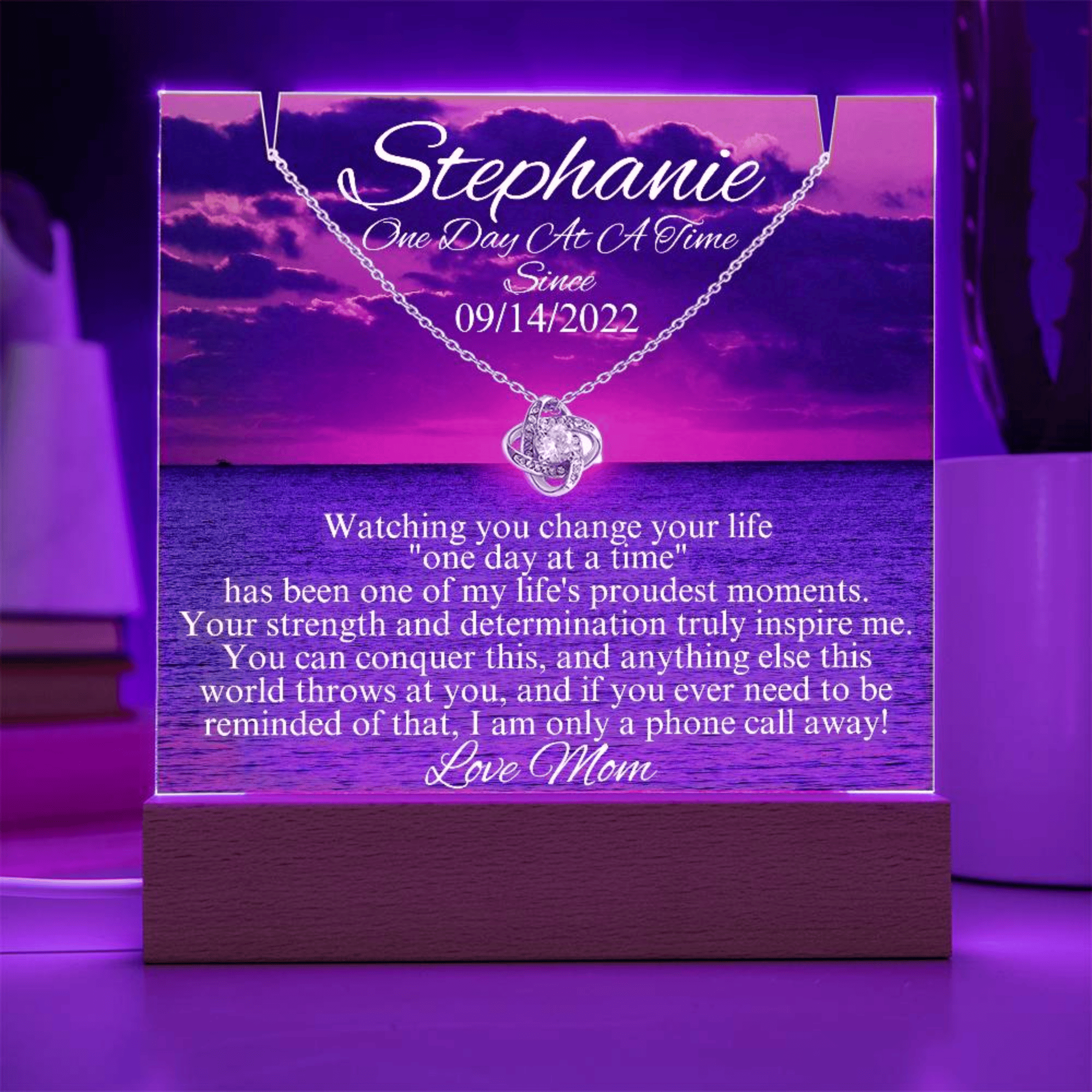 Celebrate and encourage her on her journey with our elegant Keepsake Acrylic Bundle, featuring a stunning Square Acrylic and the beautiful Love Knot Necklace. Your personalized message is showcased on crystal-clear acrylic, making this set a welcomed addition to any room. Paired with the charming Love Knot Necklace, this bundle is the perfect gift for Sobriety anniversaries/birthdays, or any special occasion when you want to encourage her and let her know what her recovery means to you.