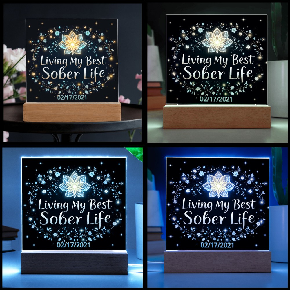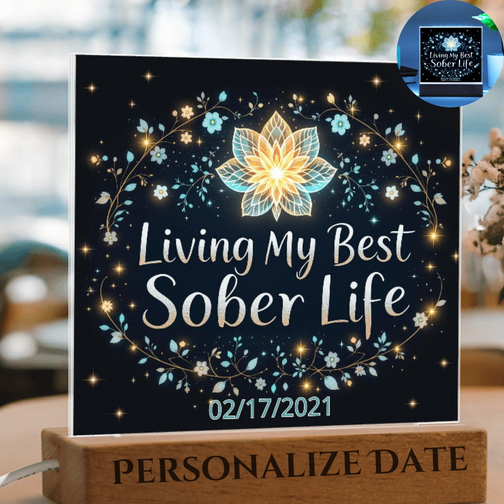 Honor the incredible journey of sobriety with this stunning personalized LED acrylic plaque. Featuring the heartfelt message, "Living My Best Sober Life", accompanied by a customizable date at the bottom, this gift is a radiant reminder of strength and resilience. The design includes a glowing lotus flower surrounded by delicate floral accents and sparkling details, creating a truly uplifting and inspirational keepsake.