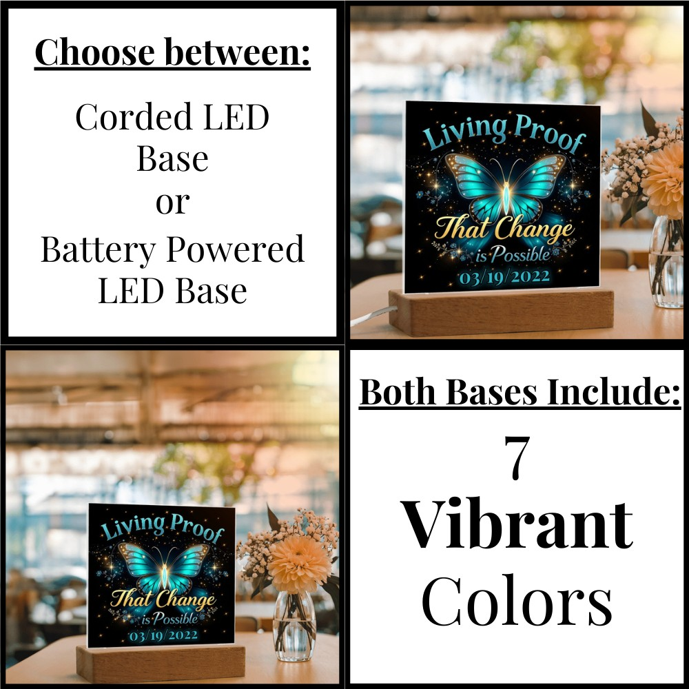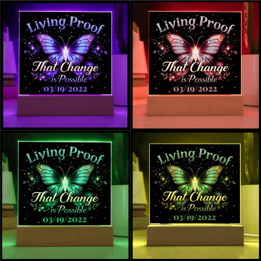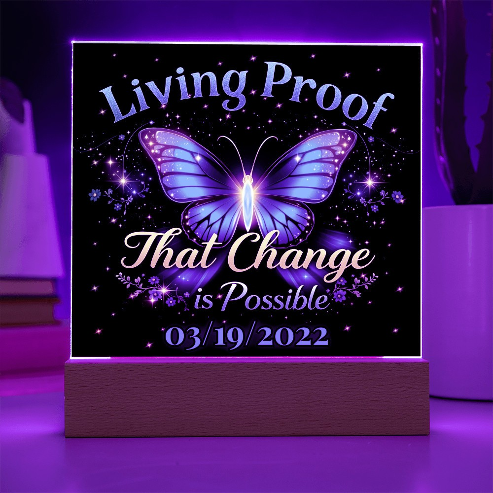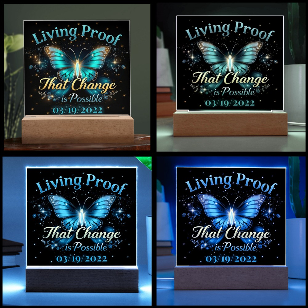 Celebrate the incredible journey of transformation with this personalized acrylic LED plaque! 🌟 Featuring the empowering message, "Living Proof That Change is Possible", alongside a radiant teal butterfly, delicate floral accents, and a customizable sobriety date (e.g., "03/19/2022"), this keepsake is a heartfelt reminder of resilience and renewal. The glowing design brings hope and inspiration to any space, making it a meaningful gift to honor sobriety milestones. 💖