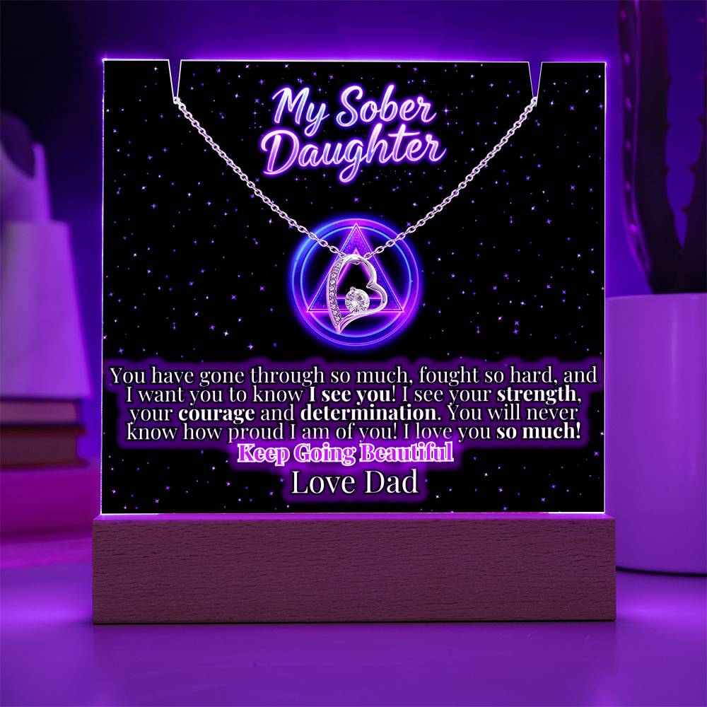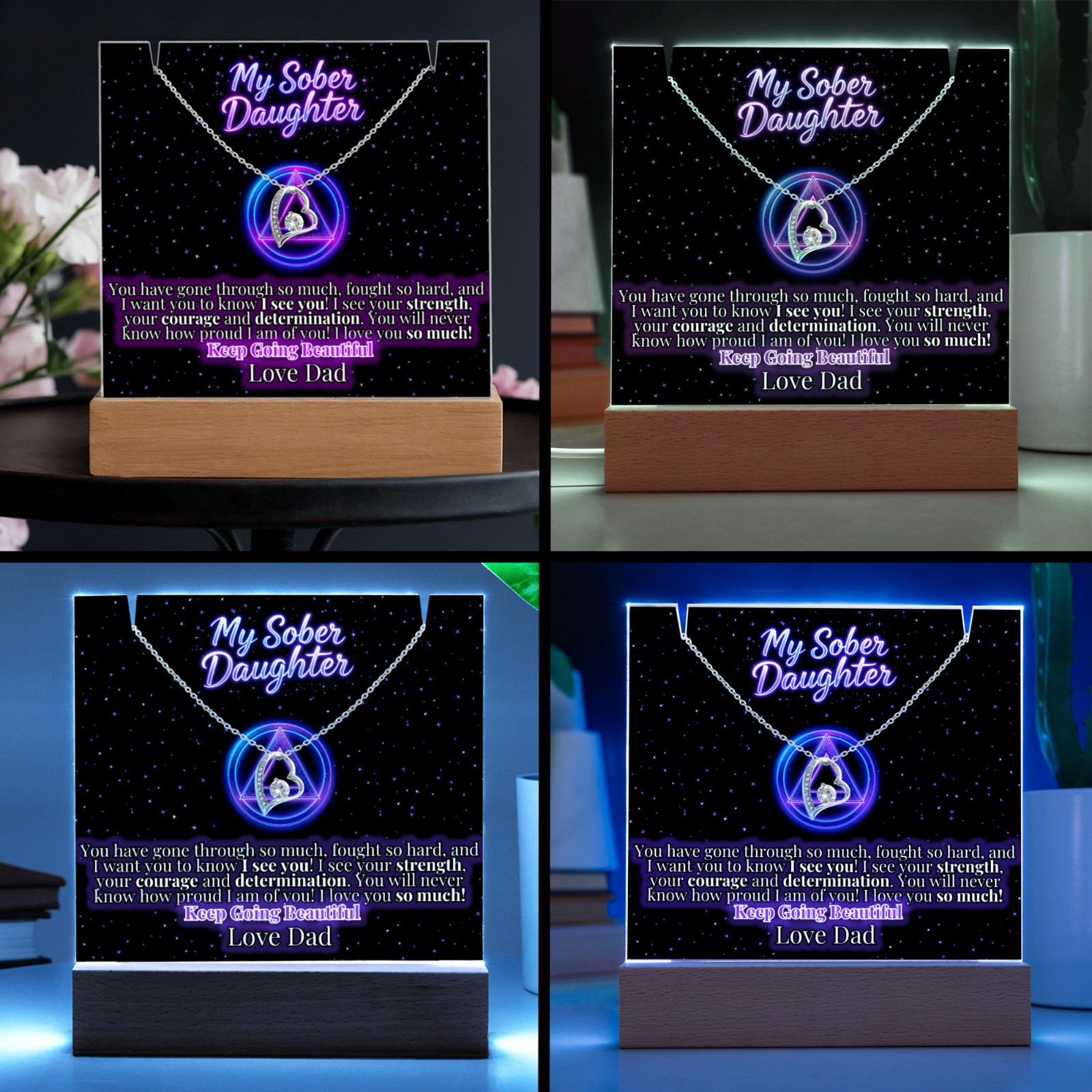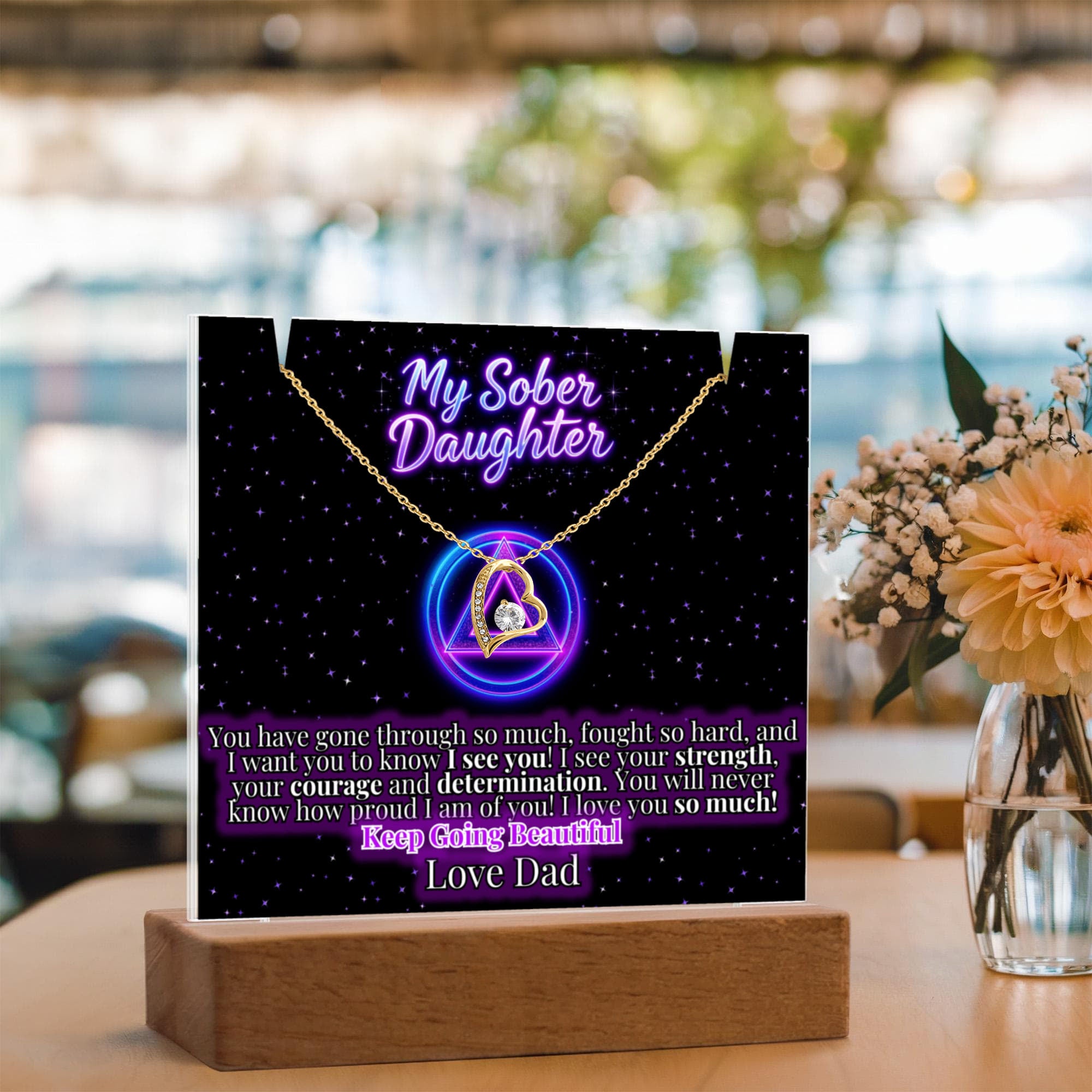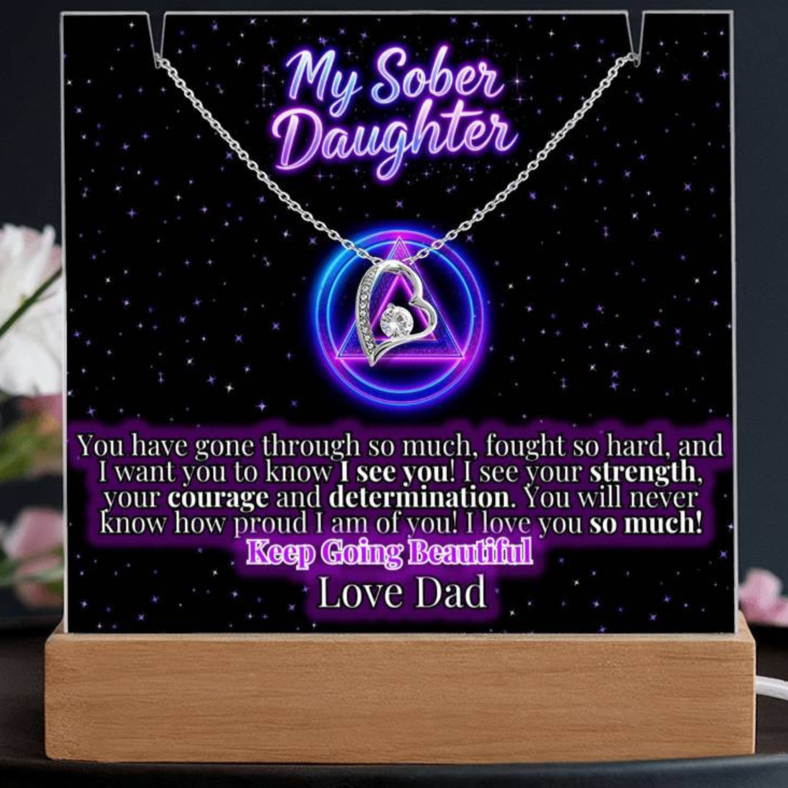 This heartfelt gift bundle honors the courage, determination, and progress of a loved one on their sobriety journey. The acrylic plaque features a bold, colorful design with vibrant LED lighting, displaying a powerful and emotional message of love and pride. Paired with the elegant Forever Love Necklace, this gift is a meaningful keepsake that inspires hope and celebrates milestones.