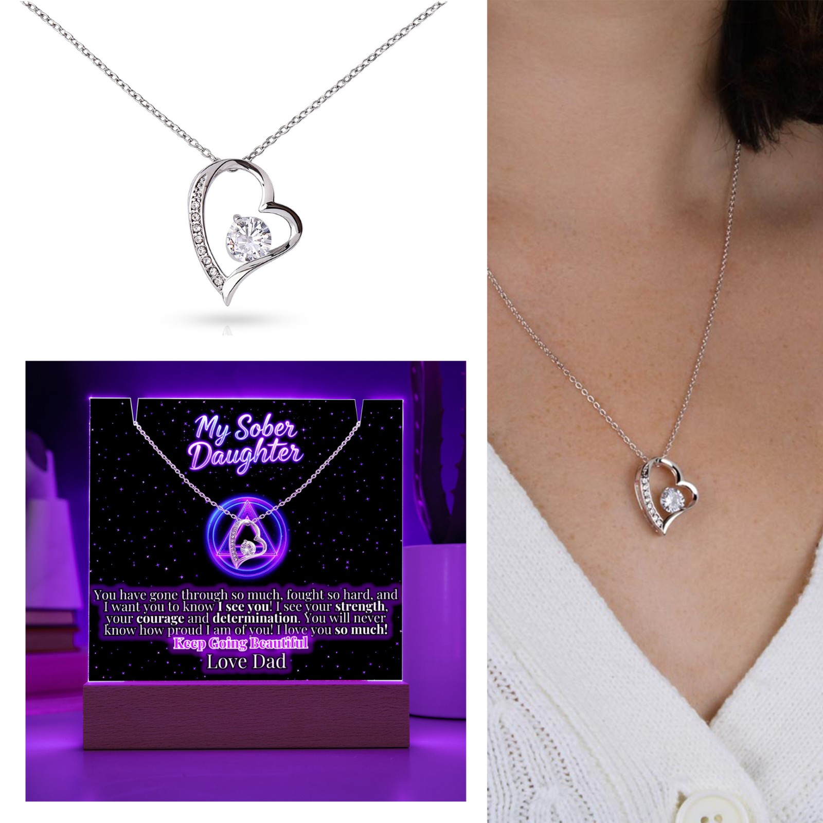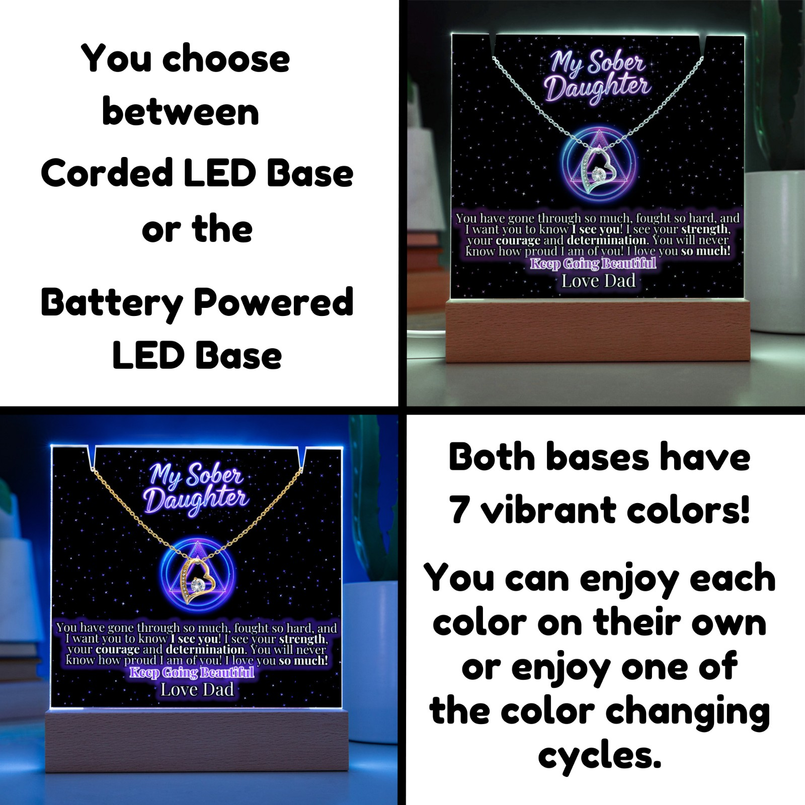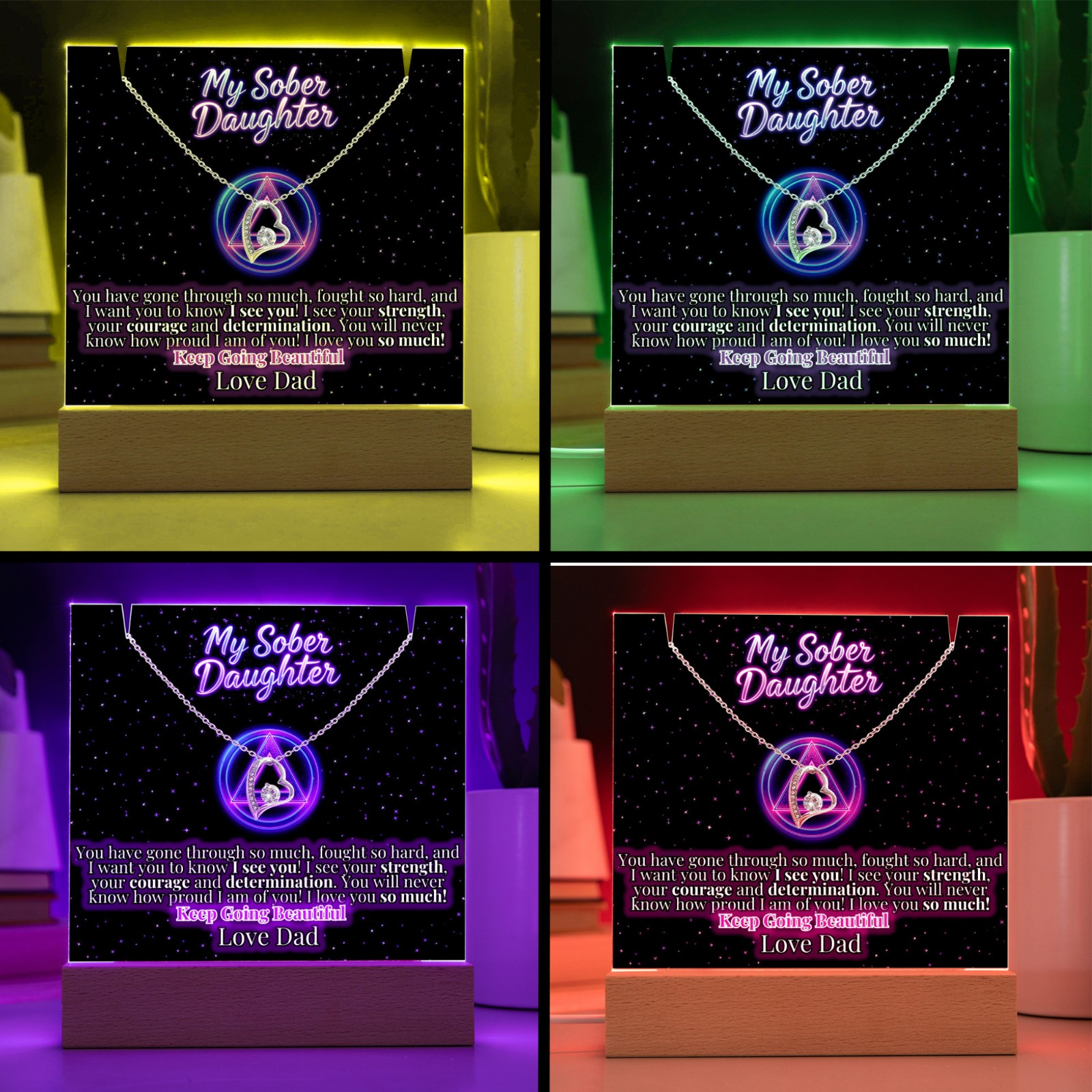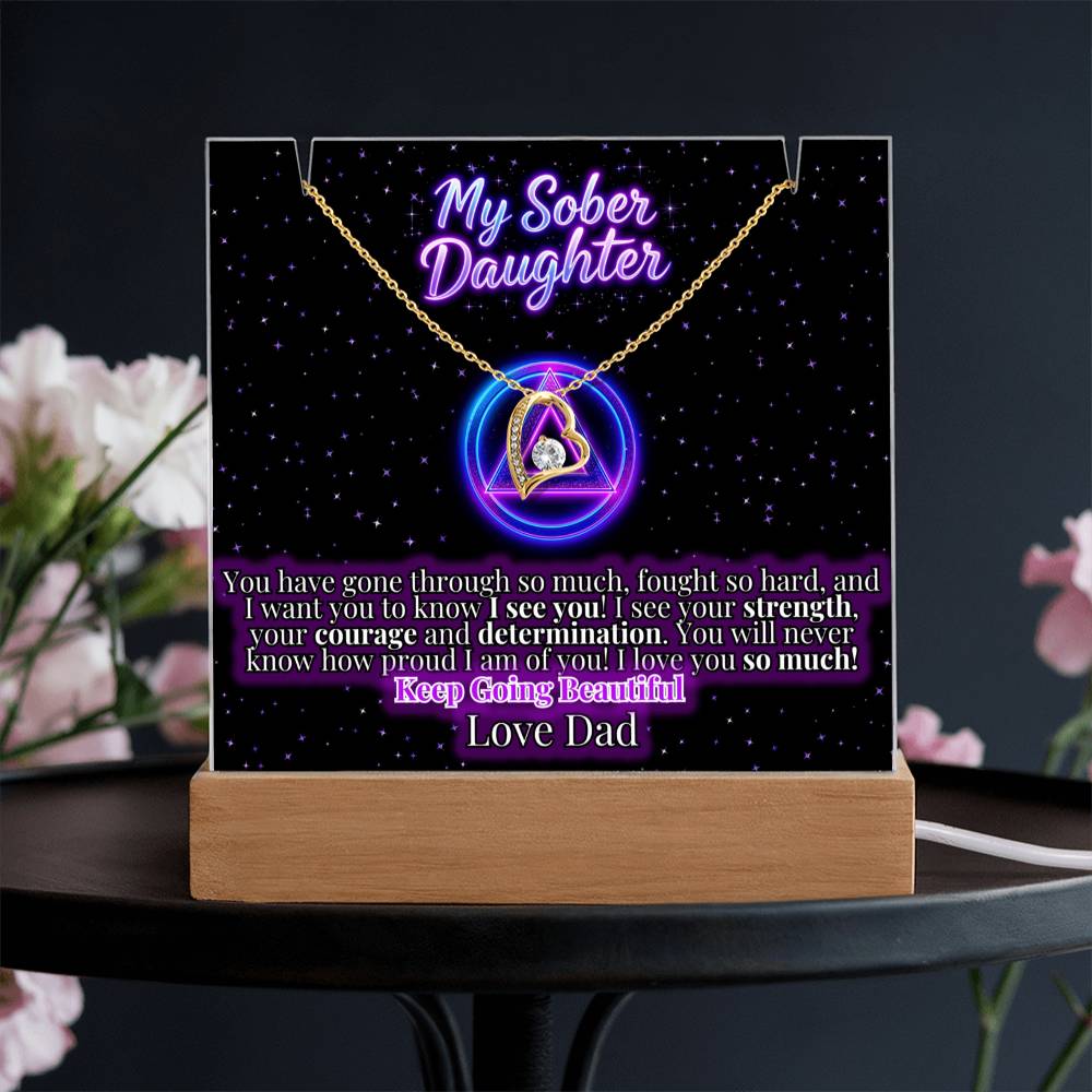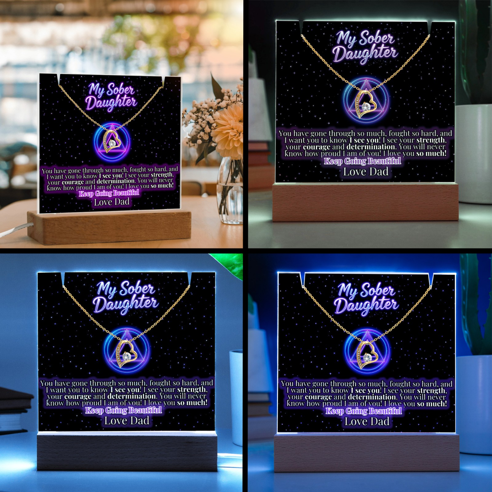 This heartfelt gift bundle honors the courage, determination, and progress of a loved one on their sobriety journey. The acrylic plaque features a bold, colorful design with vibrant LED lighting, displaying a powerful and emotional message of love and pride. Paired with the elegant Forever Love Necklace, this gift is a meaningful keepsake that inspires hope and celebrates milestones.