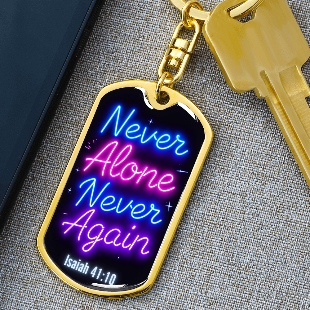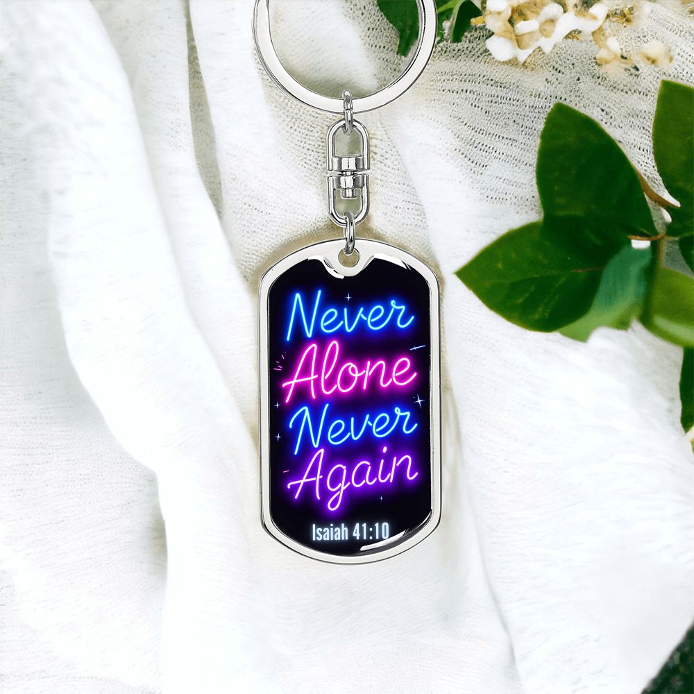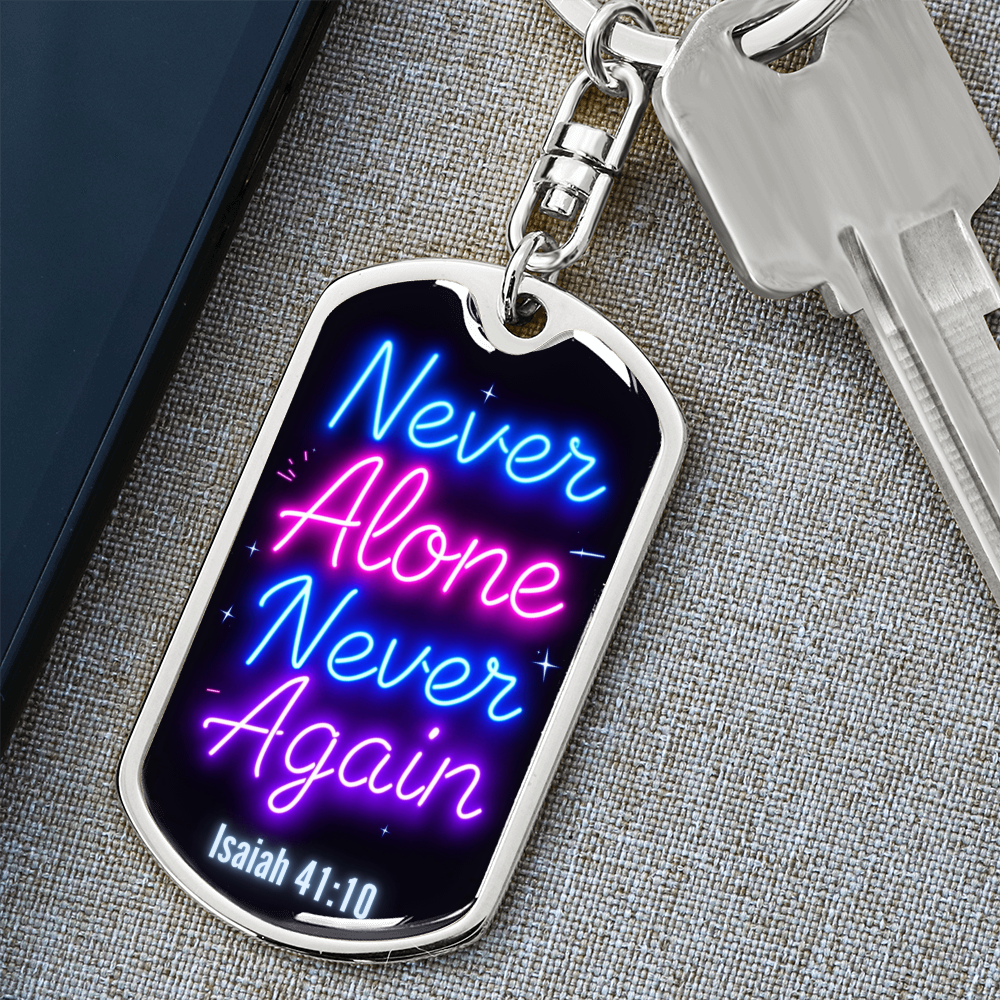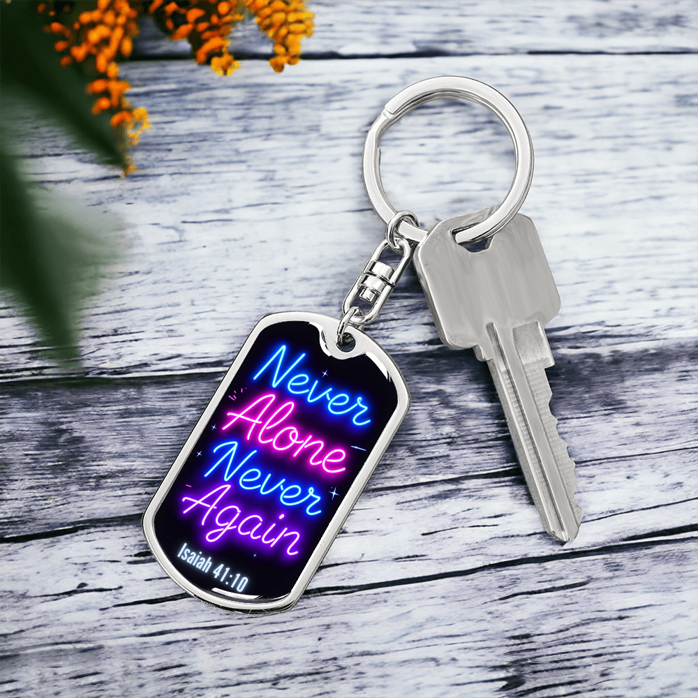 Carry a powerful message of faith and resilience wherever you go with this "Never Alone, Never Again" dog tag keychain. Inspired by Isaiah 41:10, this keychain serves as a bold reminder that you are never alone on your journey. Whether you're celebrating a recovery milestone or seeking daily encouragement, this keychain symbolizes strength, faith, and divine support.