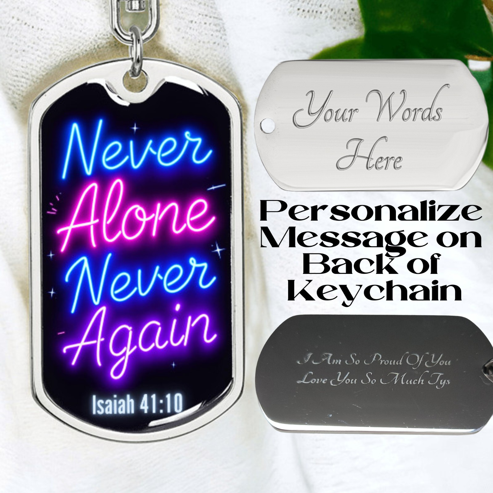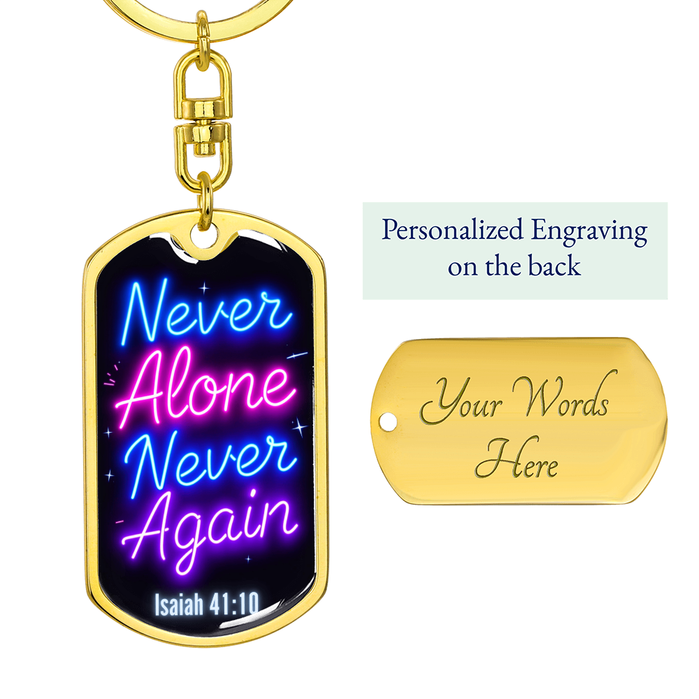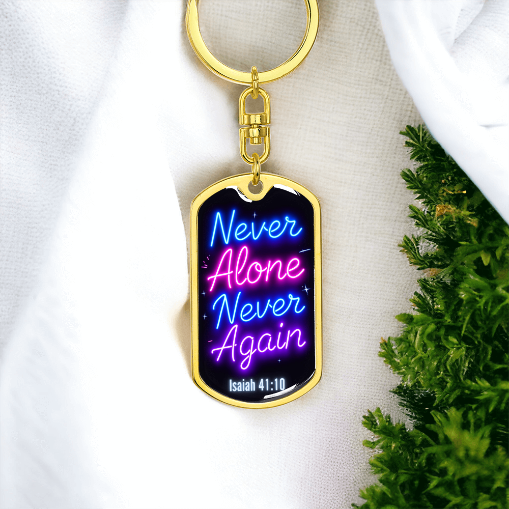 Carry a powerful message of faith and resilience wherever you go with this "Never Alone, Never Again" dog tag keychain. Inspired by Isaiah 41:10, this keychain serves as a bold reminder that you are never alone on your journey. Whether you're celebrating a recovery milestone or seeking daily encouragement, this keychain symbolizes strength, faith, and divine support.