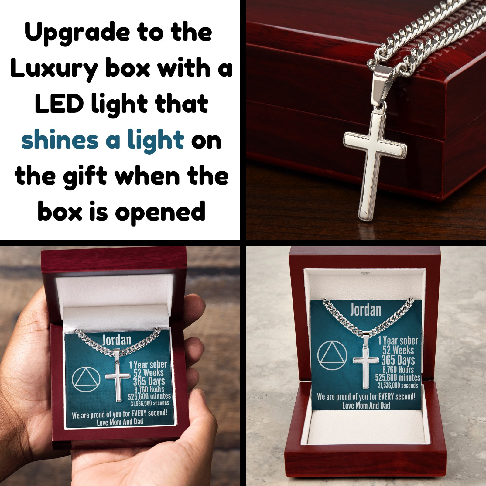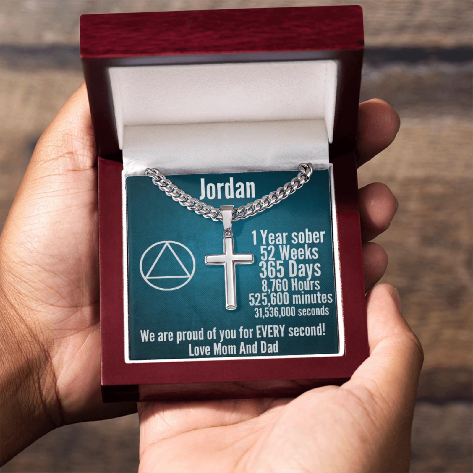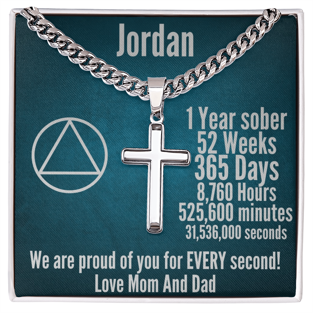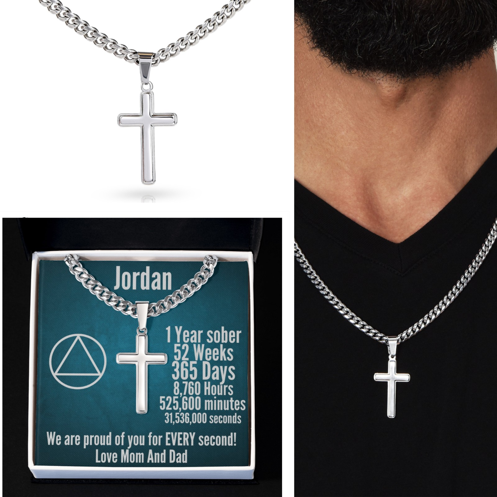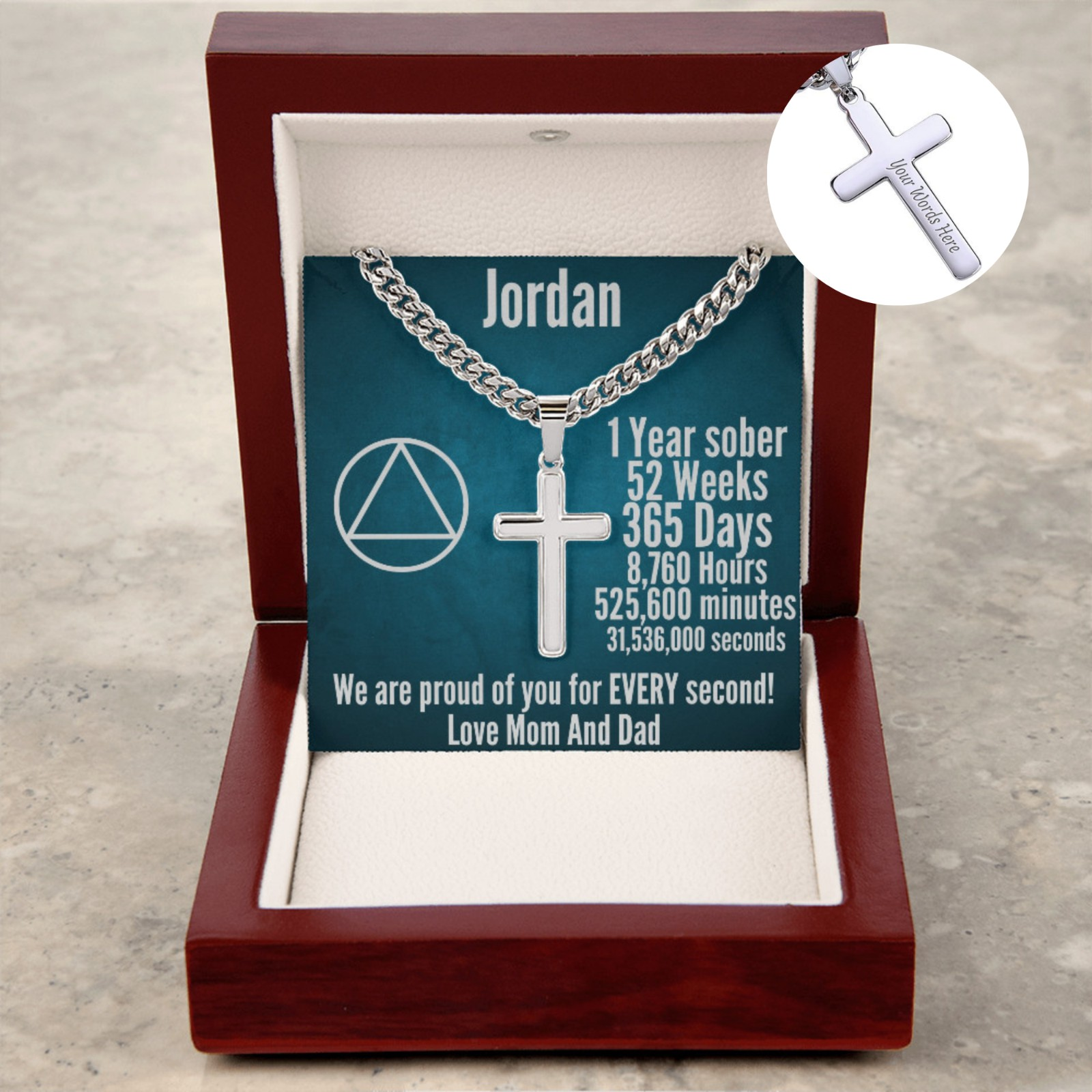 Designed to inspire and uplift, this necklace features a polished stainless steel cross pendant on a stylish Cuban link chain. The custom-engraved message serves as a daily reminder of progress and resilience. The heartfelt message card adds a deeply personal touch, making this an unforgettable gift for a loved one in recovery.