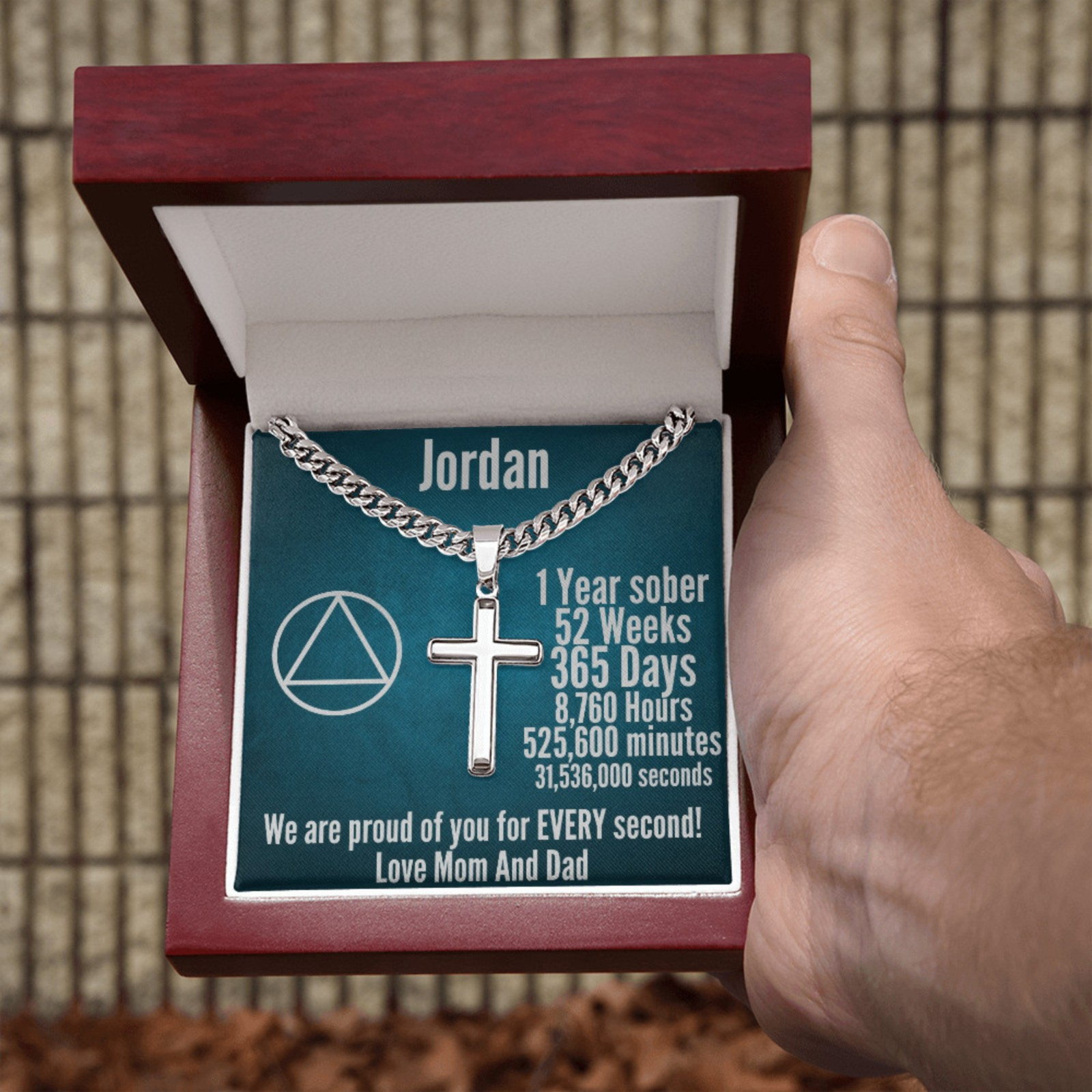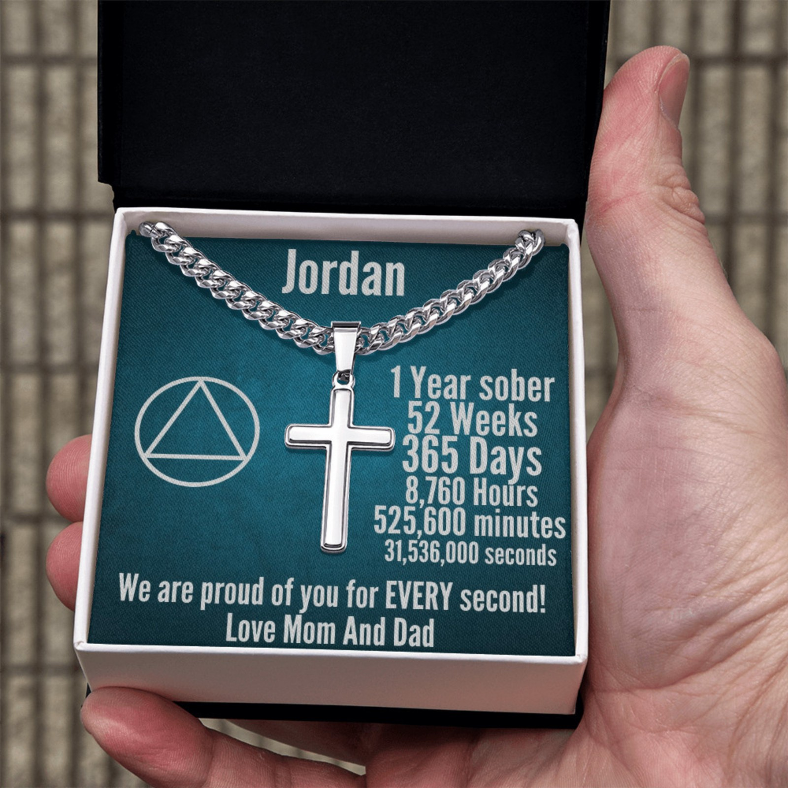 Mark an incredible milestone with a deeply meaningful keepsake. This Personalized Cuban Link Cross Necklace is a powerful symbol of faith, strength, and perseverance—perfect for celebrating sobriety, personal growth, and unwavering commitment. ✝️✨