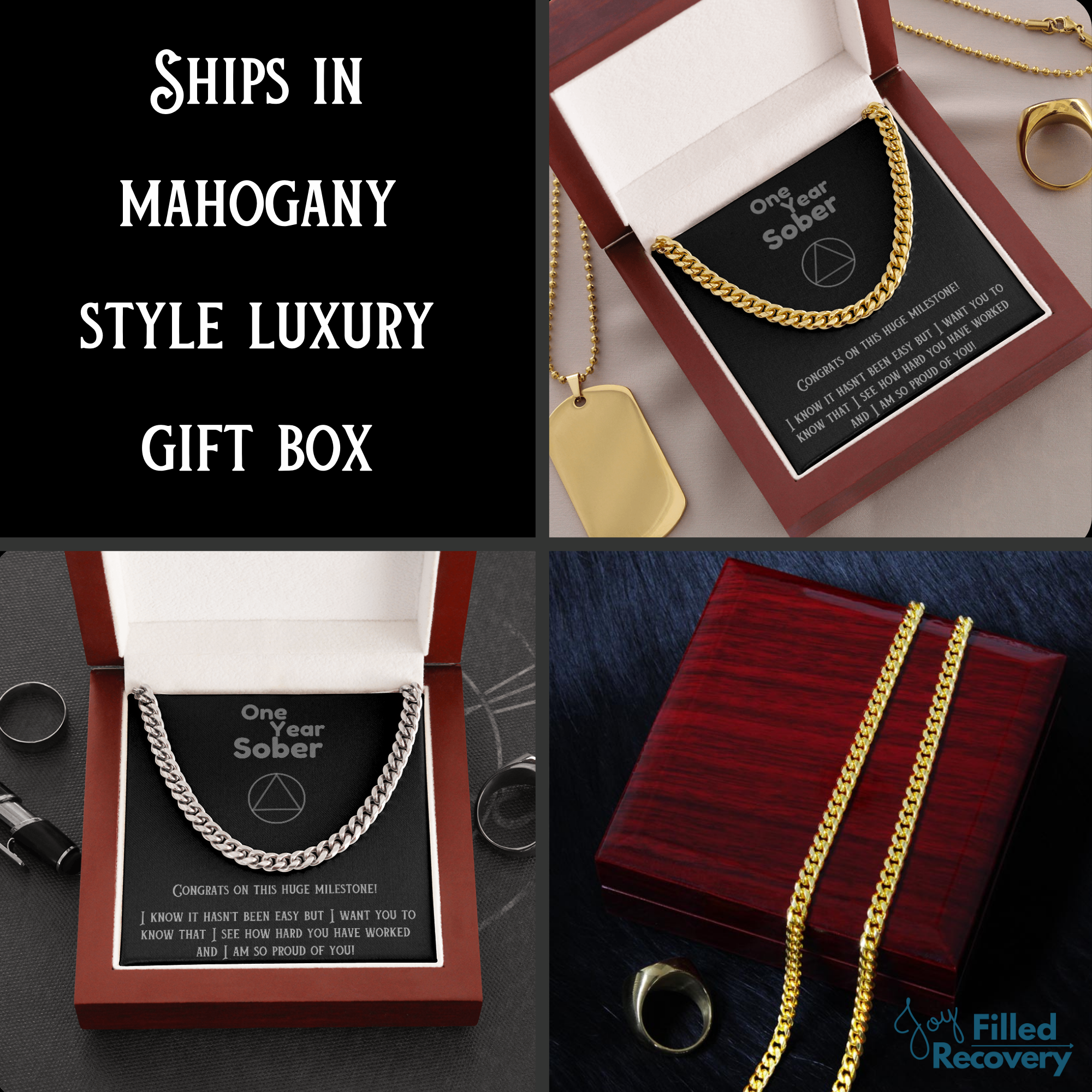 Perfect gift! The watch was amazing and the box that it came it was the perfect touch! Joy Filled Recovery helped me and worked with me through the issues I was having with the watch during the order process! Highly recommended