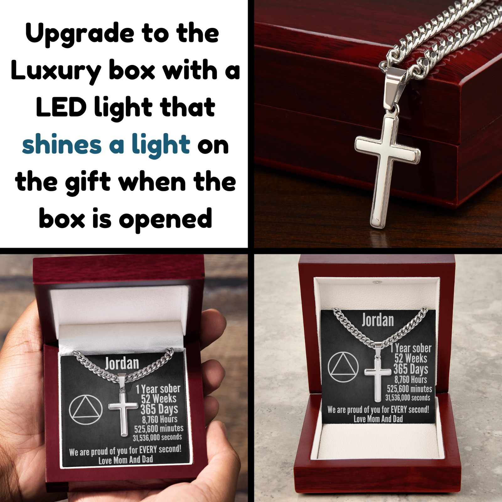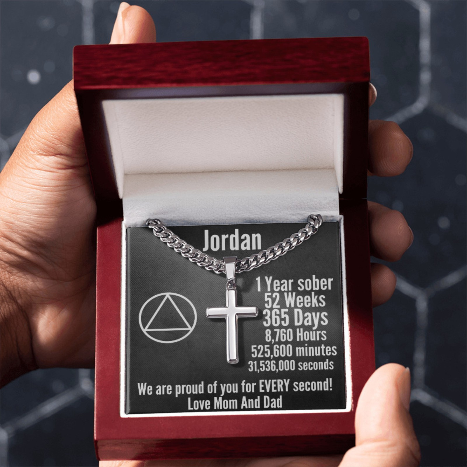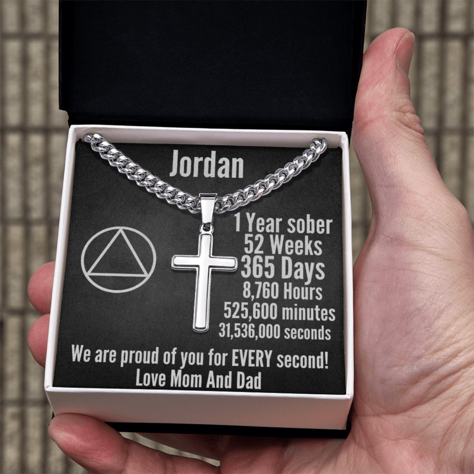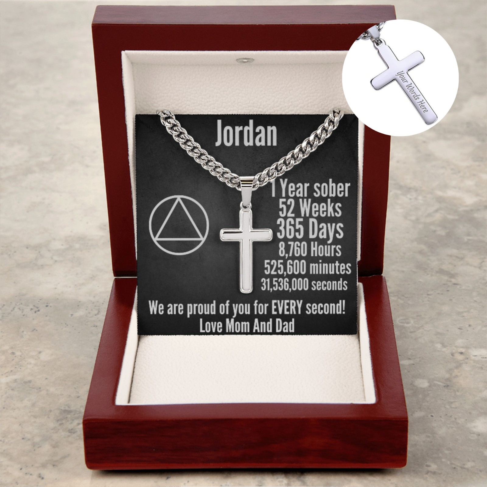 Designed to inspire and uplift, this necklace features a polished stainless steel cross pendant on a stylish Cuban link chain. The custom-engraved message serves as a daily reminder of progress and resilience. The heartfelt message card adds a deeply personal touch, making this an unforgettable gift for a loved one in recovery.