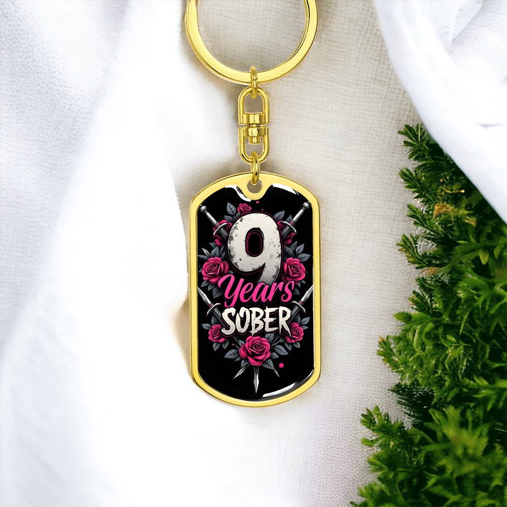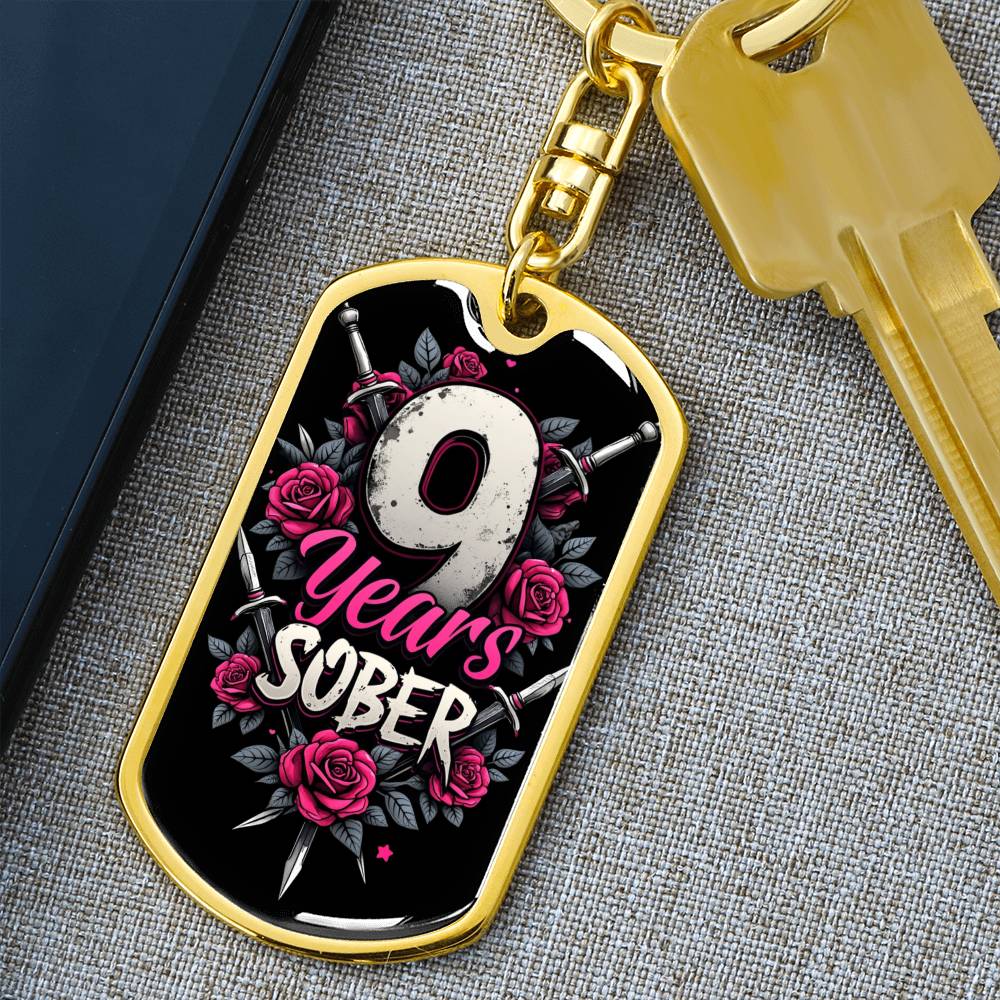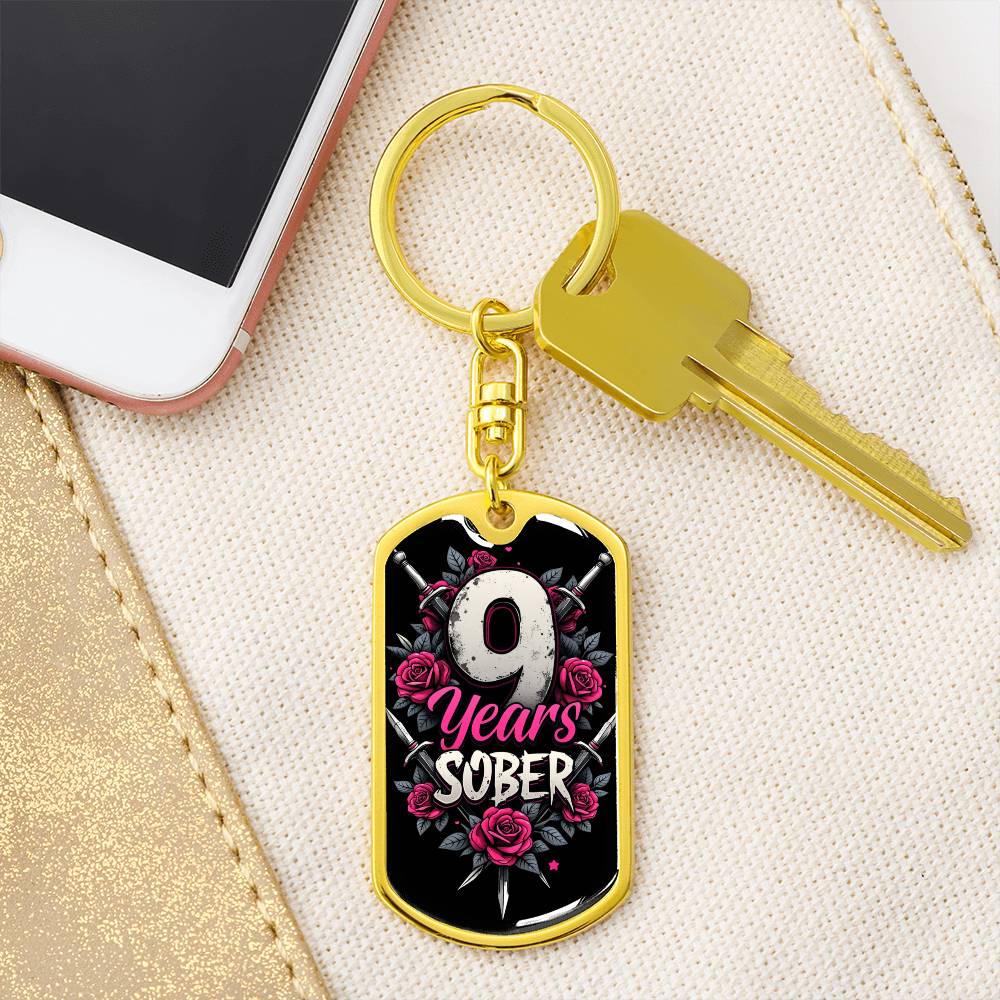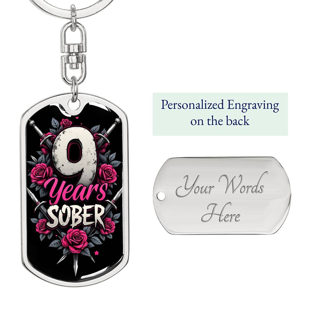 🔑 Front of the Keychain: Showcases "9 Years Sober" in a bold, rebellious font, with daggers symbolizing strength and protection, and roses symbolizing growth and new beginnings.