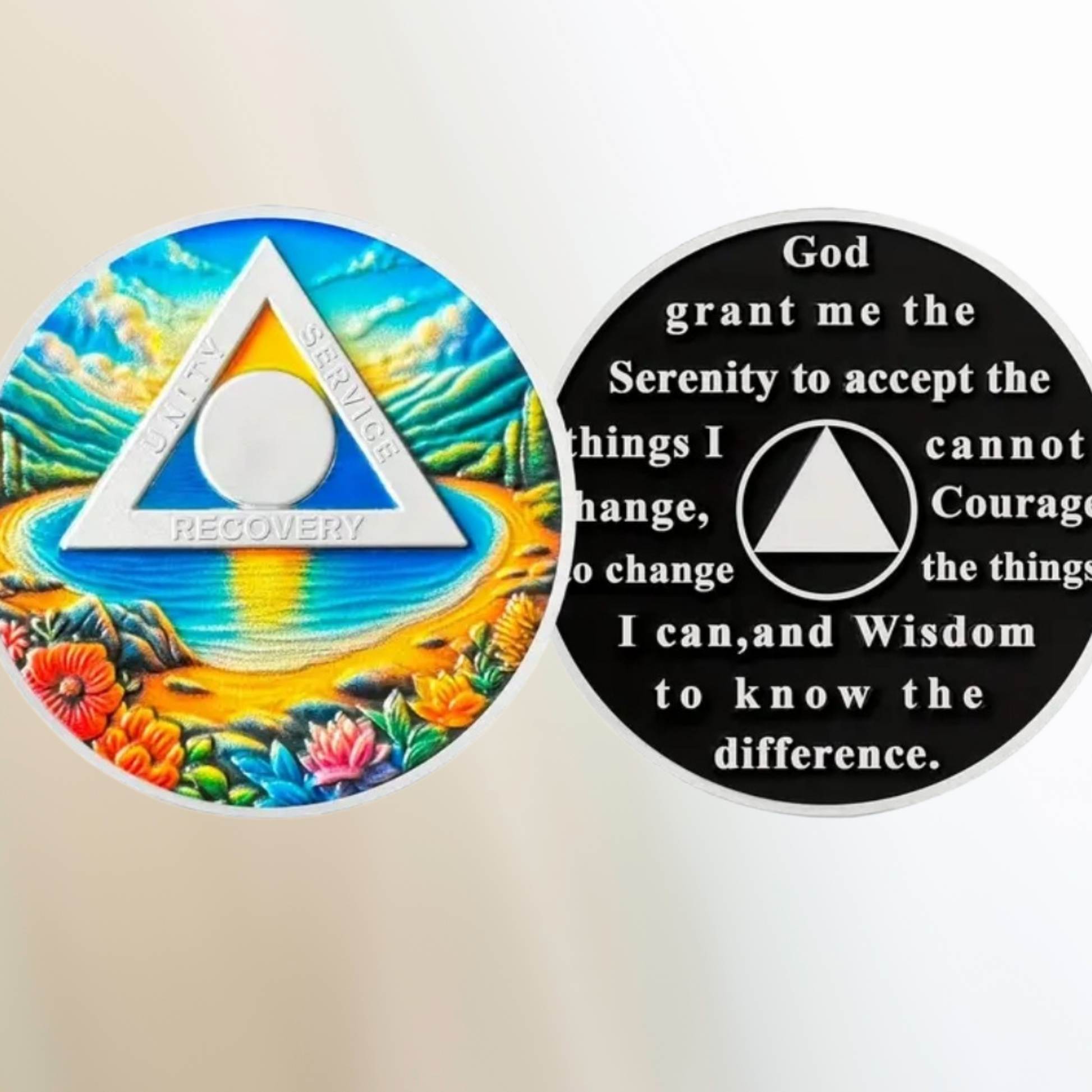 Sobriety coin: 1.375″, detailed beach sunset design.