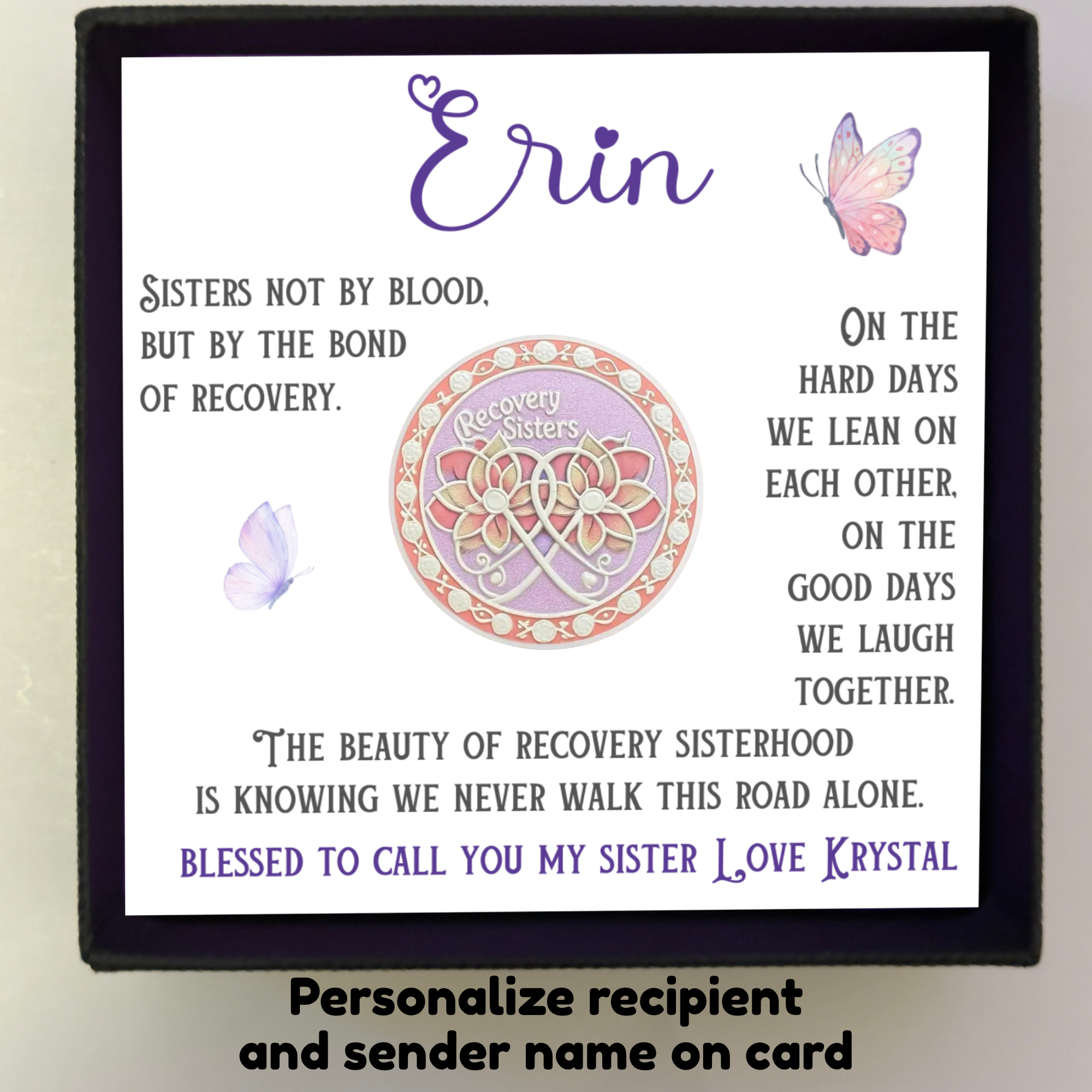 This beautiful set includes a Recovery Sisters coin and a customizable message card, perfect for showing love and encouragement to someone walking the recovery journey beside you. The message card features uplifting words about the strength of sisterhood, while the coin serves as a lasting symbol of unity and support.