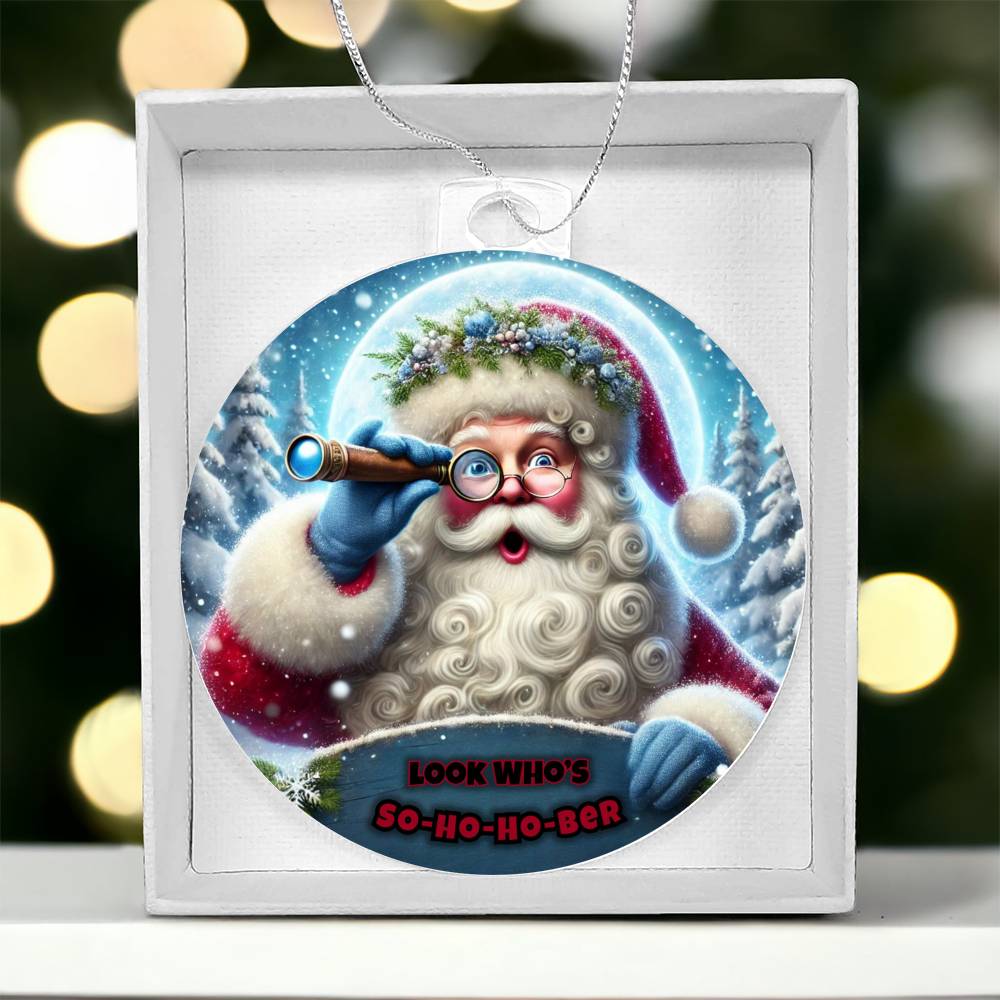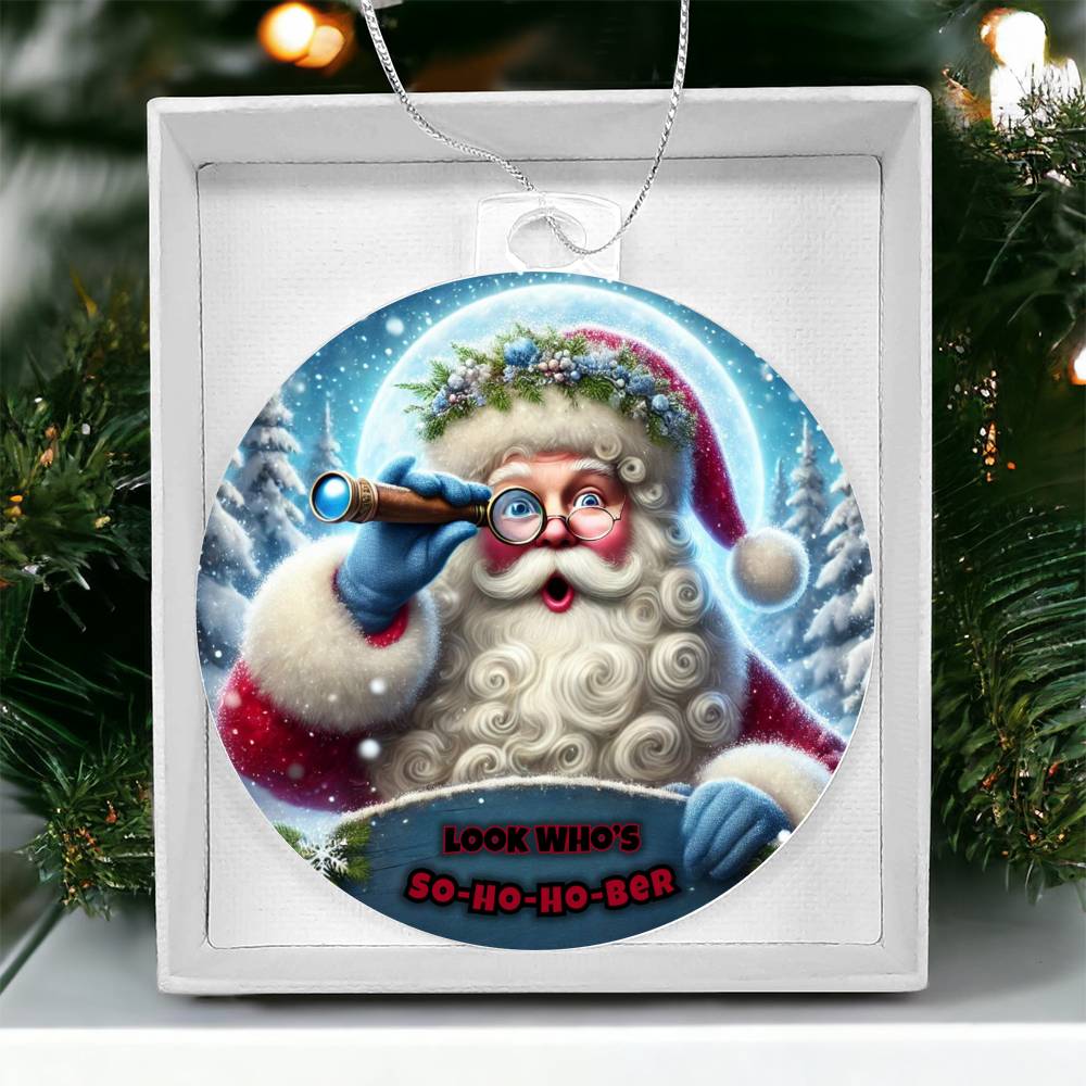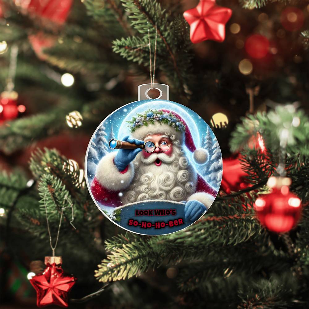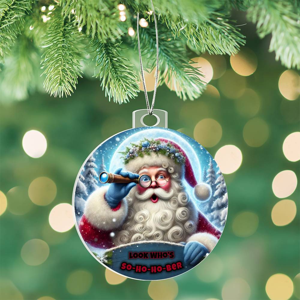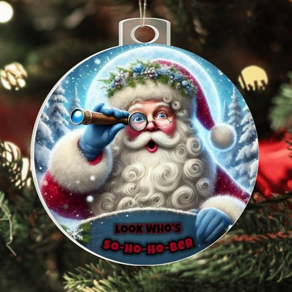 Vibrant and Festive Design: Featuring a cheerful Santa with a telescope, ready to spot those embracing sobriety this season. The playful So-Ho-Ho-Ber message adds a touch of humor and encouragement, making this ornament a perfect keepsake for yourself or a loved one in recovery.