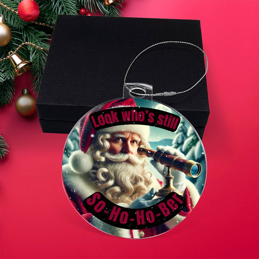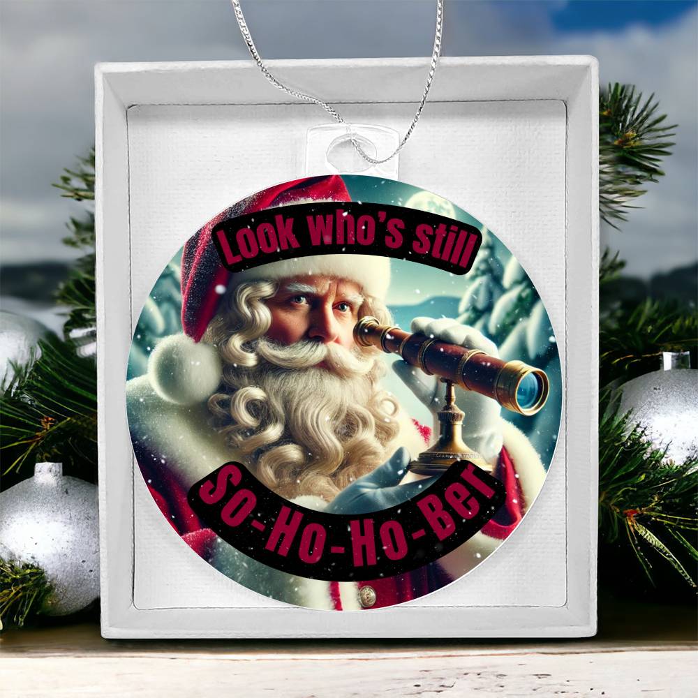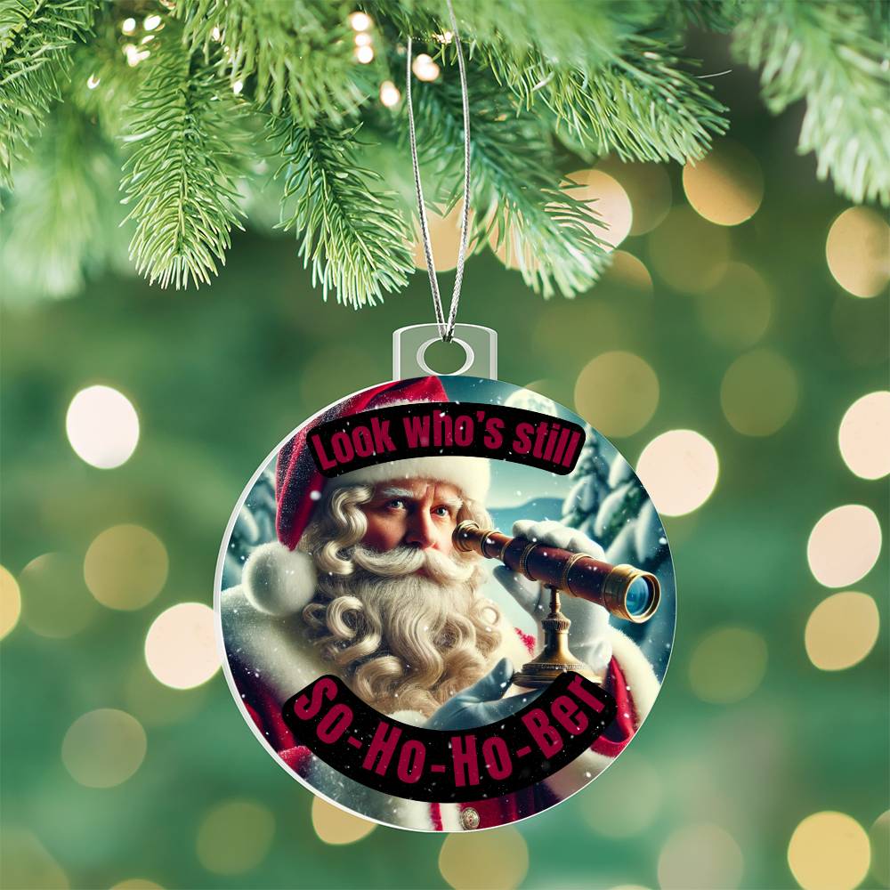 Crafted from premium acrylic, this ornament showcases a humorous and vibrant print of Santa with the words "Look Who’s Still So-Ho-Ho-Ber," symbolizing both resilience and holiday cheer. This playful design is perfect for celebrating the continued journey in recovery and is sure to be a treasured reminder on the tree.