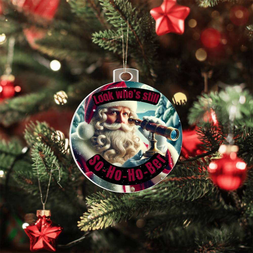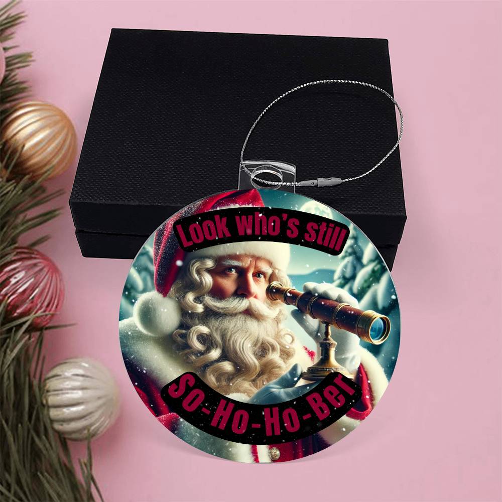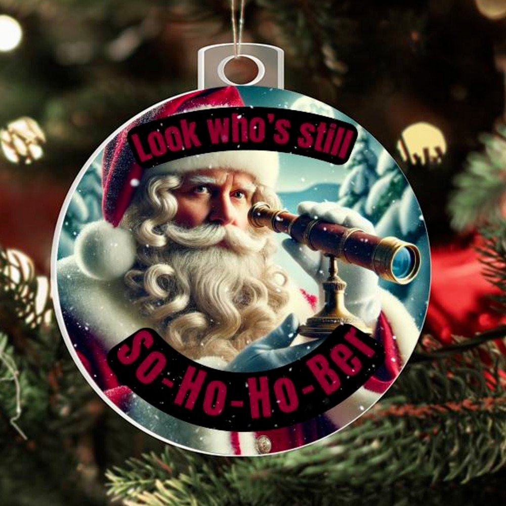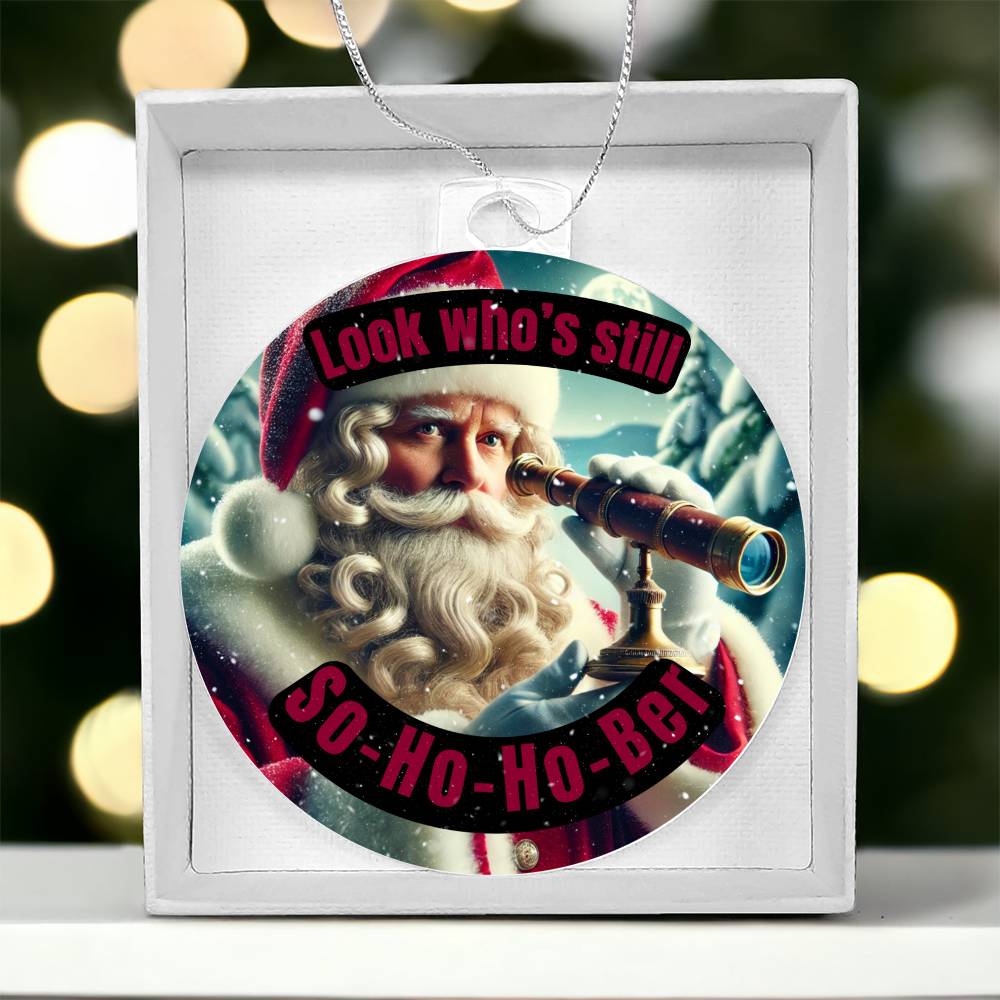 Crafted from premium acrylic, this ornament showcases a humorous and vibrant print of Santa with the words "Look Who’s Still So-Ho-Ho-Ber," symbolizing both resilience and holiday cheer. This playful design is perfect for celebrating the continued journey in recovery and is sure to be a treasured reminder on the tree.