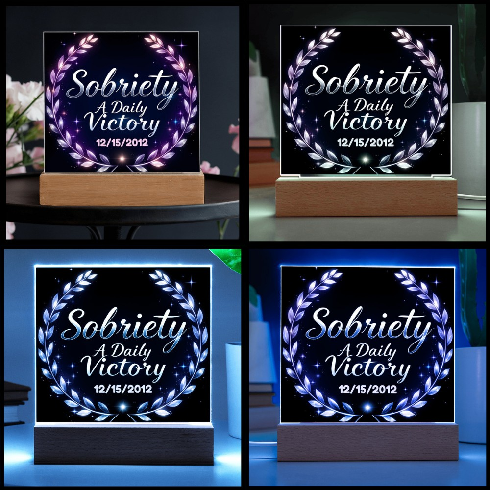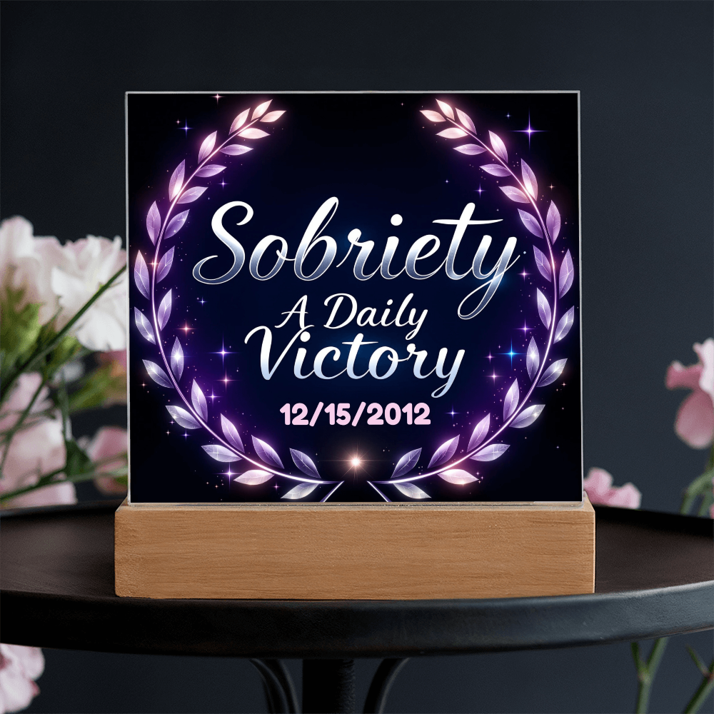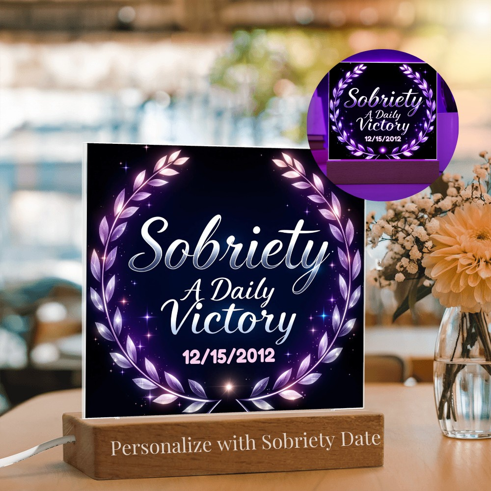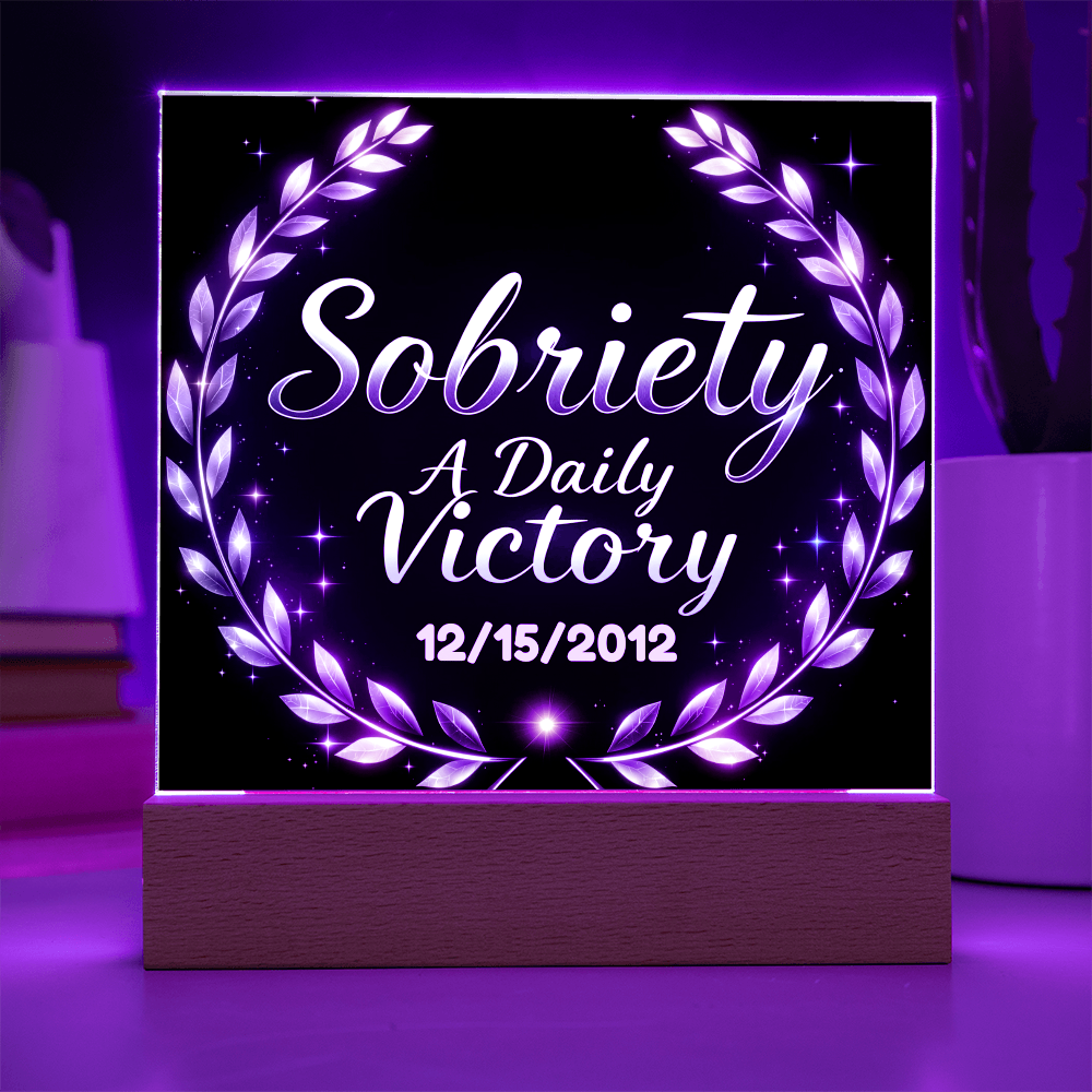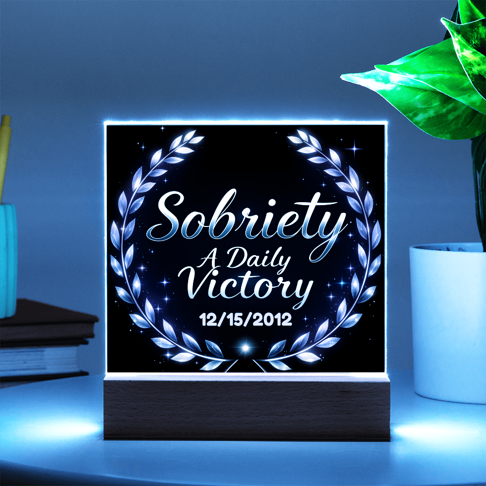 ✨ This premium acrylic LED plaque is a heartfelt way to honor the journey of recovery and resilience. Featuring the inspiring message "Sobriety – A Daily Victory" with a customizable date at the bottom, the design is elegantly surrounded by a shimmering laurel wreath and radiant star accents.