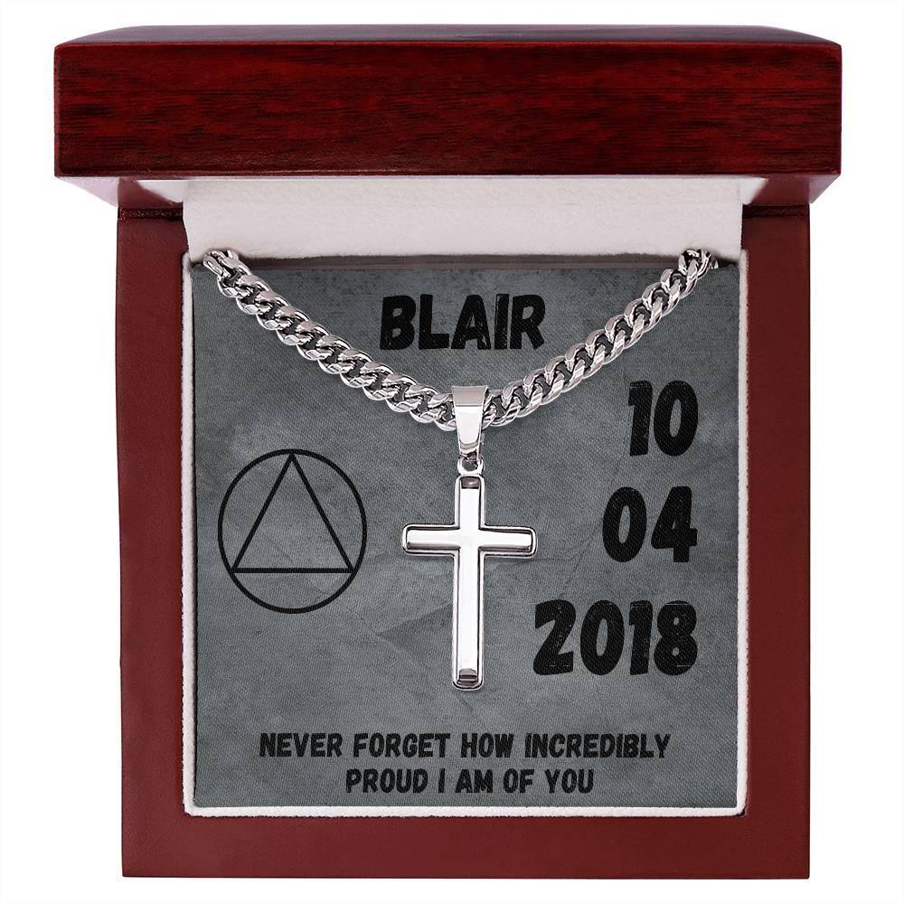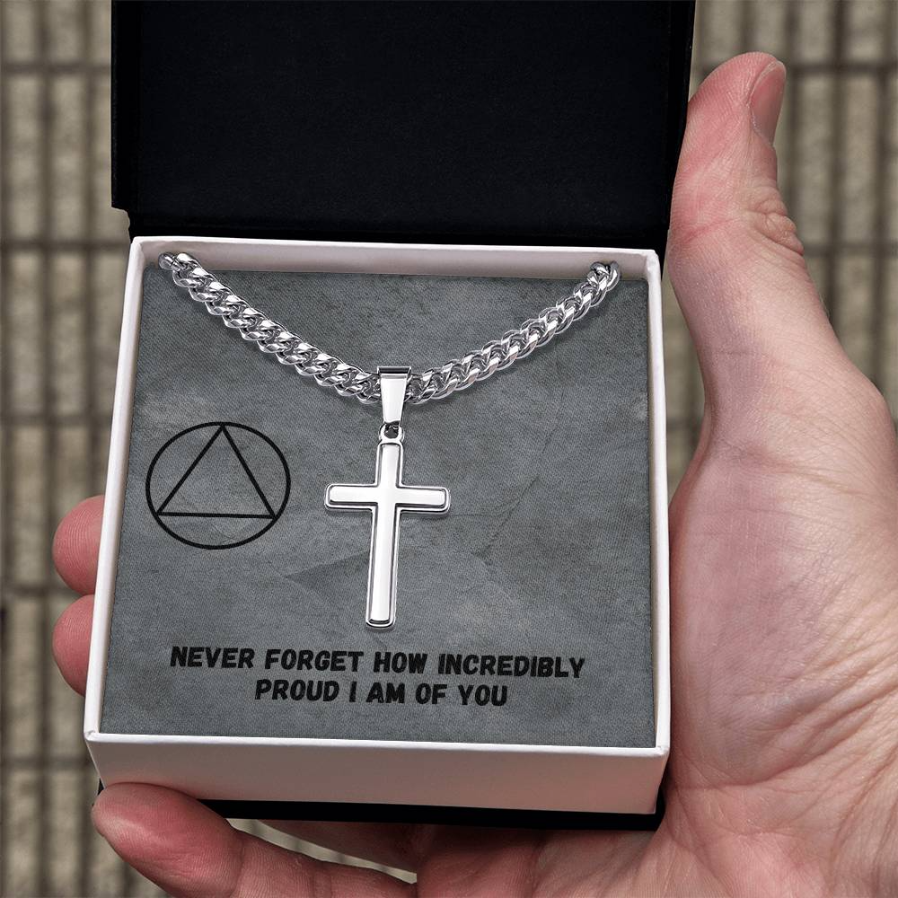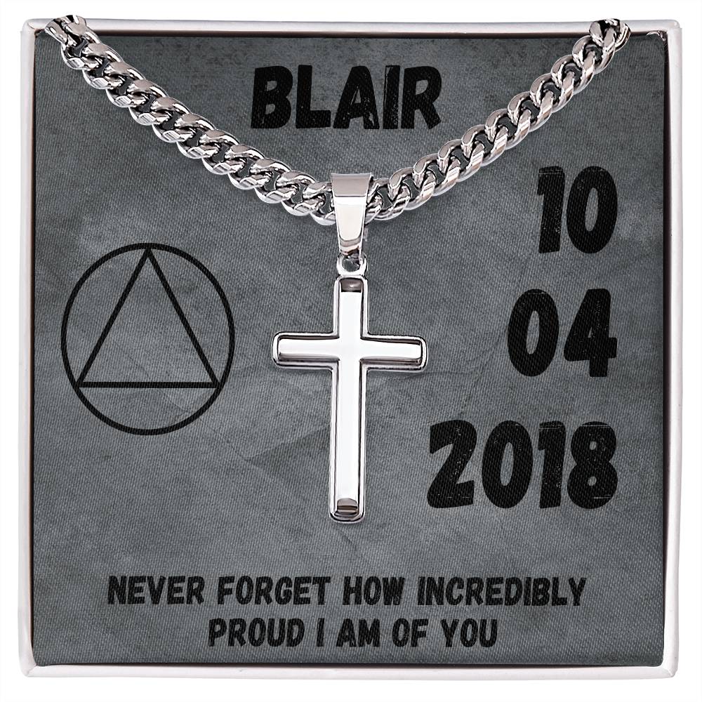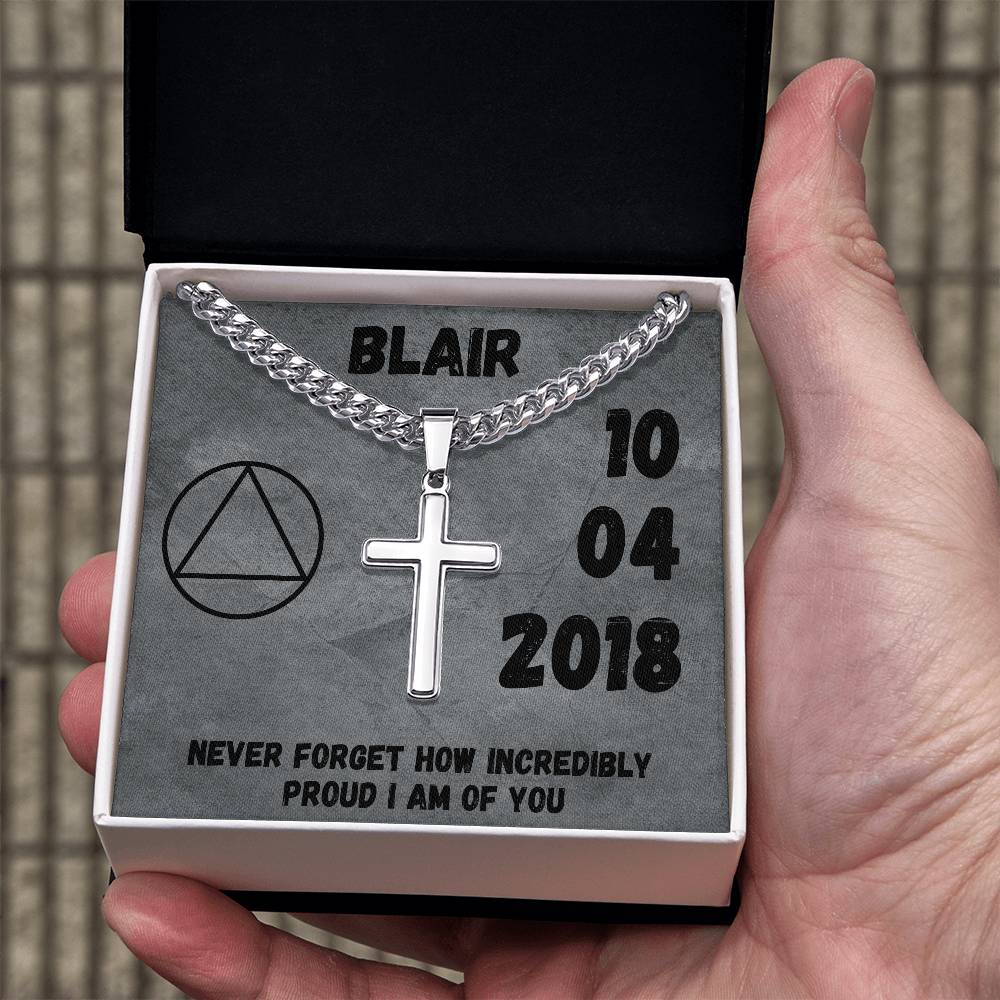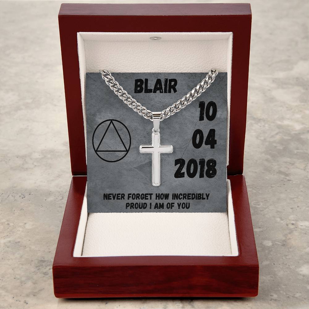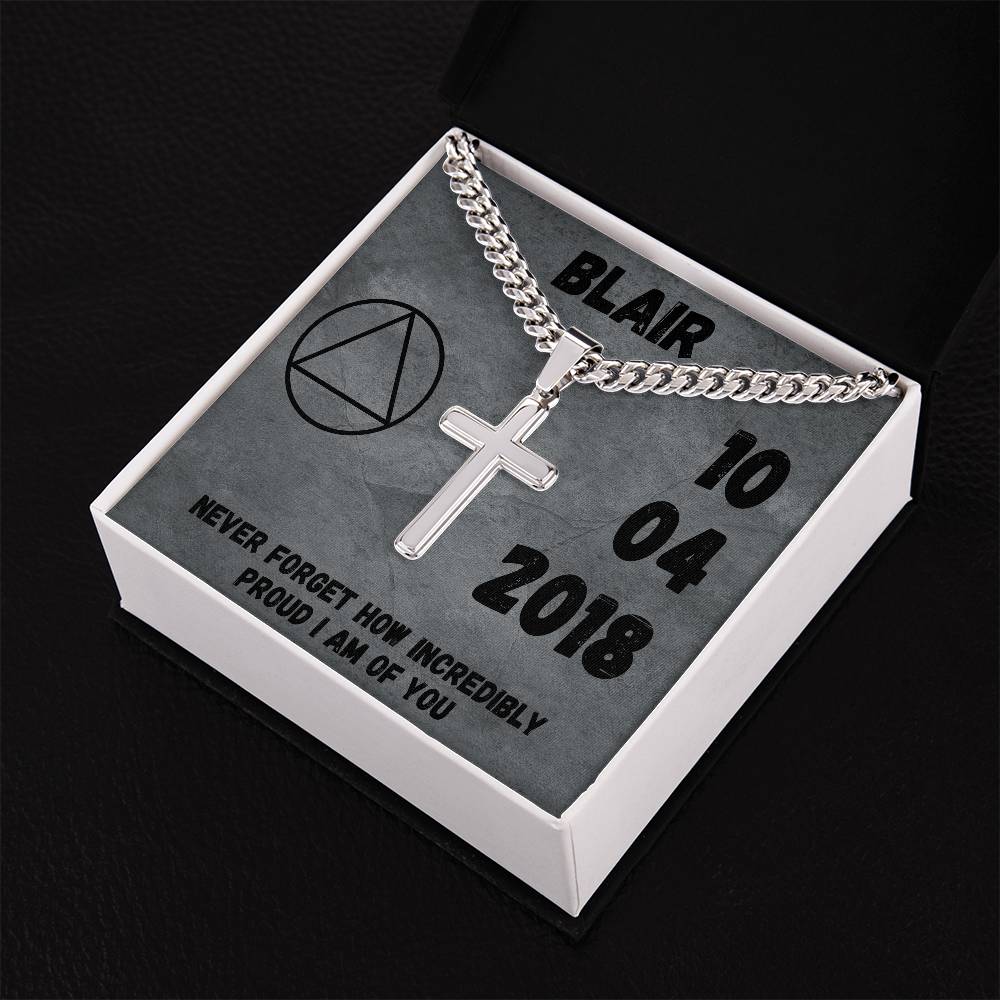 Customize the cross with his sobriety date, loving message or scripture that you want to keep close to his heart.