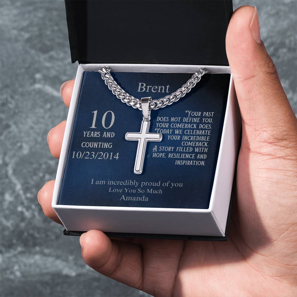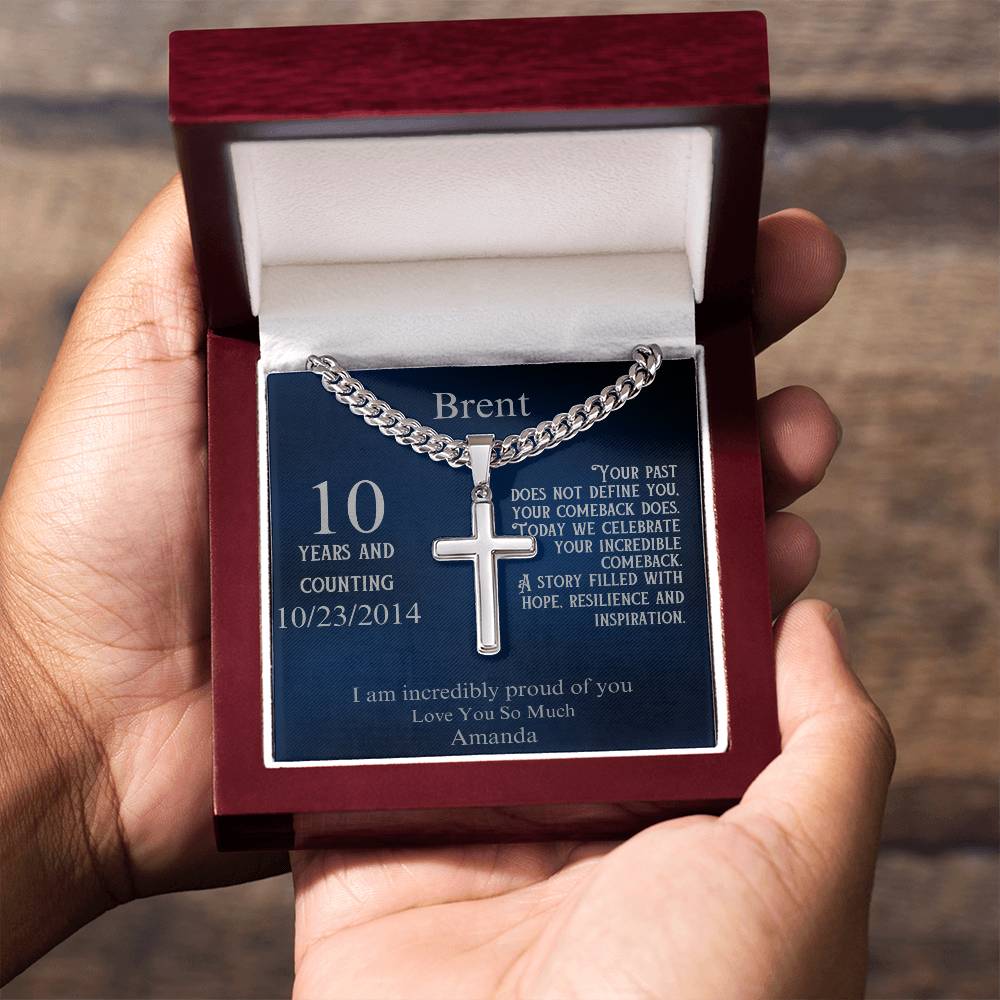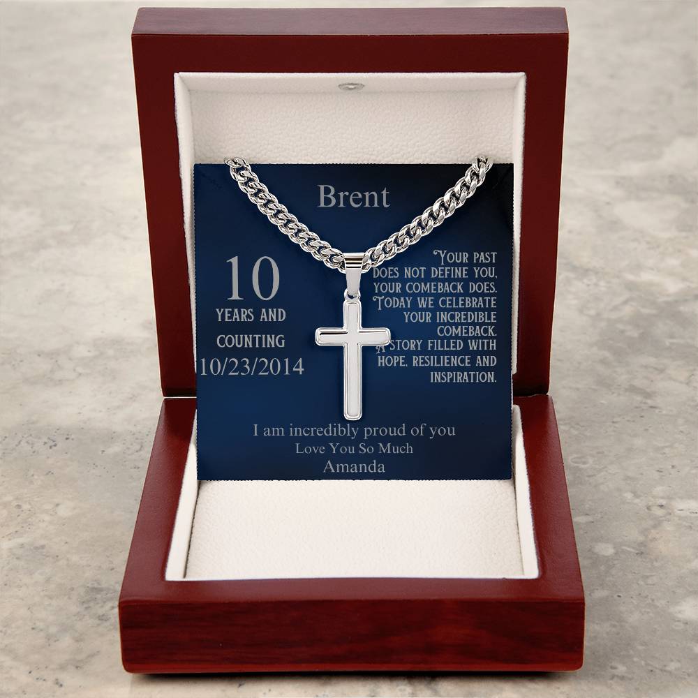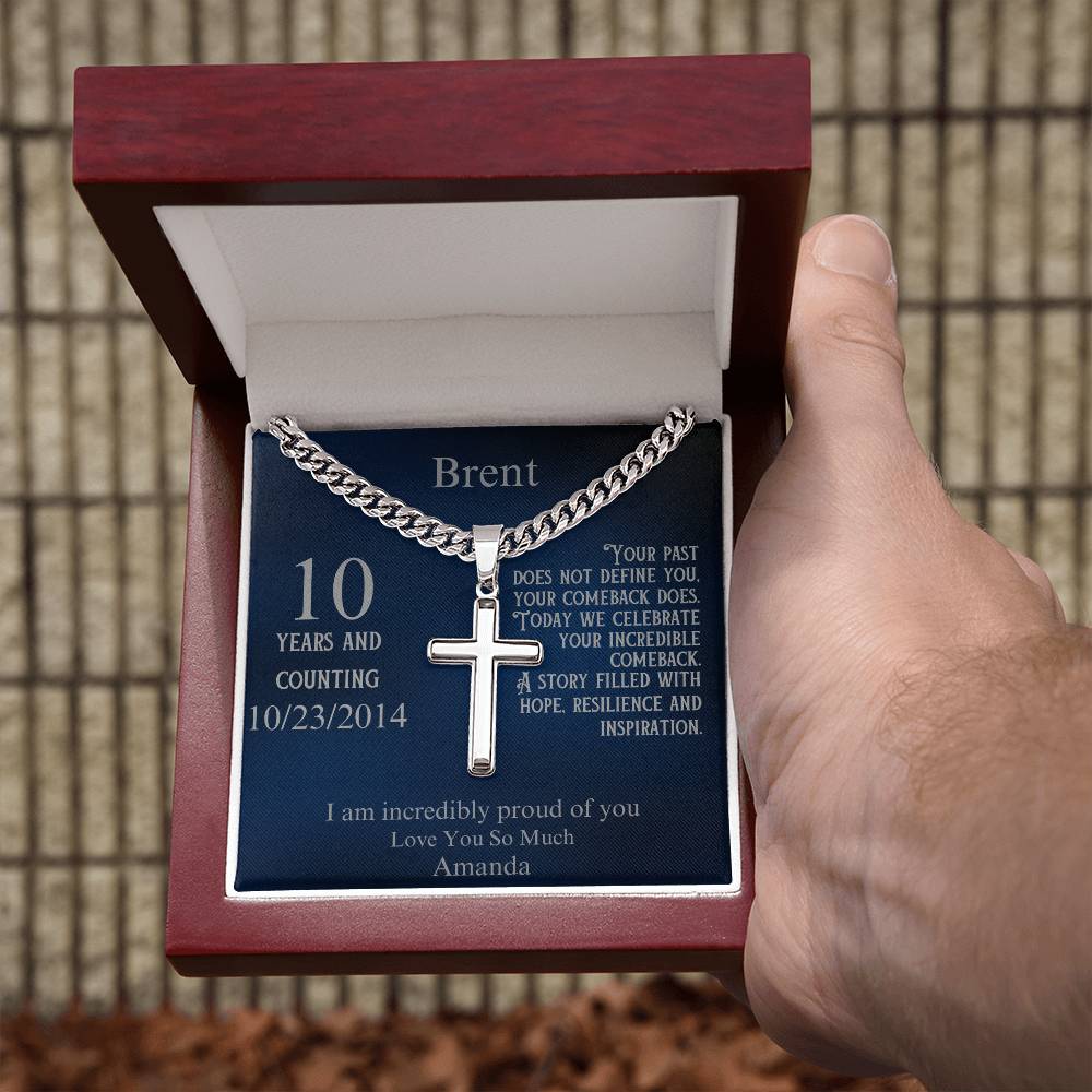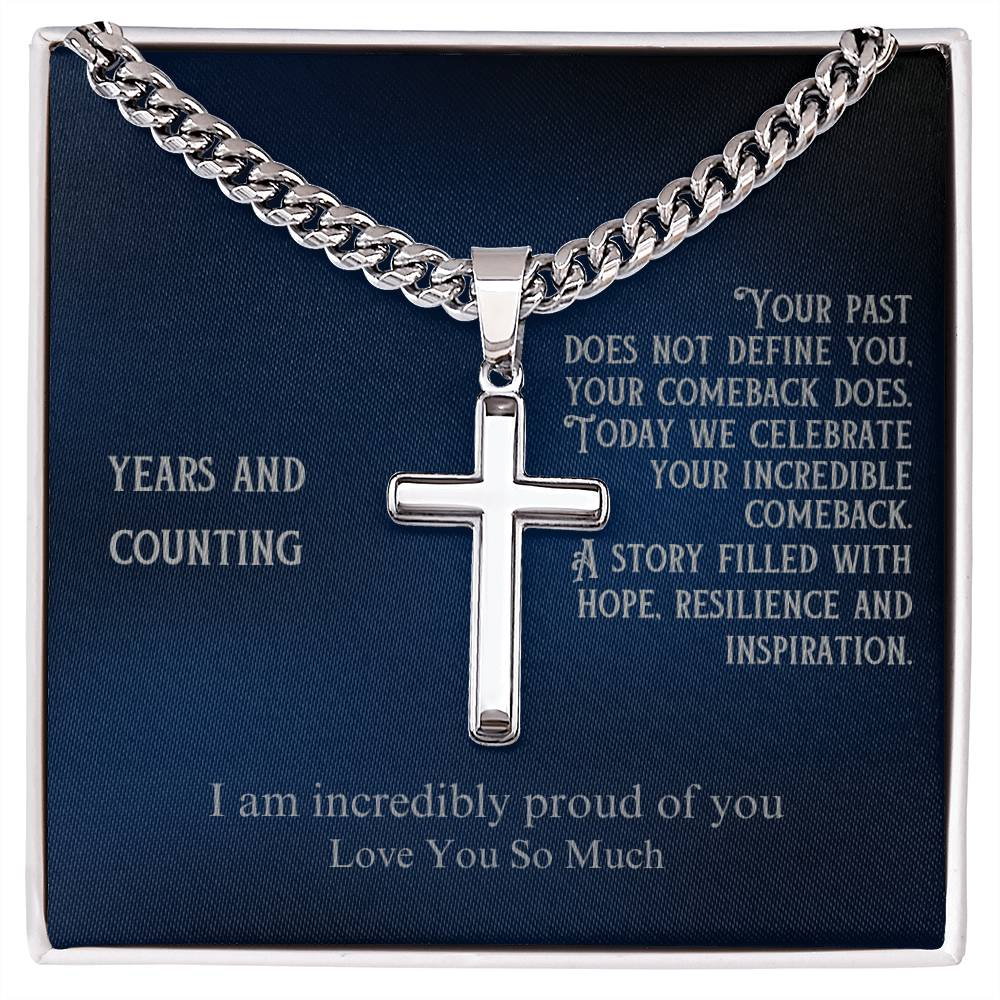 The elegant cross pendant is paired with a fully customizable message card. Personalize the recipient's name, their sobriety milestone, a special date, and your heartfelt message. Whether it’s their first year sober or a decade of triumph, this necklace speaks to the power of their comeback and the hope they inspire in others.