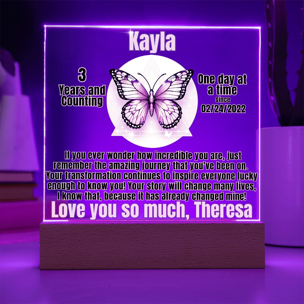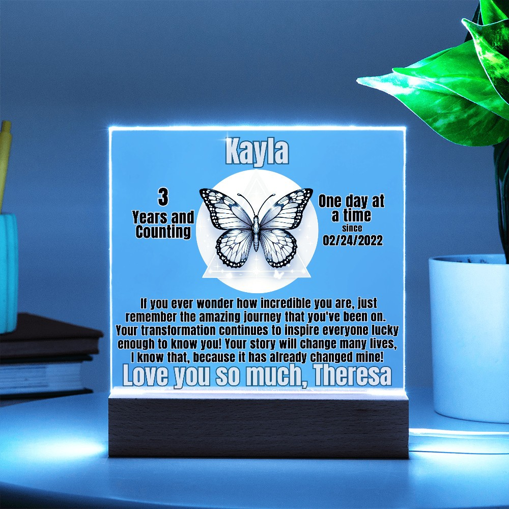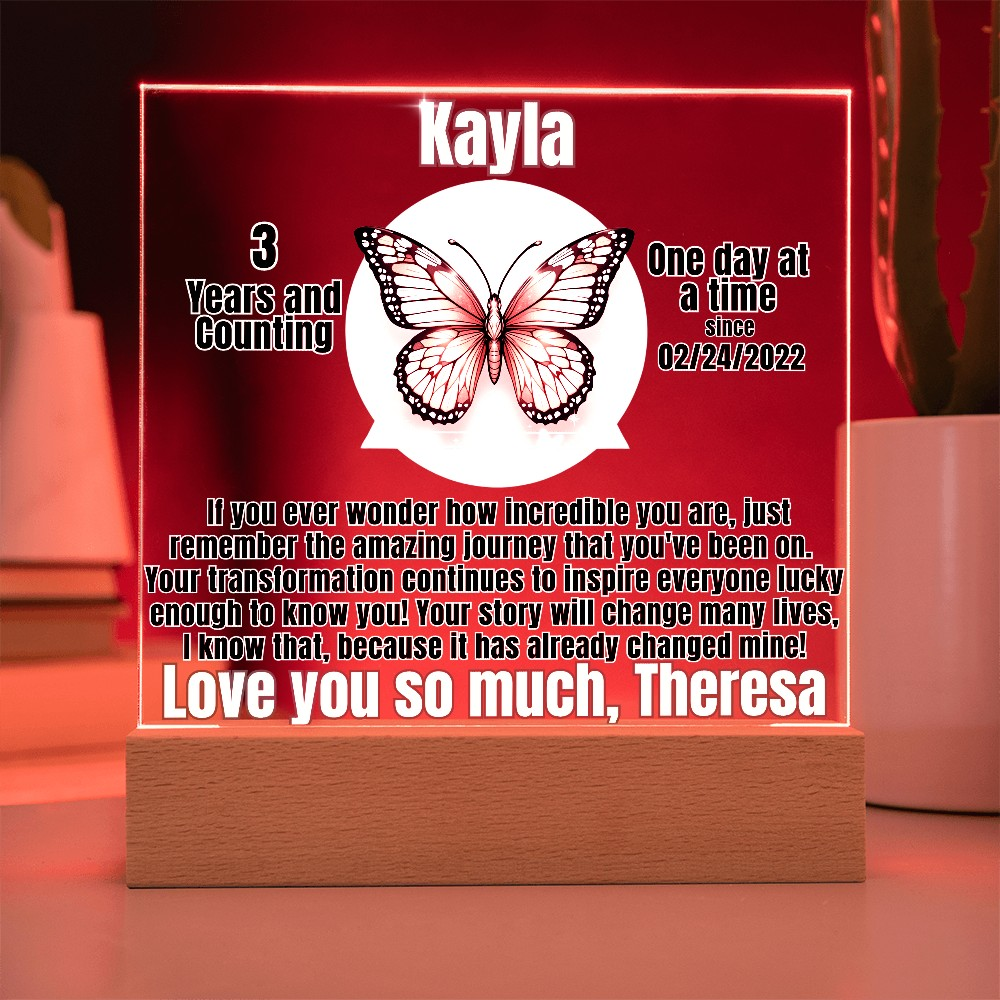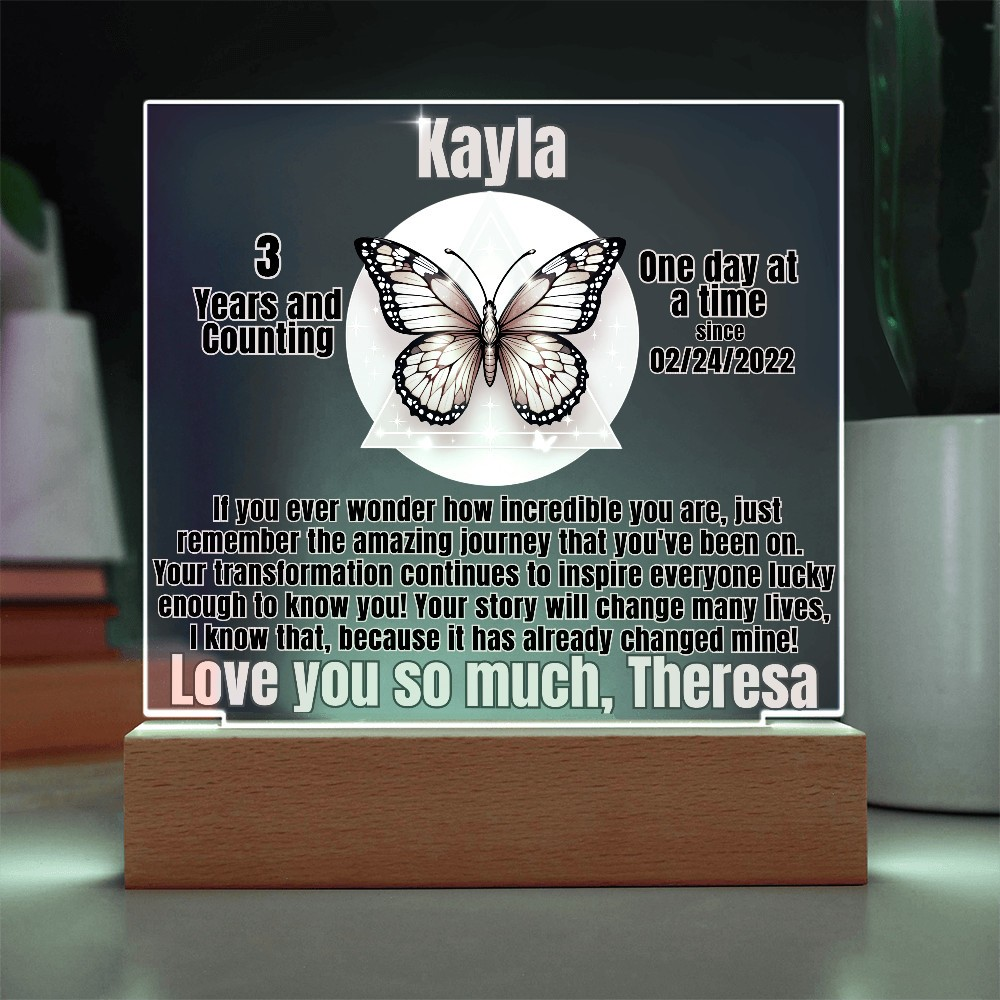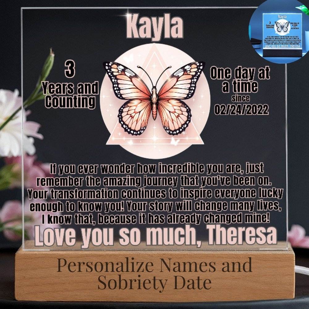 This elegant plaque features a stunning butterfly illustration, symbolizing transformation and hope, surrounded by a soft geometric design. The text is displayed in bold and delicate fonts, making it a unique and heartfelt tribute to personal progress.